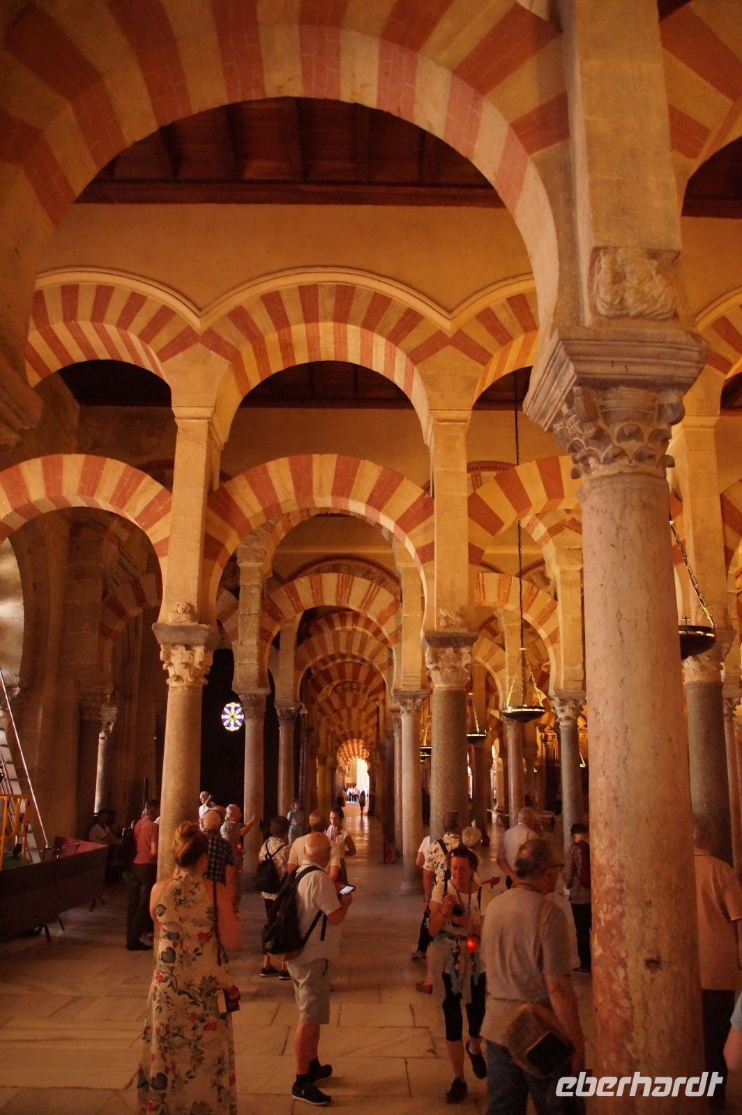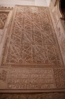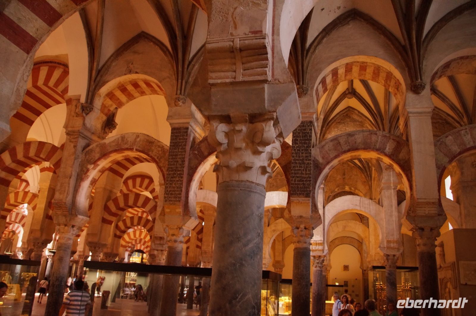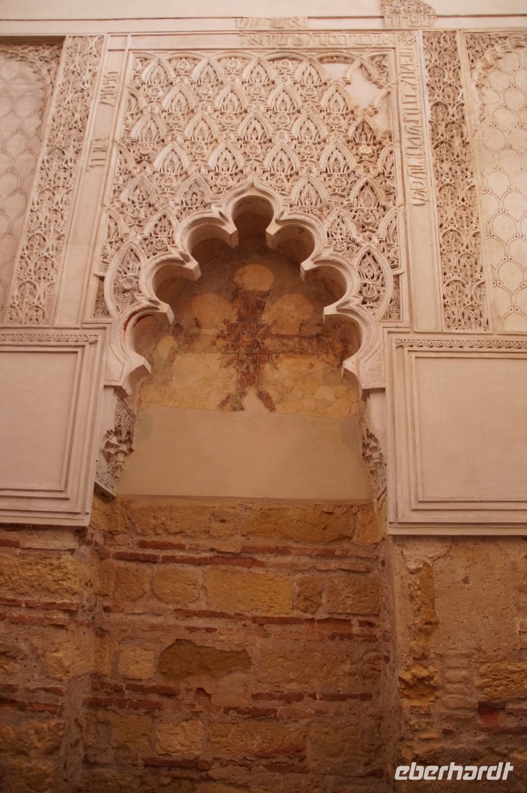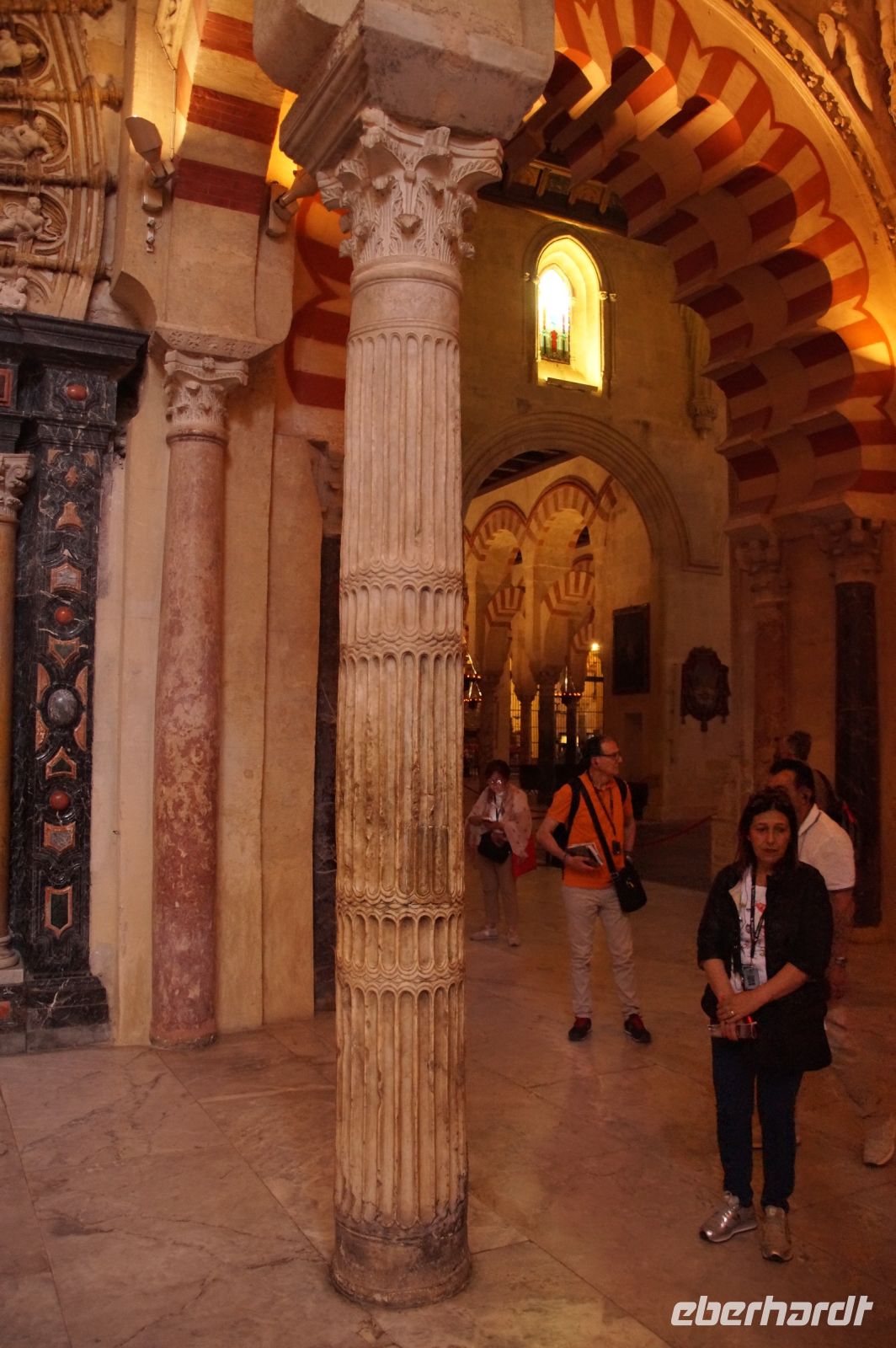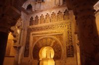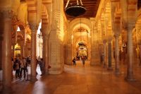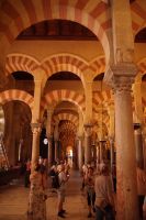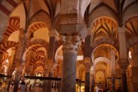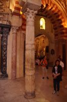 Die Araber hatten zunächst die Vinzentskirche für ihr Freitagsgebet genutzt, kauften der christlichen Gemeinde die Kirche aber schließlich ab und errichteten die Moschee. Zunächst mit Säulen, die sie aus unterschiedlichen Bauten recycelten, weshalb manche Säulen im Boden verschwinden, andere auf extra hohen Podesten stehen. Dann wurde die Moschee in Richtung des Flusses erweitert (diesmal mit extra für sie angefertigten Säulen und in kalifaler Zeit noch ein weiteres Mal in Richtung des Flusses erweitert. Aus dieser Zeit stammen der von byzantinischen Handwerkern - der Basileos von Byzanz und der Kalif von Córdoba kamen sich gegenseitig nicht ins Gehege, hatten aber gemeinsame Feinde - gestaltete Mi-h-râb sowie die Eingänge zur Schatzkammer und der Durchgang zum Kalifenpalast. Eine vierte Erweiterung konnte nicht mehr in Richtung ds Flusses gemacht werden, das Gelände wurde zu abschüssig und die Stadtmauer war auch nicht mehr weit, der Großwesir plante sie daher nach Norden. Anstelle des stetigen Wechsels von Kalkstein und Ziegeln, wie in den vorherigen Teilen der Moschee, wurden die Doppelbögen hier nur mit Kalkstein gebaut und die Ziegelteile durch entsprechende Anstriche simuliert. Nun ist der Wechsel von Kalkstein und Ziegel aber nicht nur schmuck, sondern angeblich auch besonders elastisch im Falle eines Erdbebens. Im vom Großwesir gebauten Teil der Moschee ist man diesem Problem damit begegnet, dass man unscheibare Bleischeiben zwischen Säule und Kapitell gelegt hat.