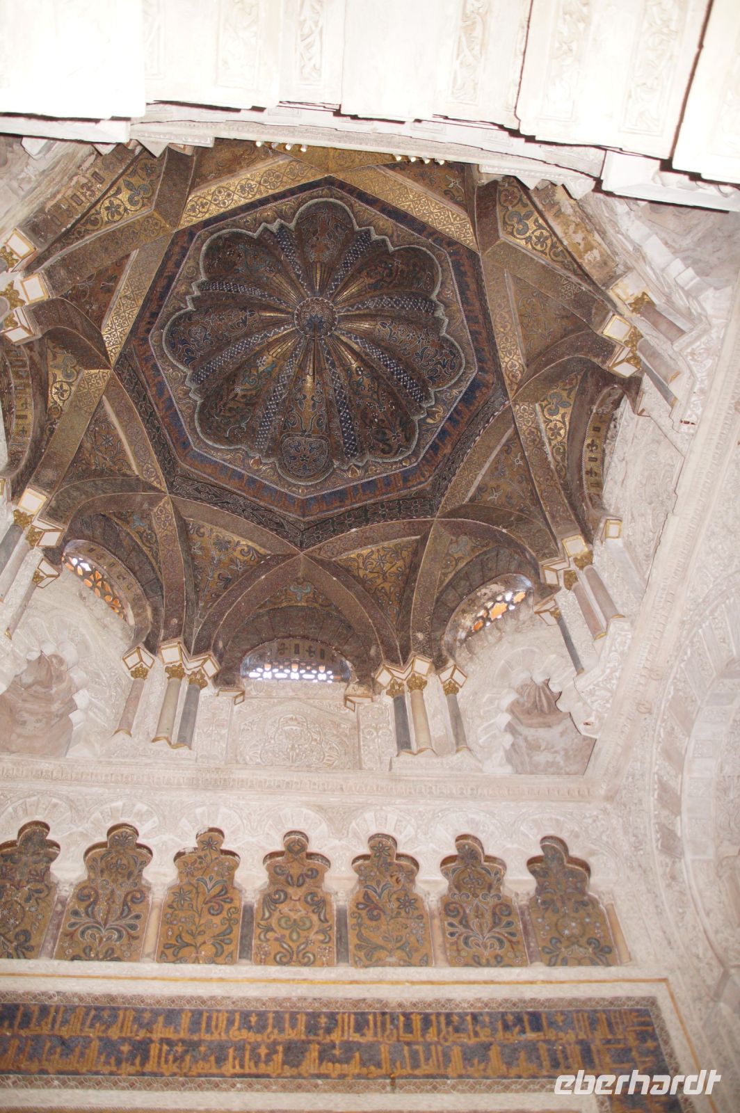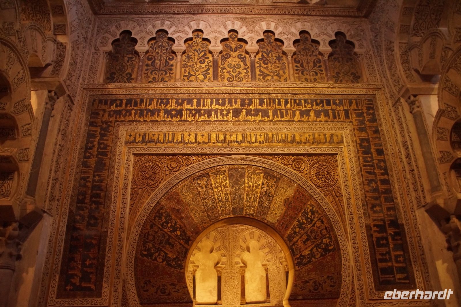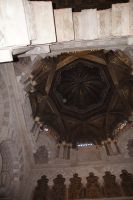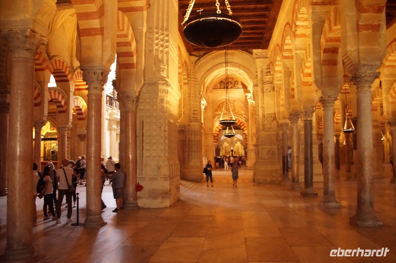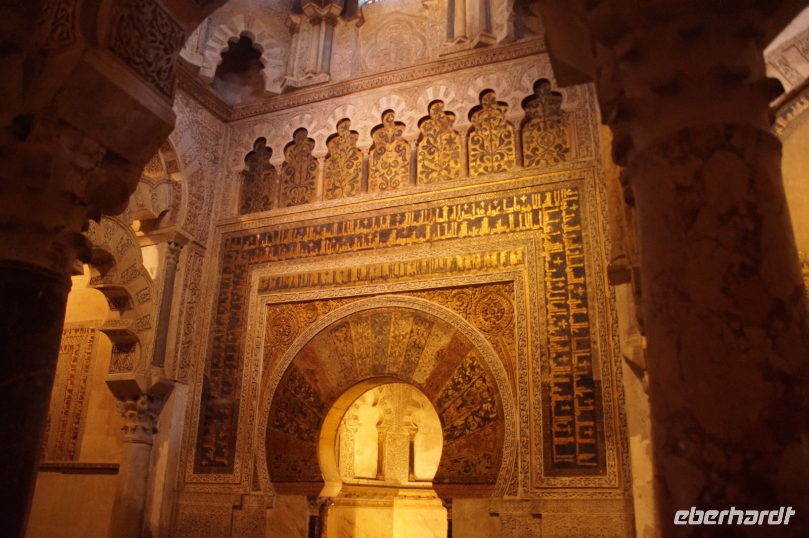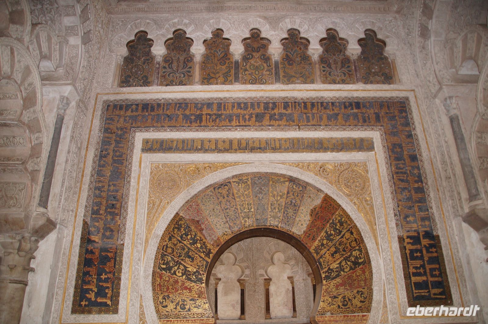 Die Araber hatten zunächst die Vinzentskirche für ihr Freitagsgebet genutzt, kauften der christlichen Gemeinde die Kirche aber schließlich ab und errichteten die Moschee. Zunächst mit Säulen, die sie aus unterschiedlichen Bauten recycelten, weshalb manche Säulen im Boden verschwinden, andere auf extra hohen Podesten stehen. Dann wurde die Moschee in Richtung des Flusses erweitert (diesmal mit extra für sie angefertigten Säulen und in kalifaler Zeit noch ein weiteres Mal in Richtung des Flusses erweitert. Aus dieser Zeit stammen der von byzantinischen Handwerkern - der Basileos von Byzanz und der Kalif von Córdoba kamen sich gegenseitig nicht ins Gehege, hatten aber gemeinsame Feinde - gestaltete Mi-h-râb sowie die Eingänge zur Schatzkammer und der Durchgang zum Kalifenpalast. Eine vierte Erweiterung konnte nicht mehr in Richtung ds Flusses gemacht werden, das Gelände wurde zu abschüssig und die Stadtmauer war auch nicht mehr weit, der Großwesir plante sie daher nach Norden. Anstelle des stetigen Wechsels von Kalkstein und Ziegeln, wie in den vorherigen Teilen der Moschee, wurden die Doppelbögen hier nur mit Kalkstein gebaut und die Ziegelteile durch entsprechende Anstriche simuliert. Nun ist der Wechsel von Kalkstein und Ziegel aber nicht nur schmuck, sondern angeblich auch besonders elastisch im Falle eines Erdbebens. Im vom Großwesir gebauten Teil der Moschee ist man diesem Problem damit begegnet, dass man unscheibare Bleischeiben zwischen Säule und Kapitell gelegt hat.