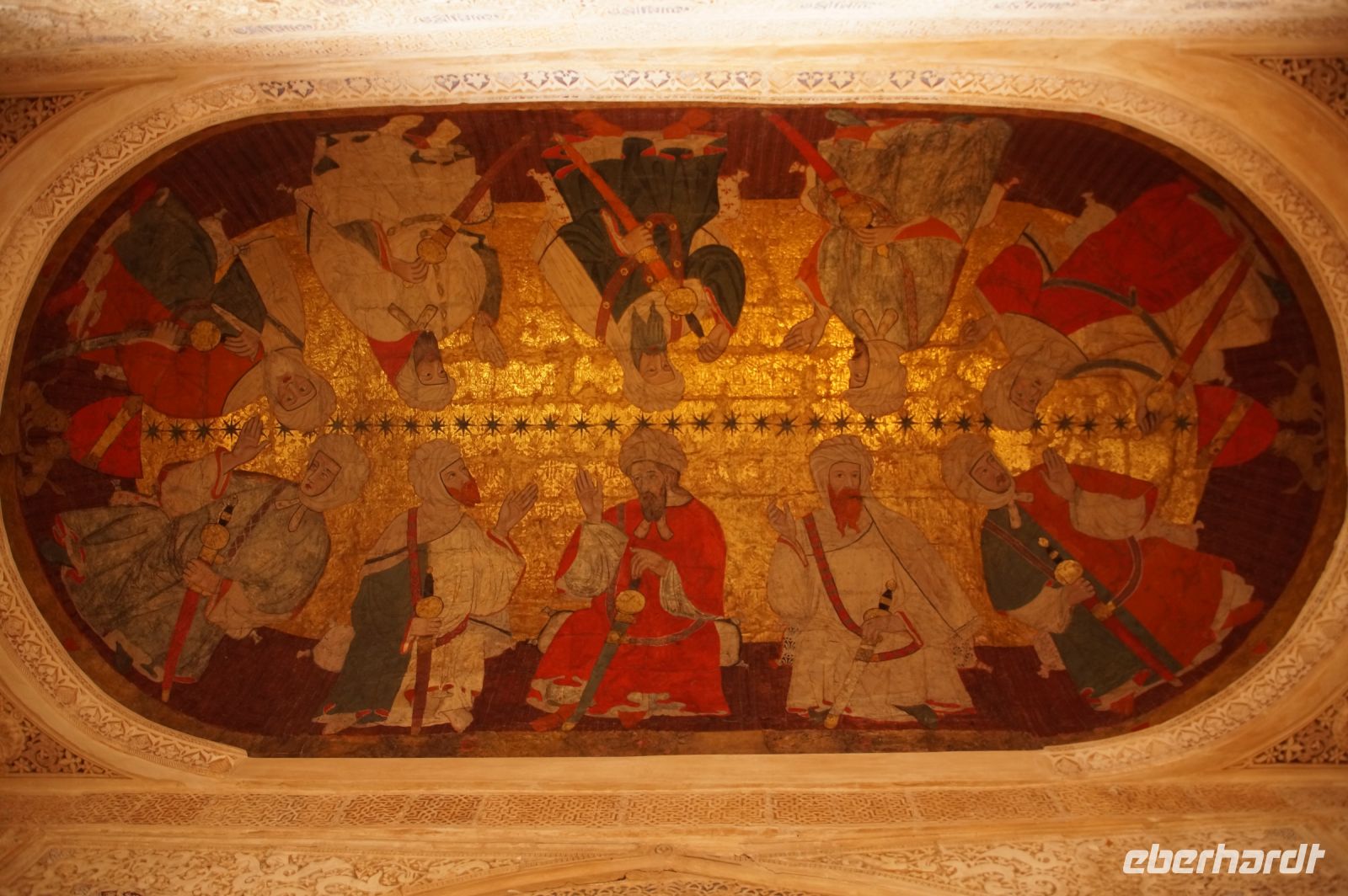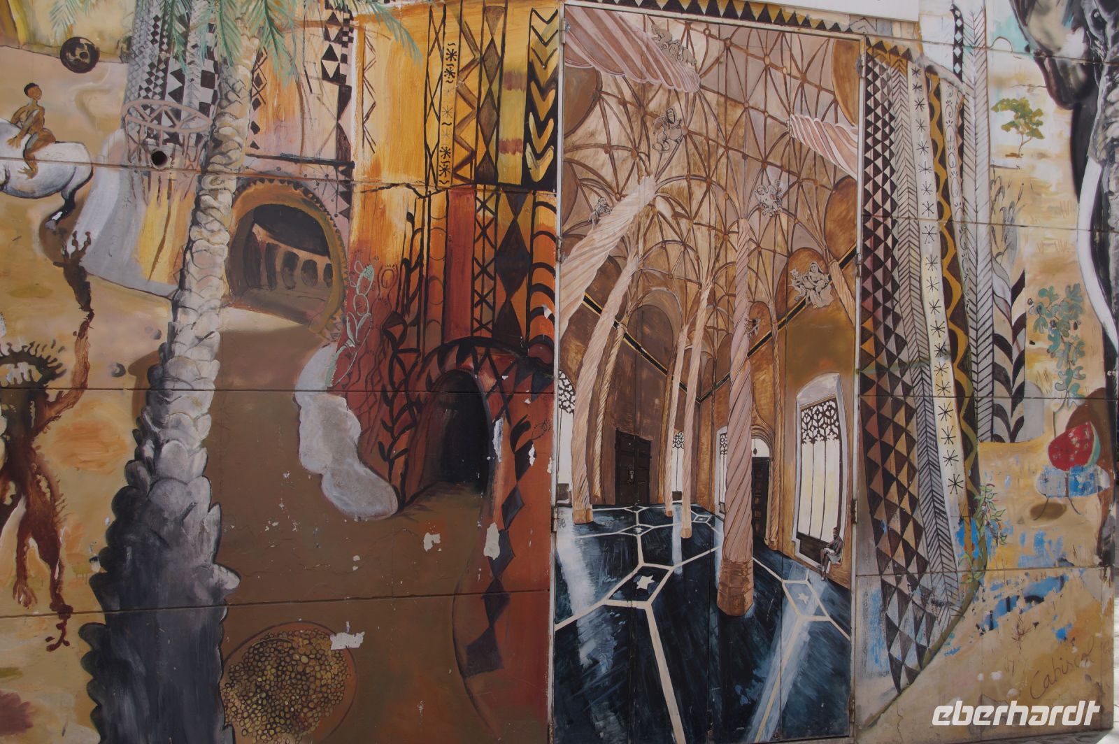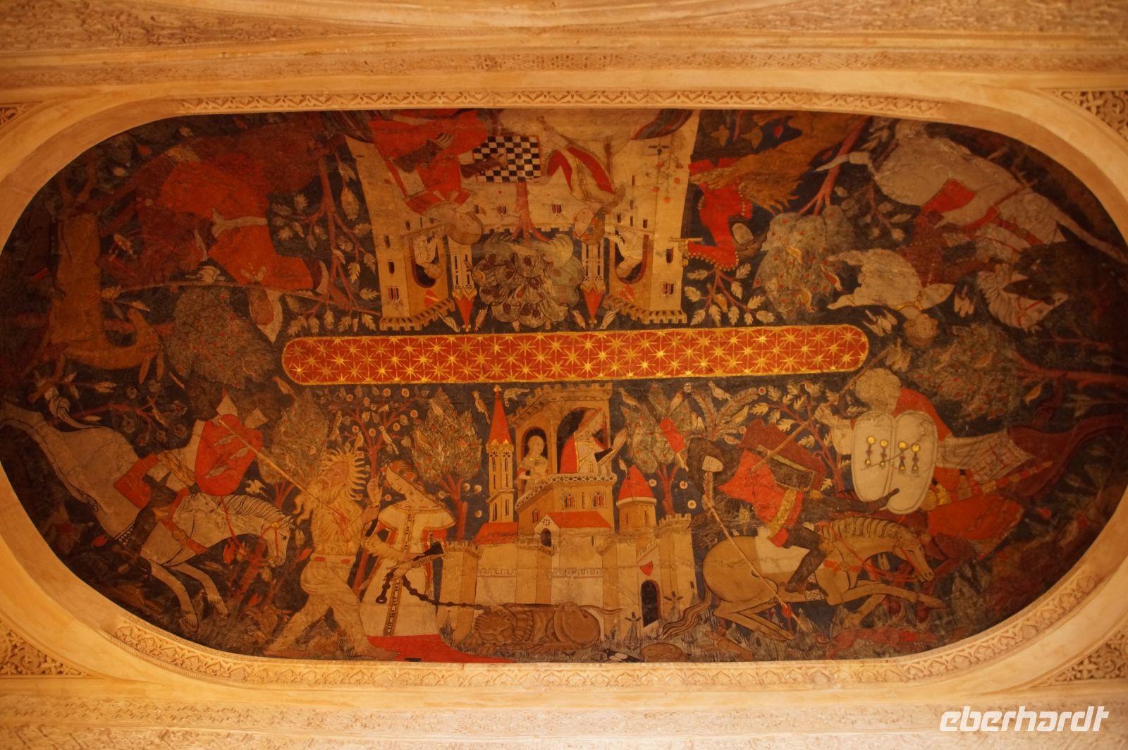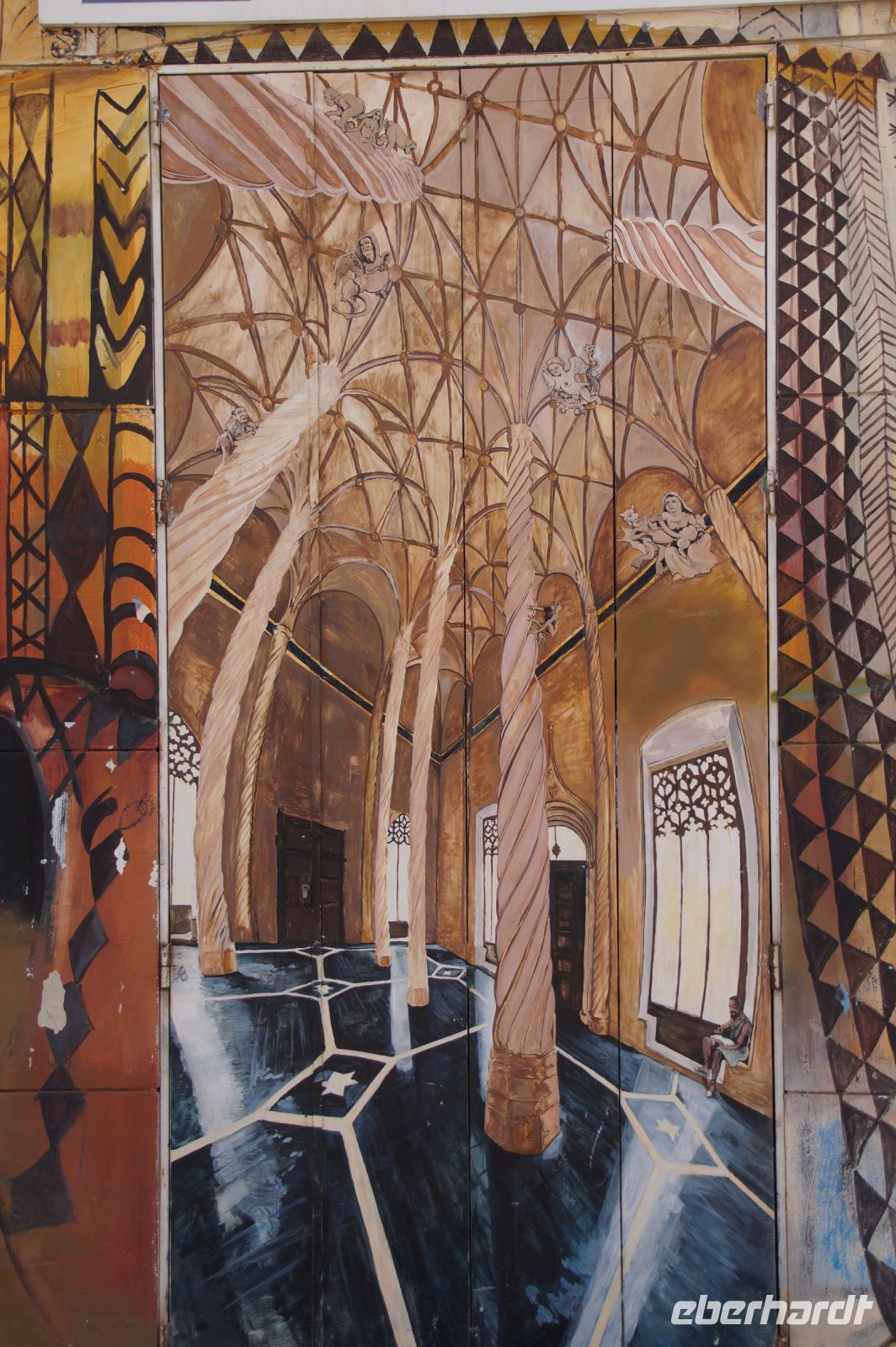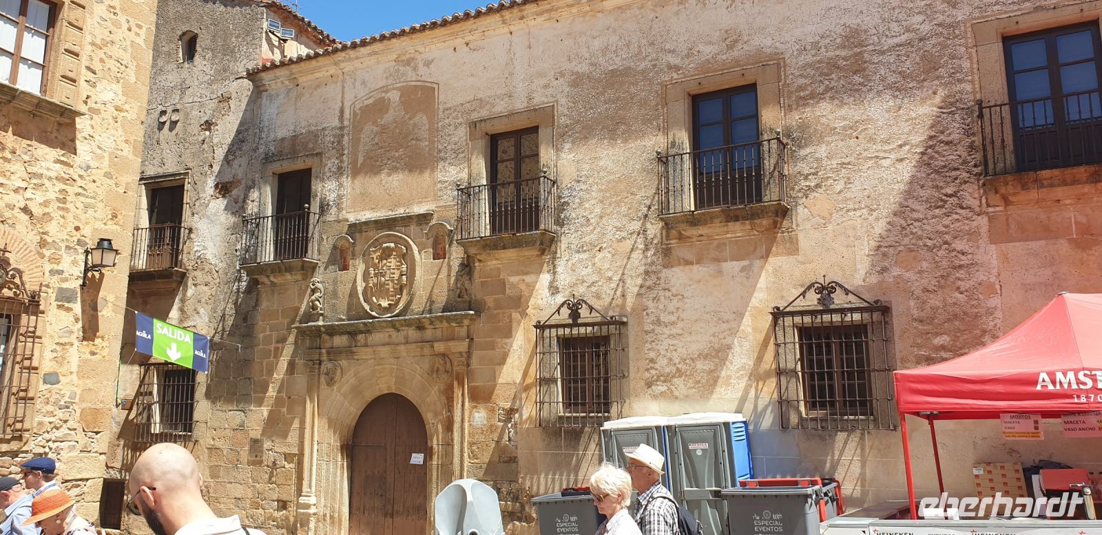Nun ging es gemeinsam in die Altstadt bzw. im Grunde genommen durch die Altstadt in den ummauerten Teil derselben, Cáceres intramuros oder Cáceres Monumental. Im Moctezuma (dt. Montezuma)-Palast, in dem sich heute das Stadtarchiv befindet, hatten wir dank einer Ausstellung für moderne Kunst die Gelegenheit, einen sonst für die Öffentlichkeit verschlossenen Raum zu besuchen. Hier hatte ein unbekannter Künstler - wobei Javier schon eine Theorie hatte, wer es denn gewesen sei - in Fresken seine Vorstellungen vom Aussehen Tenochtitlans, der Aztekenhauptstadt verewigt - natürlich ganz im Stile der Architektur eine Palaststadt der Renaissance. Der Auftraggeber war ein Urenkel des letzten Aztekenherrschers Moctezuma. Dessen Tochter Tecuichpoch hatte unter dem Namen Isabel de Moctezuma den Conquistadoren Juan de Cano geheiratet. Von den gemeinsamen fünf Kindern (Isabel hatte insgesamt sechs von denen wir wissen), heiratete der älteste Sohn Juan Cano de Moctezuma Elvira von Toledo und deren Erstgeborener, also der Enkel Isabels und Urenkel Montezumas, Juan Cano de Moctezuma de Toledo ließ diesen Palast in Cáceres errichten.