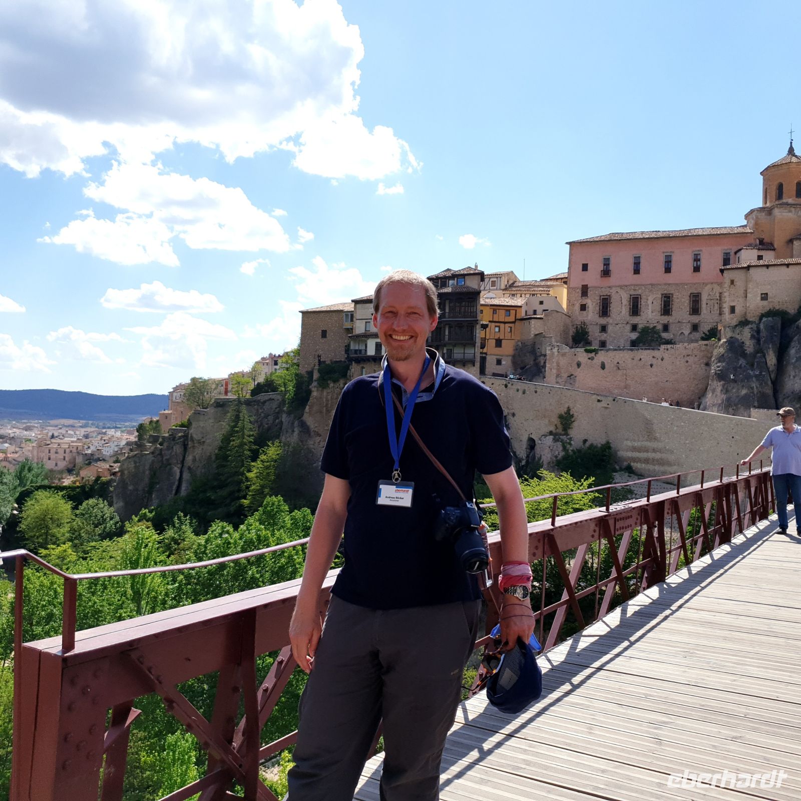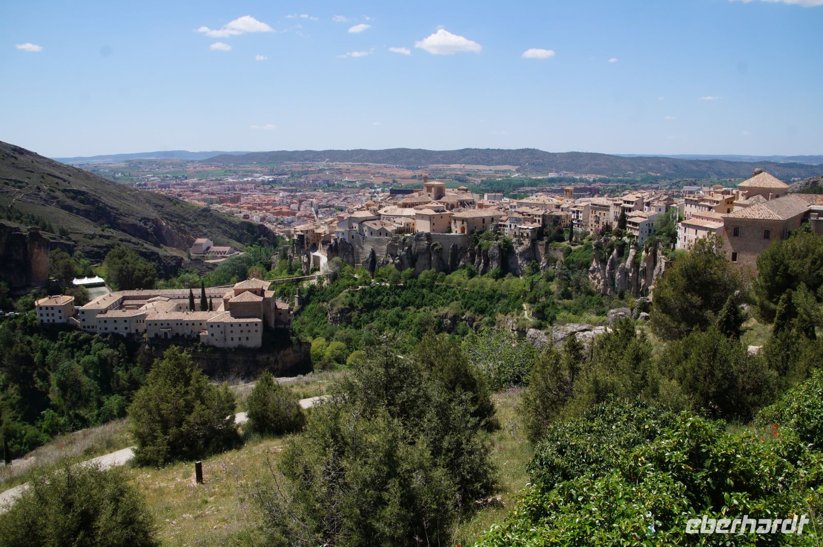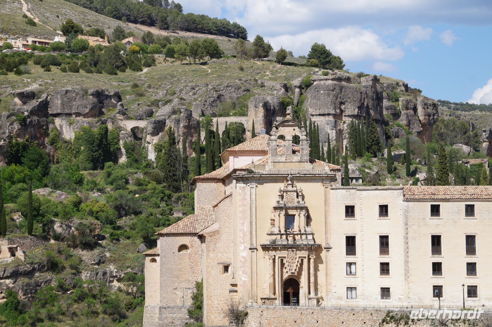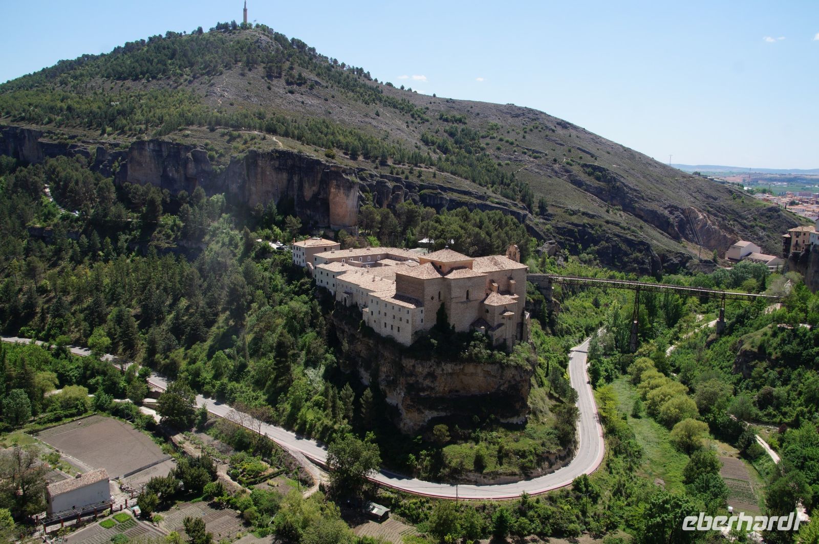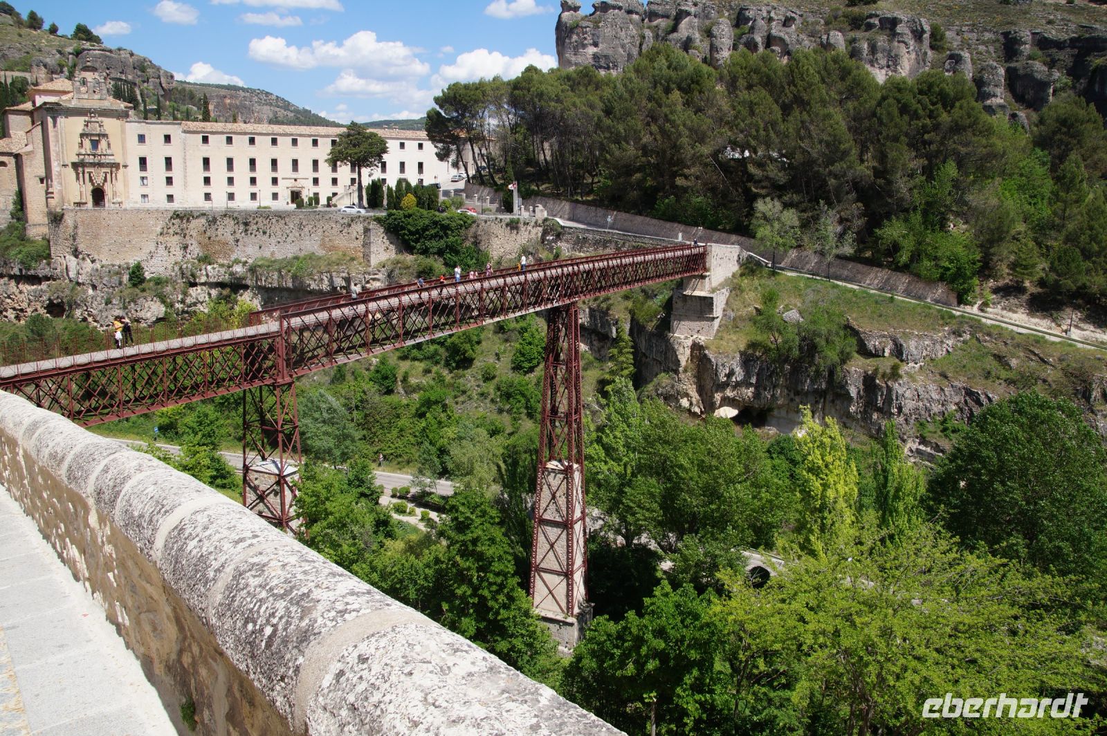 Anschließend verließen wir die Stadt über die Brücke des Heiligen Paulus, deren erste Version das Obispat von Cuenca im 16. Jhdt. finanzierte, weil zu viele Mönche aus dem Kloster sich krank meldeten, anstatt den Abstieg ins Tal des Huécar und den schließlich ein Aufstieg nach Cuenca anzugehen. Mit der Brücke wurde es den Mönchen erleichtert, zum täglichen Gebet in der Kathedrale zu kommen. Und uns, uns wieder von Santi in Empfang nehmen zu lassen. Die heutige Brücke ist bereits die zweite Version, gebaut von dem valencianischen Architekten José María Fuster, der sich vom Eiffelturm inspirieren ließ.