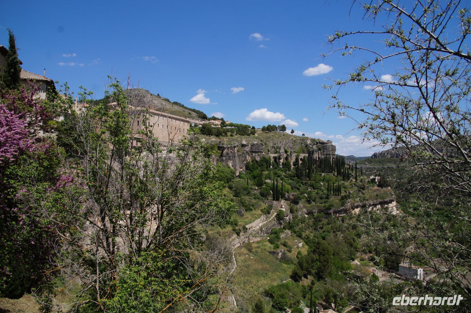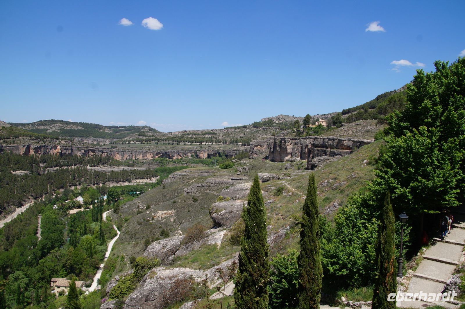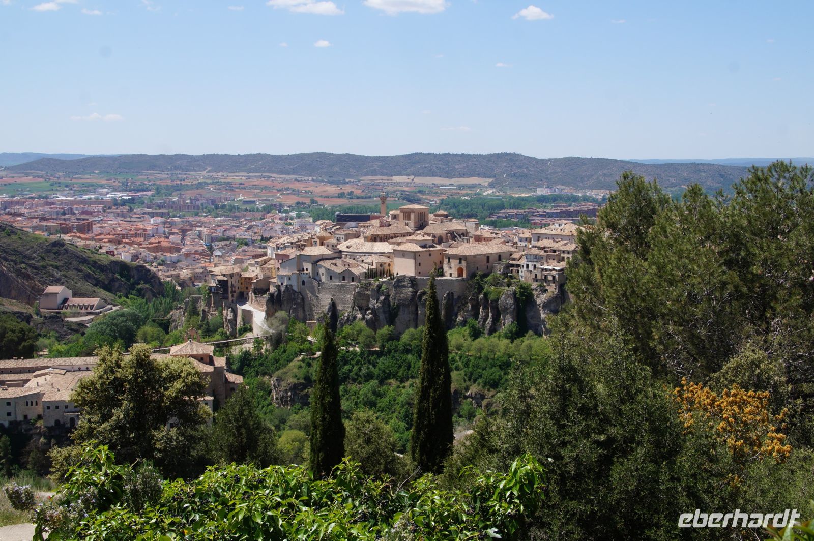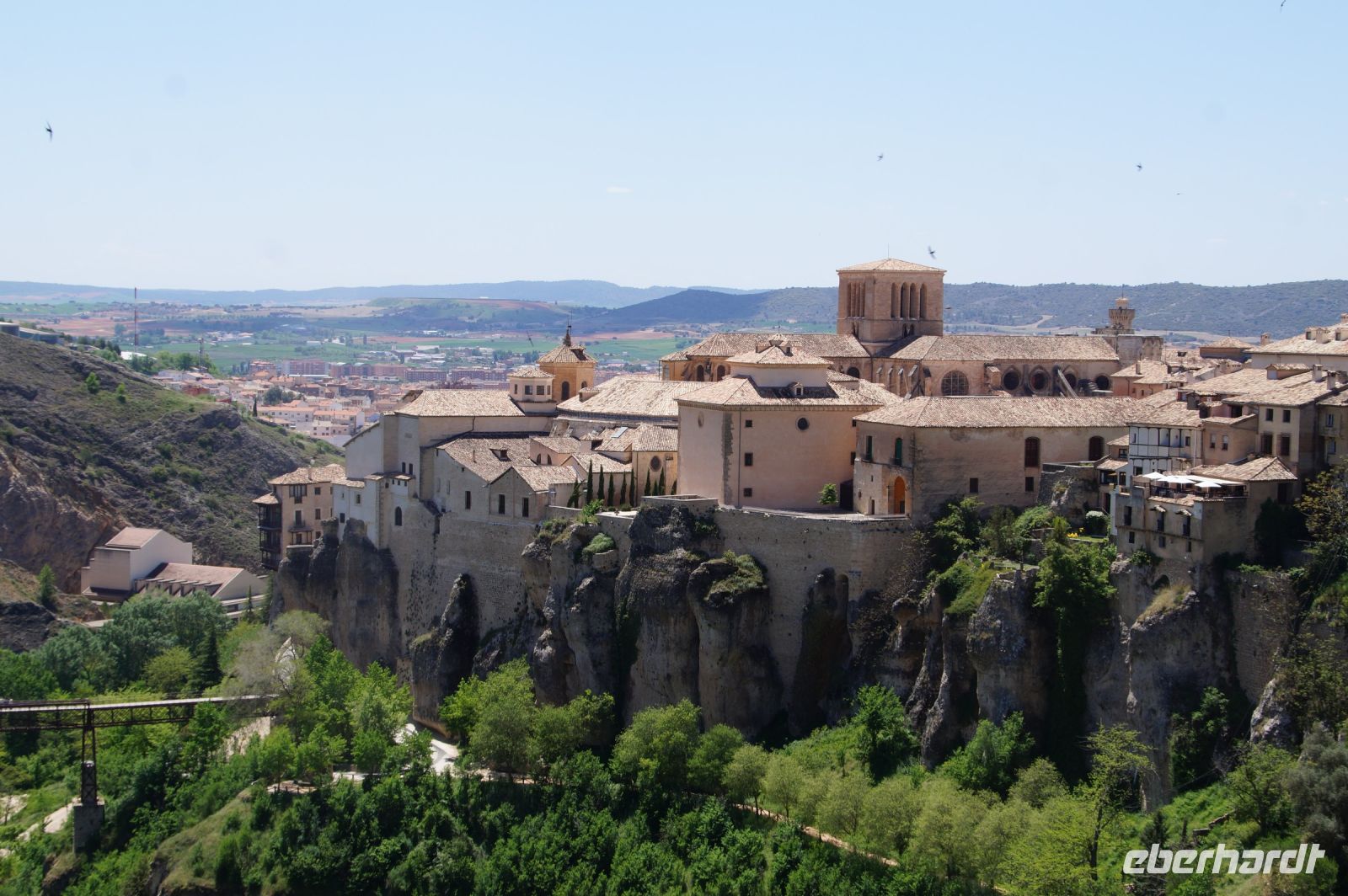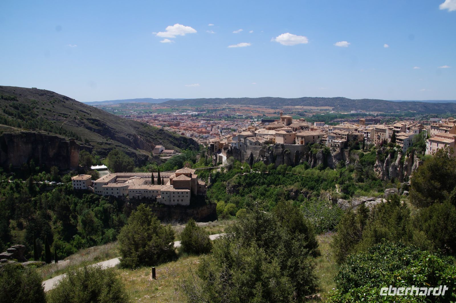 Anschließend verließen wir die Stadt über die Brücke des Heiligen Paulus, deren erste Version das Obispat von Cuenca im 16. Jhdt. finanzierte, weil zu viele Mönche aus dem Kloster sich krank meldeten, anstatt den Abstieg ins Tal des Huécar und den schließlich ein Aufstieg nach Cuenca anzugehen. Mit der Brücke wurde es den Mönchen erleichtert, zum täglichen Gebet in der Kathedrale zu kommen. Und uns, uns wieder von Santi in Empfang nehmen zu lassen. Die heutige Brücke ist bereits die zweite Version, gebaut von dem valencianischen Architekten José María Fuster, der sich vom Eiffelturm inspirieren ließ.