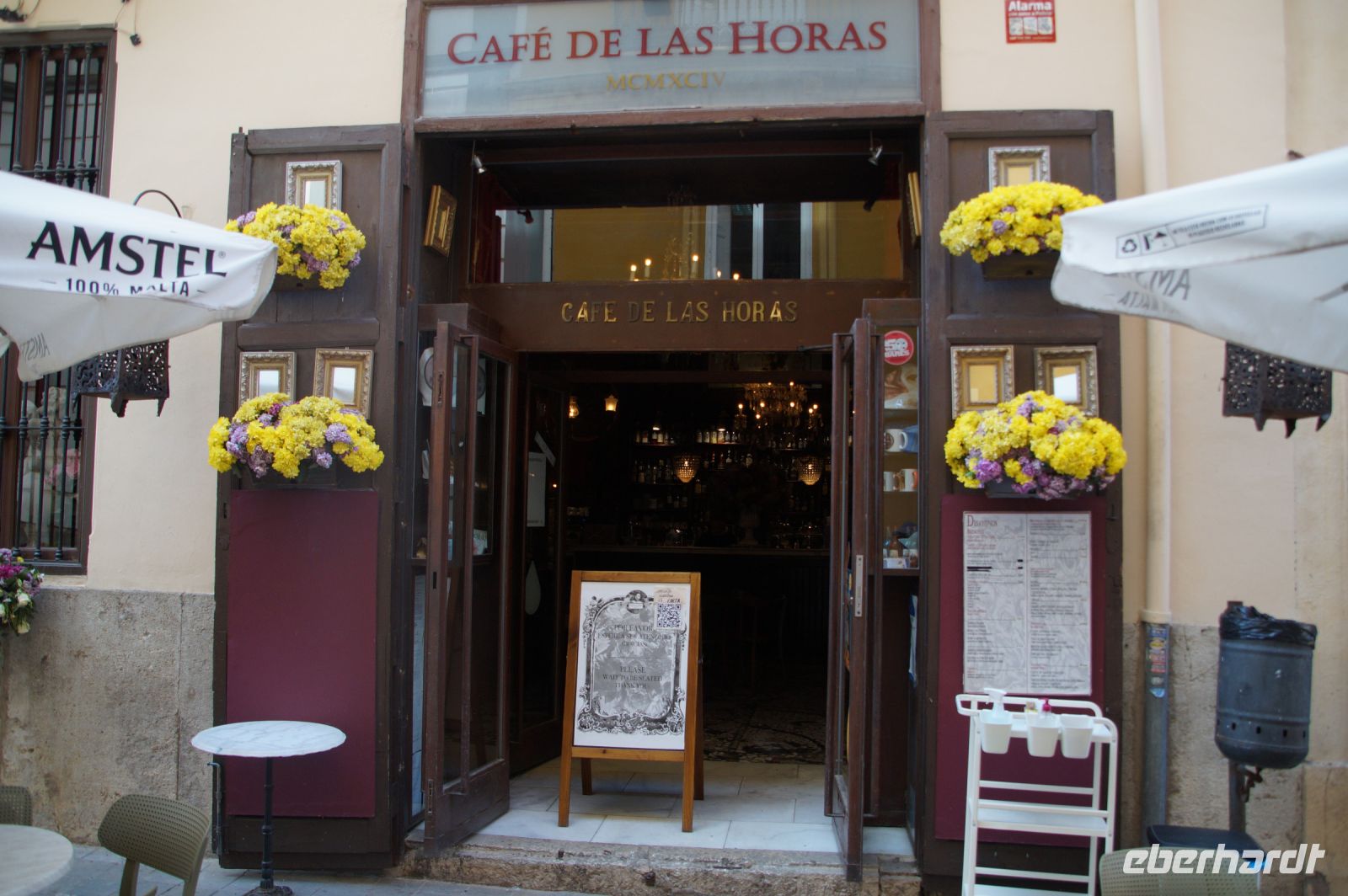 Anschließend sollte es zur Alajú- und Resolí-Probe gehen. Resolí ist ein für Cuenca typischer Kaffeelikör (auf Basis von Schnaps oder Anislikör, mit Kaffee, Zimt, Nelken und der Schale einer Orange), Alajú ein in Cuenca typischer Mandel-Honigkuchen mit Oblate oben und unten. Als wir aber den Resolí aus einer Porrón trinken sollten (man trinkt quasi den Strahl des Getränks, das man sich mit dem ausgestreckten Arm in Richtung Mund gießt aus der Luft), was ohne vorherige Übung meist nicht gelingt, flüchteten die meisten aus dem Laden. Und so wurde als Ersatz von Eberhardt-Travel ein Glas Resolí auf der Plaza Mayor spendiert. Statt Alajú gab es einen Kaffee dazu.