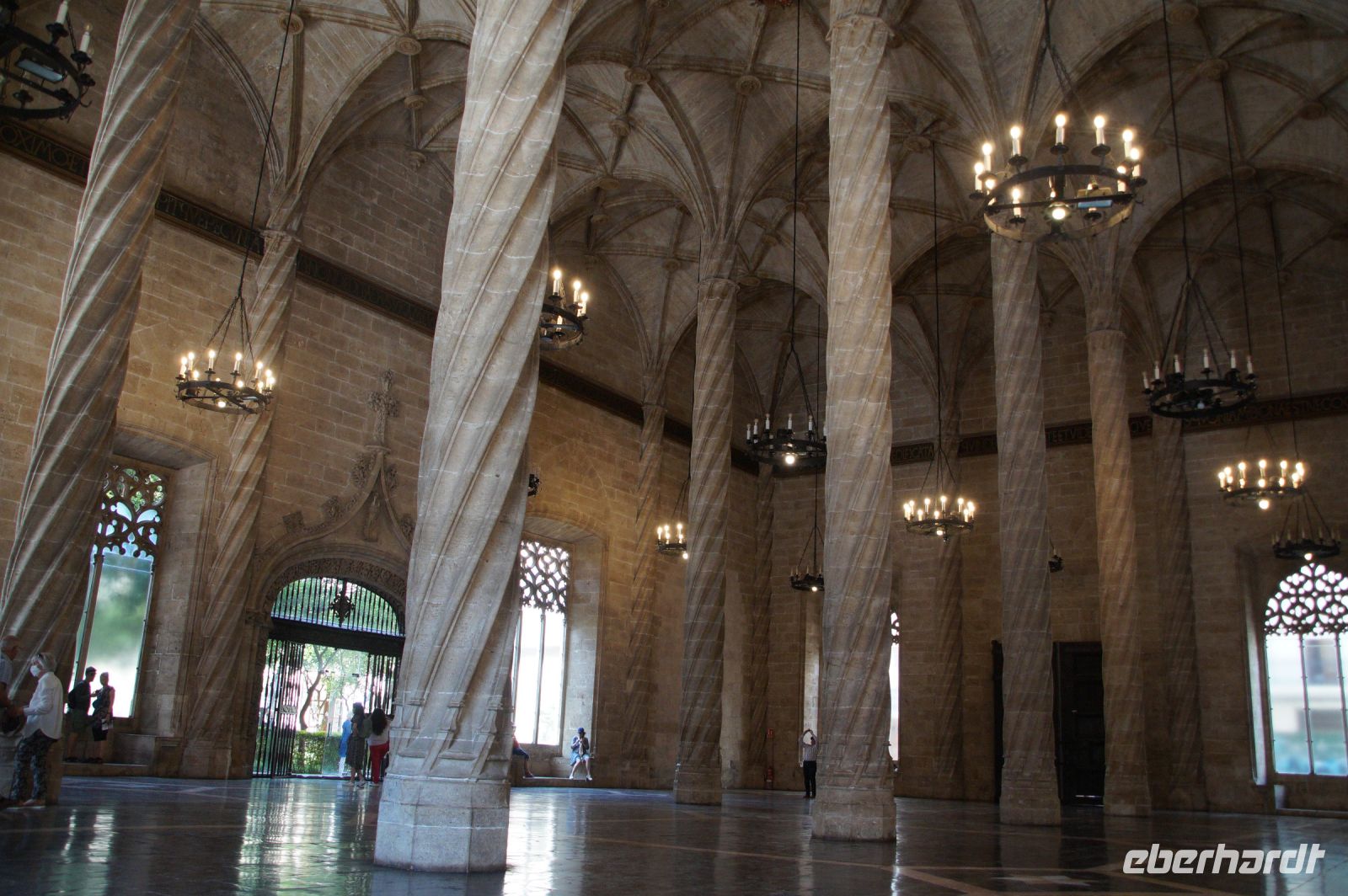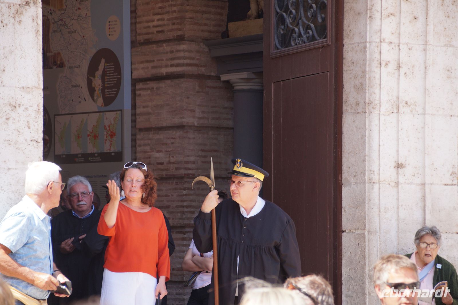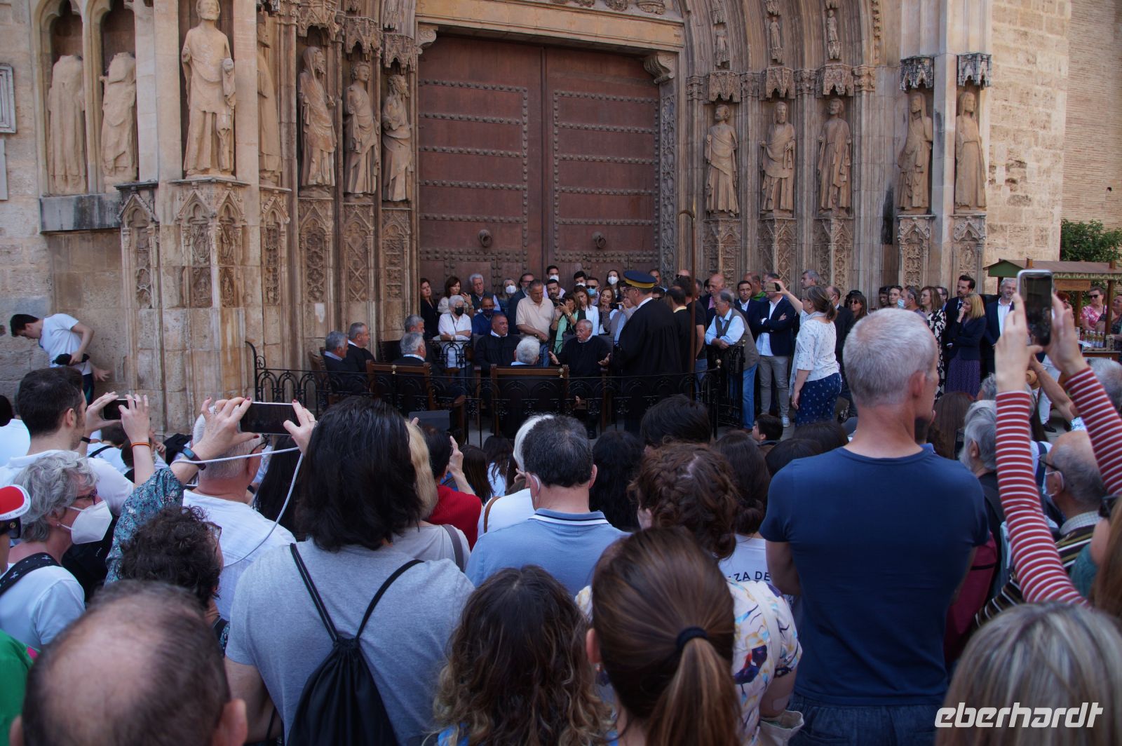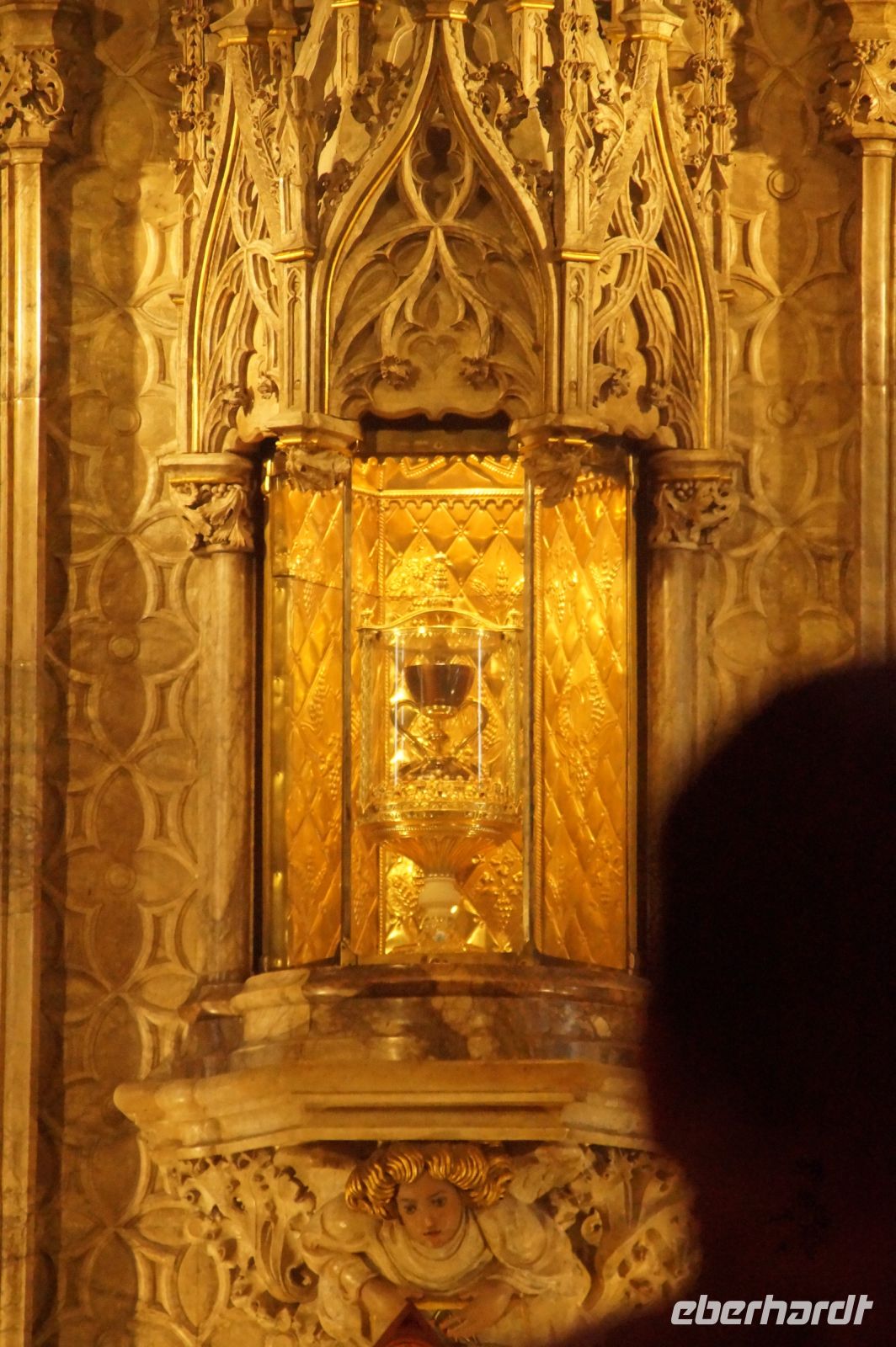 Vor der Kathedrale erlebten wir etwas, was jeden Donnerstag um 12:00 Uhr stattfindet: das Wassergericht (Tribunal de las Aguas). Dies ist eine Einrichtung, die noch aus arabischer Zeit stammt, die Reconquista überstand, weil Jaume (Jakob) dieses Gericht unangetastet ließ und bis heute überlebte. Für jeden der großen Bewässerungskanäle gibt es einen Richter (insgesamt zwölf) und der Ausrufer fragt laut in die Runde unter dem Hauptportal der Kathedrale, ob jemand eine Klage vorzubringen habe. Beim ersten Kanal gab es keine Klage, aber beim zweiten näherte sich eine Familie. Die Richter hörten sich die Klage an und der Richter des entsprechenden Kanals stellte Fragen, dann berieten sich die Richter übereinander, das ganze im valencianischen Dialekt des Katalanischen. Meistens drehen sich die Klagen darum, dass ein Nachbar seine Bewässerungszeit nicht eingehalten hat und somit dem Kläger wichtiges Wasser entgangen ist. Oder jemand hat in seinem Kanalstück Äste und Laub nicht aus dem Kanal geräumt und somit für die unteren Anrainer die Wassermenge gedrosselt. Nun ja, da die meisten von uns nicht verstanden, worum es ging, gingen wir schnell weiter und besichtigten die Kathedrale mit der Gralskapelle. In Valencia wird ein Gebinde aus zwei Achatgefäßen als der originale Abendmahlskelch Christi verehrt und manche wollen darin auch den San Grial bzw. heiligen Gral aus den Gralsromanen von Chretien de Troyes bzw. Wolfram von Eschenbach identifiziert haben. Sicher lässt sich der Kelch bis ins 14. Jhdt. zurückverfolgen, Erwähnungen eines als originalem Abendmahlskelch in den Händen der Könige von Aragón gibt es bis ins 12. Jhdt. Ich persönlich glaube, dass die Achatschalen im späten 10. Jhdt. für den Hof des Großwesirs von Córdoba gefertigt wurden, dafür spräche nämlich die Inschrift auf der Schale, die heute als Fuß des Gebindes fungiert: li-zahira ‚für Zahira‘.