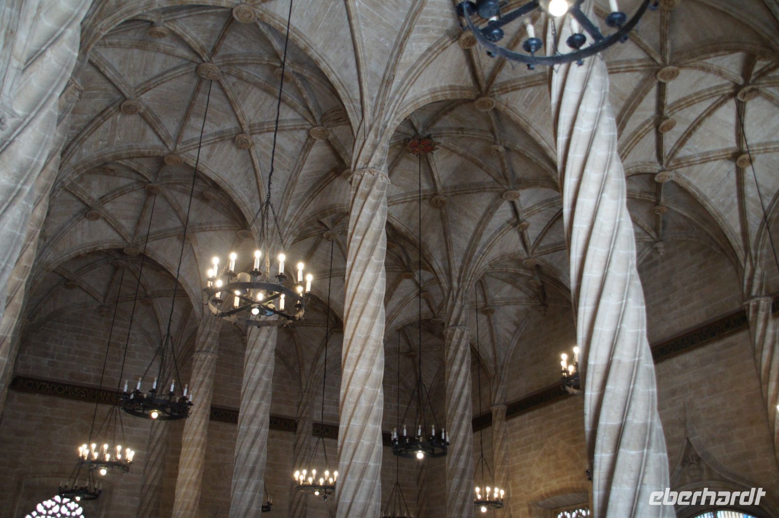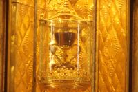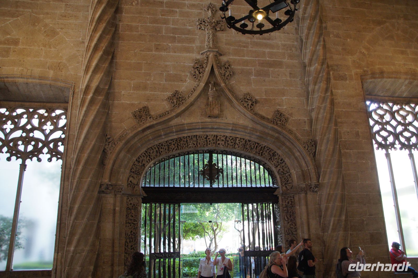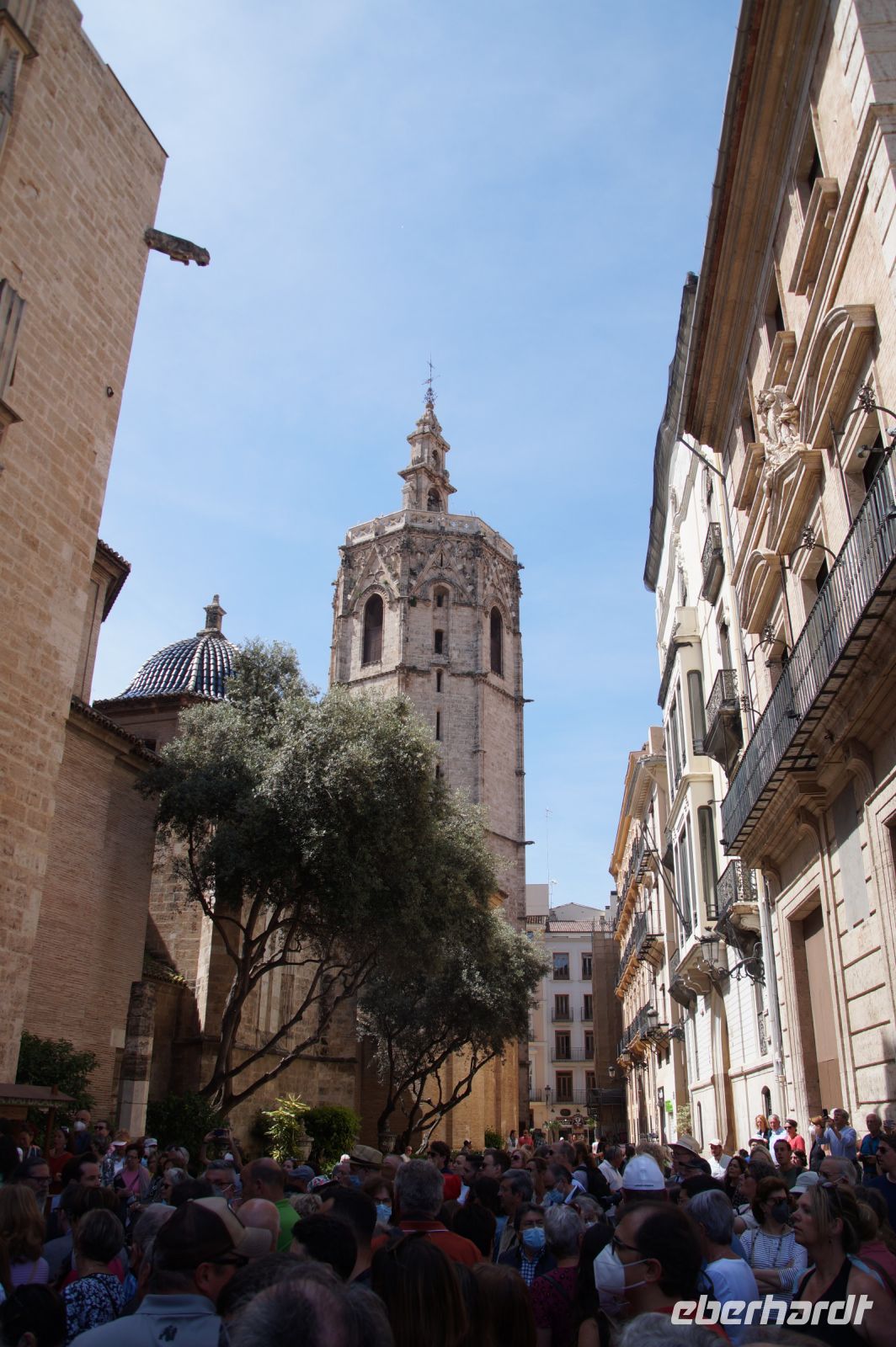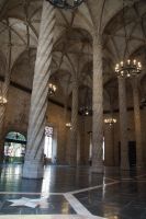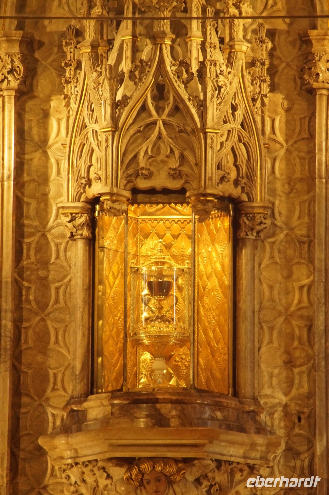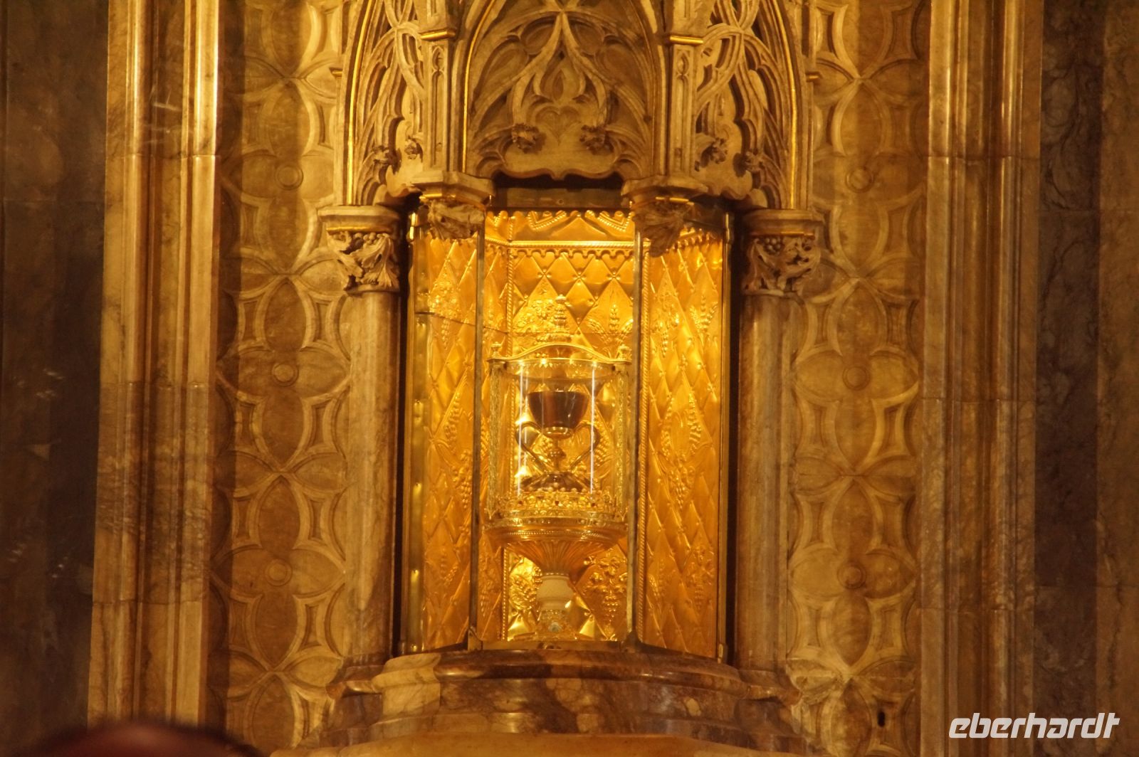 Vor der Kathedrale erlebten wir etwas, was jeden Donnerstag um 12:00 Uhr stattfindet: das Wassergericht (Tribunal de las Aguas). Dies ist eine Einrichtung, die noch aus arabischer Zeit stammt, die Reconquista überstand, weil Jaume (Jakob) dieses Gericht unangetastet ließ und bis heute überlebte. Für jeden der großen Bewässerungskanäle gibt es einen Richter (insgesamt zwölf) und der Ausrufer fragt laut in die Runde unter dem Hauptportal der Kathedrale, ob jemand eine Klage vorzubringen habe. Beim ersten Kanal gab es keine Klage, aber beim zweiten näherte sich eine Familie. Die Richter hörten sich die Klage an und der Richter des entsprechenden Kanals stellte Fragen, dann berieten sich die Richter übereinander, das ganze im valencianischen Dialekt des Katalanischen. Meistens drehen sich die Klagen darum, dass ein Nachbar seine Bewässerungszeit nicht eingehalten hat und somit dem Kläger wichtiges Wasser entgangen ist. Oder jemand hat in seinem Kanalstück Äste und Laub nicht aus dem Kanal geräumt und somit für die unteren Anrainer die Wassermenge gedrosselt. Nun ja, da die meisten von uns nicht verstanden, worum es ging, gingen wir schnell weiter und besichtigten die Kathedrale mit der Gralskapelle. In Valencia wird ein Gebinde aus zwei Achatgefäßen als der originale Abendmahlskelch Christi verehrt und manche wollen darin auch den San Grial bzw. heiligen Gral aus den Gralsromanen von Chretien de Troyes bzw. Wolfram von Eschenbach identifiziert haben. Sicher lässt sich der Kelch bis ins 14. Jhdt. zurückverfolgen, Erwähnungen eines als originalem Abendmahlskelch in den Händen der Könige von Aragón gibt es bis ins 12. Jhdt. Ich persönlich glaube, dass die Achatschalen im späten 10. Jhdt. für den Hof des Großwesirs von Córdoba gefertigt wurden, dafür spräche nämlich die Inschrift auf der Schale, die heute als Fuß des Gebindes fungiert: li-zahira ‚für Zahira‘.