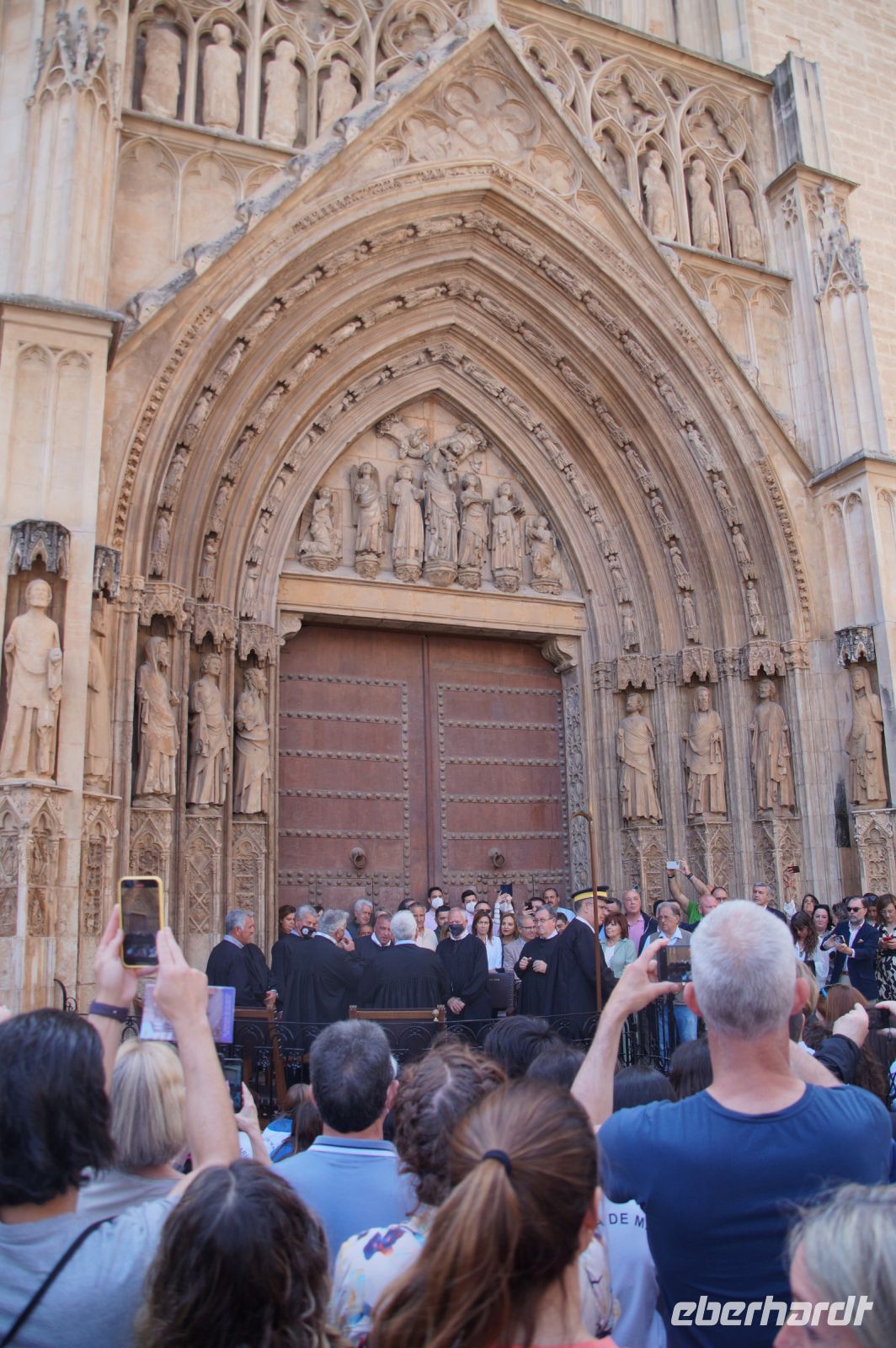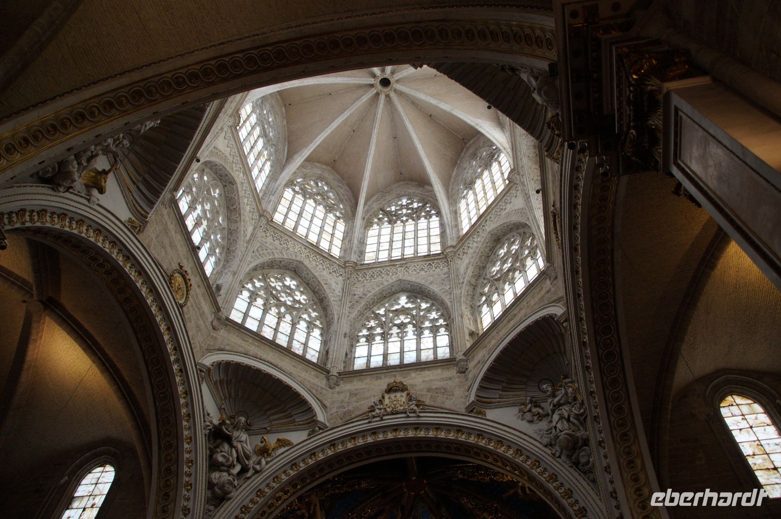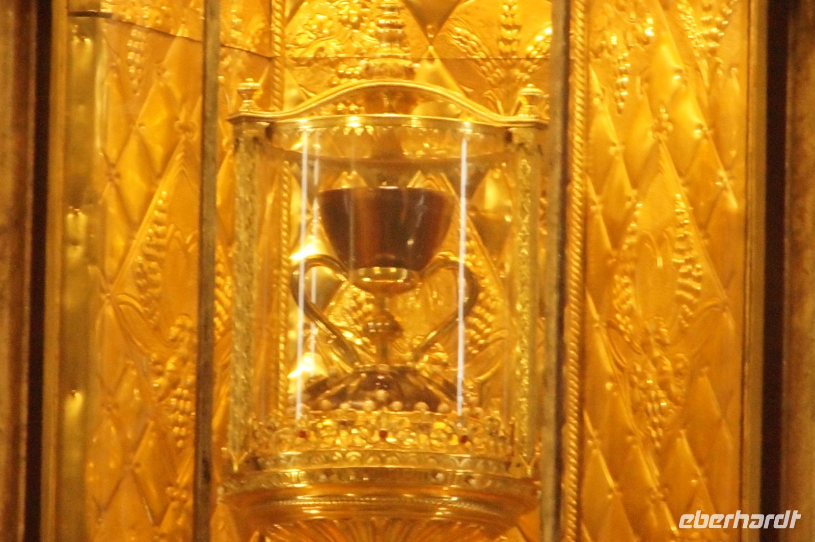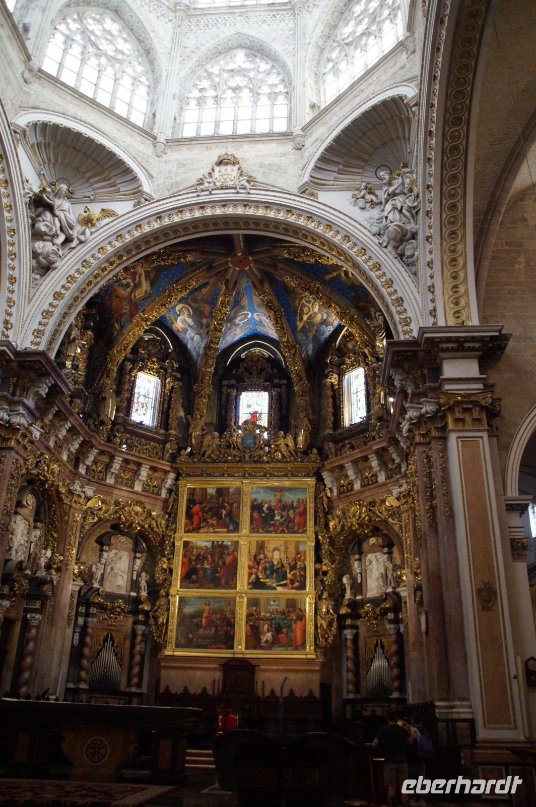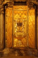 Vor der Kathedrale erlebten wir etwas, was jeden Donnerstag um 12:00 Uhr stattfindet: das Wassergericht (Tribunal de las Aguas). Dies ist eine Einrichtung, die noch aus arabischer Zeit stammt, die Reconquista überstand, weil Jaume (Jakob) dieses Gericht unangetastet ließ und bis heute überlebte. Für jeden der großen Bewässerungskanäle gibt es einen Richter (insgesamt zwölf) und der Ausrufer fragt laut in die Runde unter dem Hauptportal der Kathedrale, ob jemand eine Klage vorzubringen habe. Beim ersten Kanal gab es keine Klage, aber beim zweiten näherte sich eine Familie. Die Richter hörten sich die Klage an und der Richter des entsprechenden Kanals stellte Fragen, dann berieten sich die Richter übereinander, das ganze im valencianischen Dialekt des Katalanischen. Meistens drehen sich die Klagen darum, dass ein Nachbar seine Bewässerungszeit nicht eingehalten hat und somit dem Kläger wichtiges Wasser entgangen ist. Oder jemand hat in seinem Kanalstück Äste und Laub nicht aus dem Kanal geräumt und somit für die unteren Anrainer die Wassermenge gedrosselt. Nun ja, da die meisten von uns nicht verstanden, worum es ging, gingen wir schnell weiter und besichtigten die Kathedrale mit der Gralskapelle. In Valencia wird ein Gebinde aus zwei Achatgefäßen als der originale Abendmahlskelch Christi verehrt und manche wollen darin auch den San Grial bzw. heiligen Gral aus den Gralsromanen von Chretien de Troyes bzw. Wolfram von Eschenbach identifiziert haben. Sicher lässt sich der Kelch bis ins 14. Jhdt. zurückverfolgen, Erwähnungen eines als originalem Abendmahlskelch in den Händen der Könige von Aragón gibt es bis ins 12. Jhdt. Ich persönlich glaube, dass die Achatschalen im späten 10. Jhdt. für den Hof des Großwesirs von Córdoba gefertigt wurden, dafür spräche nämlich die Inschrift auf der Schale, die heute als Fuß des Gebindes fungiert: li-zahira ‚für Zahira‘.