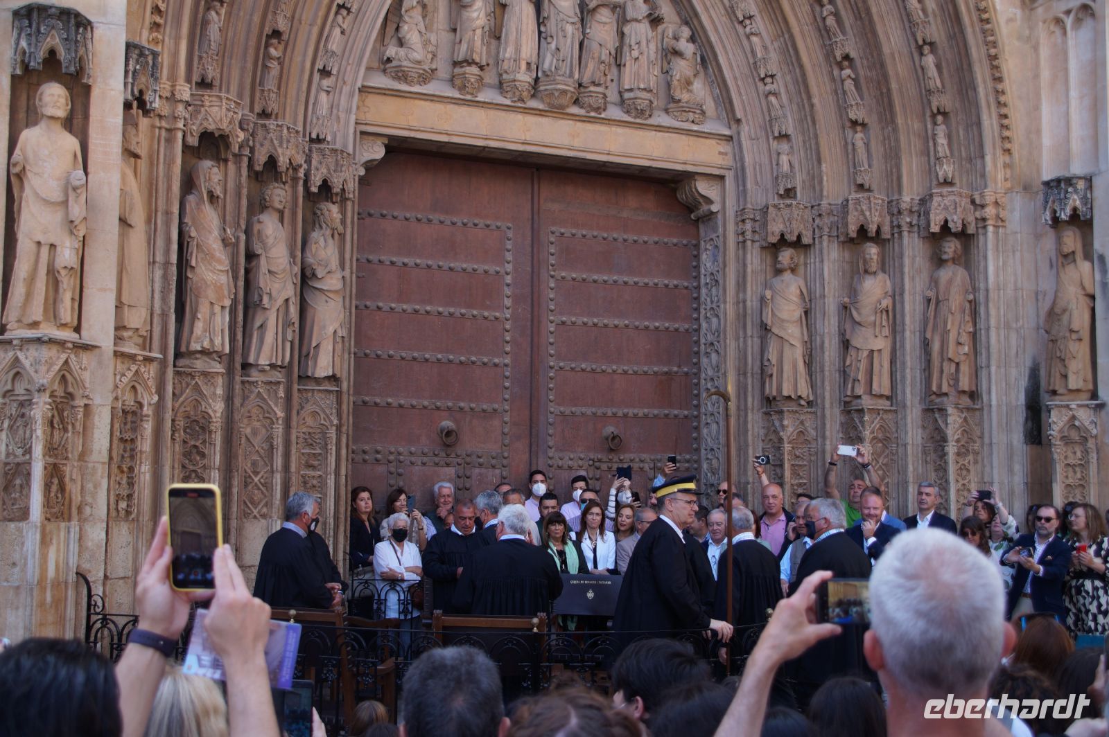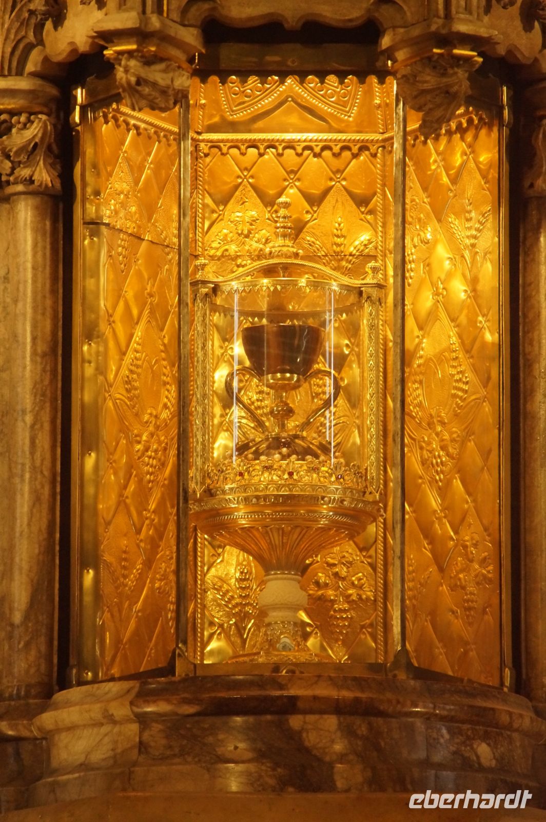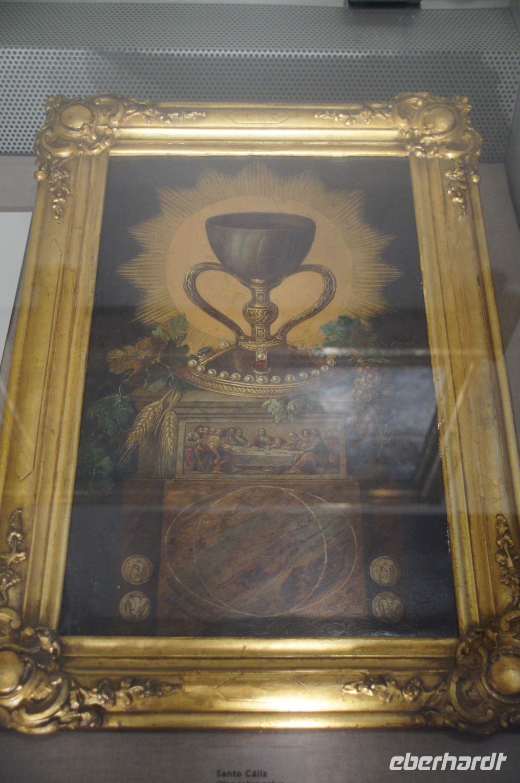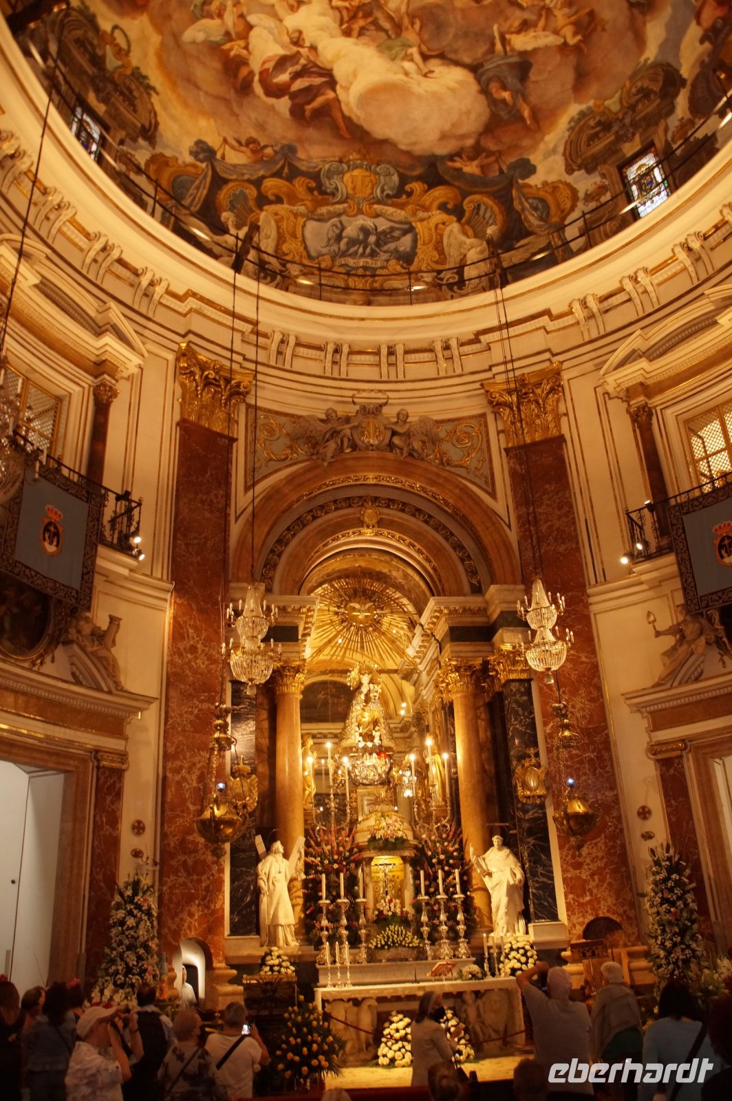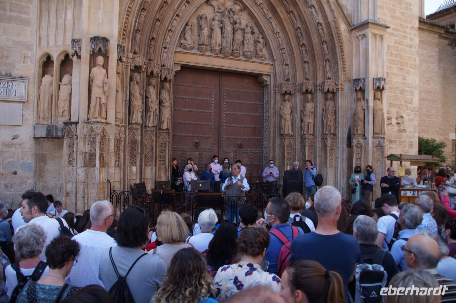 Vor der Kathedrale erlebten wir etwas, was jeden Donnerstag um 12:00 Uhr stattfindet: das Wassergericht (Tribunal de las Aguas). Dies ist eine Einrichtung, die noch aus arabischer Zeit stammt, die Reconquista überstand, weil Jaume (Jakob) dieses Gericht unangetastet ließ und bis heute überlebte. Für jeden der großen Bewässerungskanäle gibt es einen Richter (insgesamt zwölf) und der Ausrufer fragt laut in die Runde unter dem Hauptportal der Kathedrale, ob jemand eine Klage vorzubringen habe. Beim ersten Kanal gab es keine Klage, aber beim zweiten näherte sich eine Familie. Die Richter hörten sich die Klage an und der Richter des entsprechenden Kanals stellte Fragen, dann berieten sich die Richter übereinander, das ganze im valencianischen Dialekt des Katalanischen. Meistens drehen sich die Klagen darum, dass ein Nachbar seine Bewässerungszeit nicht eingehalten hat und somit dem Kläger wichtiges Wasser entgangen ist. Oder jemand hat in seinem Kanalstück Äste und Laub nicht aus dem Kanal geräumt und somit für die unteren Anrainer die Wassermenge gedrosselt. Nun ja, da die meisten von uns nicht verstanden, worum es ging, gingen wir schnell weiter und besichtigten die Kathedrale mit der Gralskapelle. In Valencia wird ein Gebinde aus zwei Achatgefäßen als der originale Abendmahlskelch Christi verehrt und manche wollen darin auch den San Grial bzw. heiligen Gral aus den Gralsromanen von Chretien de Troyes bzw. Wolfram von Eschenbach identifiziert haben. Sicher lässt sich der Kelch bis ins 14. Jhdt. zurückverfolgen, Erwähnungen eines als originalem Abendmahlskelch in den Händen der Könige von Aragón gibt es bis ins 12. Jhdt. Ich persönlich glaube, dass die Achatschalen im späten 10. Jhdt. für den Hof des Großwesirs von Córdoba gefertigt wurden, dafür spräche nämlich die Inschrift auf der Schale, die heute als Fuß des Gebindes fungiert: li-zahira ‚für Zahira‘.
