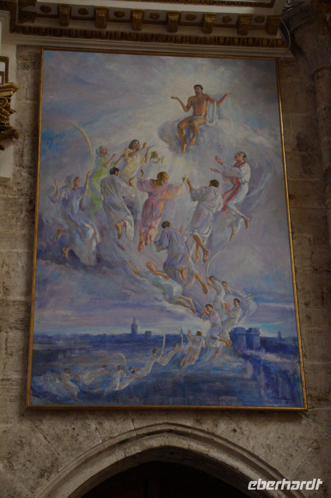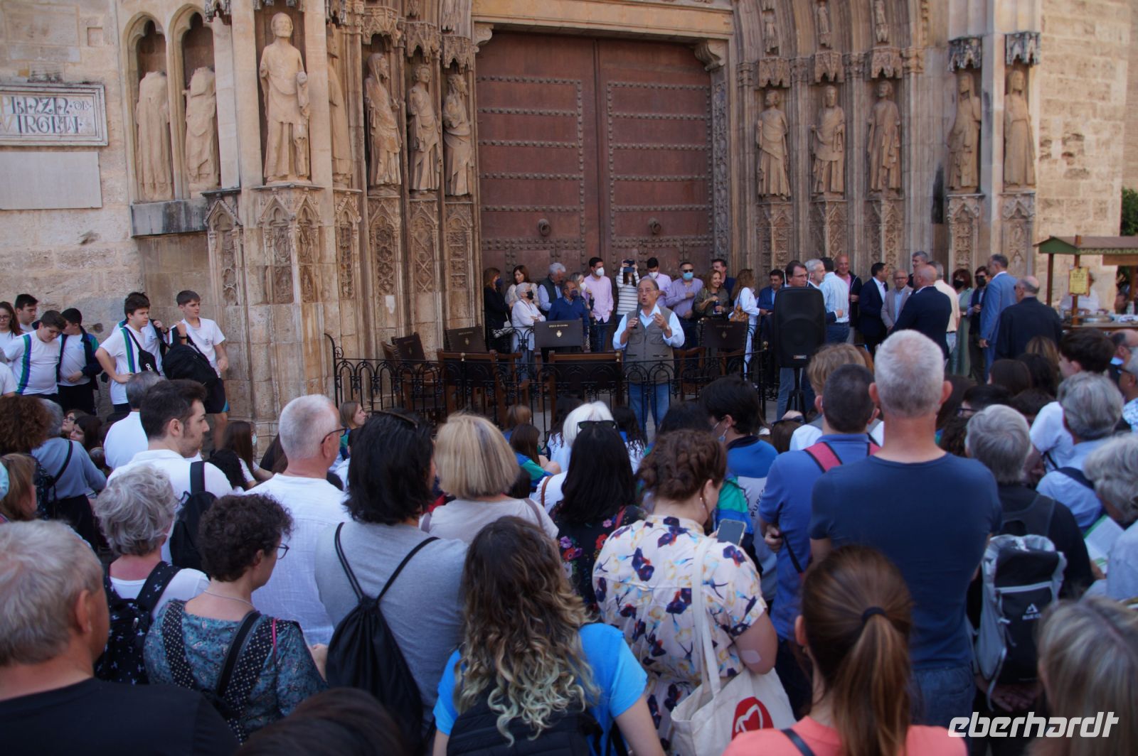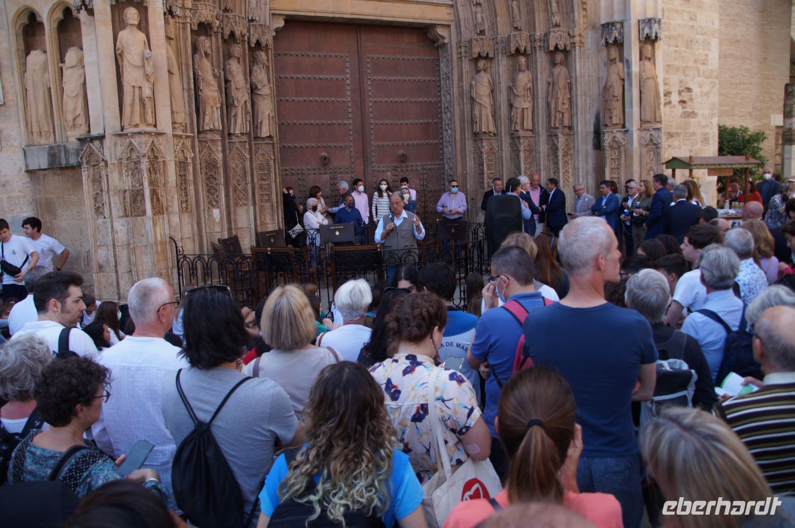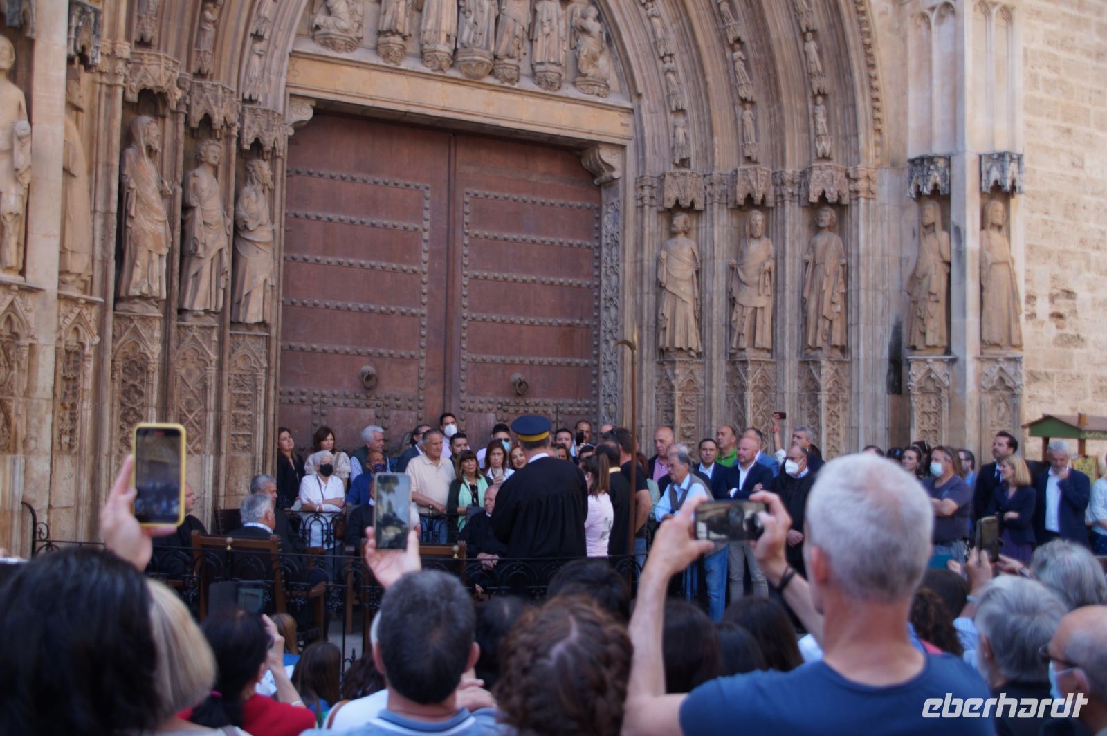 Vor der Kathedrale erlebten wir etwas, was jeden Donnerstag um 12:00 Uhr stattfindet: das Wassergericht (Tribunal de las Aguas). Dies ist eine Einrichtung, die noch aus arabischer Zeit stammt, die Reconquista überstand, weil Jaume (Jakob) dieses Gericht unangetastet ließ und bis heute überlebte. Für jeden der großen Bewässerungskanäle gibt es einen Richter (insgesamt zwölf) und der Ausrufer fragt laut in die Runde unter dem Hauptportal der Kathedrale, ob jemand eine Klage vorzubringen habe. Beim ersten Kanal gab es keine Klage, aber beim zweiten näherte sich eine Familie. Die Richter hörten sich die Klage an und der Richter des entsprechenden Kanals stellte Fragen, dann berieten sich die Richter übereinander, das ganze im valencianischen Dialekt des Katalanischen. Meistens drehen sich die Klagen darum, dass ein Nachbar seine Bewässerungszeit nicht eingehalten hat und somit dem Kläger wichtiges Wasser entgangen ist. Oder jemand hat in seinem Kanalstück Äste und Laub nicht aus dem Kanal geräumt und somit für die unteren Anrainer die Wassermenge gedrosselt. Nun ja, da die meisten von uns nicht verstanden, worum es ging, gingen wir schnell weiter und besichtigten die Kathedrale mit der Gralskapelle. In Valencia wird ein Gebinde aus zwei Achatgefäßen als der originale Abendmahlskelch Christi verehrt und manche wollen darin auch den San Grial bzw. heiligen Gral aus den Gralsromanen von Chretien de Troyes bzw. Wolfram von Eschenbach identifiziert haben. Sicher lässt sich der Kelch bis ins 14. Jhdt. zurückverfolgen, Erwähnungen eines als originalem Abendmahlskelch in den Händen der Könige von Aragón gibt es bis ins 12. Jhdt. Ich persönlich glaube, dass die Achatschalen im späten 10. Jhdt. für den Hof des Großwesirs von Córdoba gefertigt wurden, dafür spräche nämlich die Inschrift auf der Schale, die heute als Fuß des Gebindes fungiert: li-zahira ‚für Zahira‘.