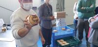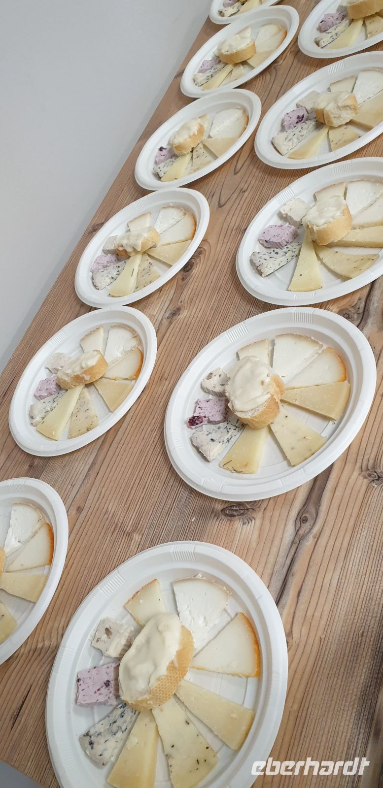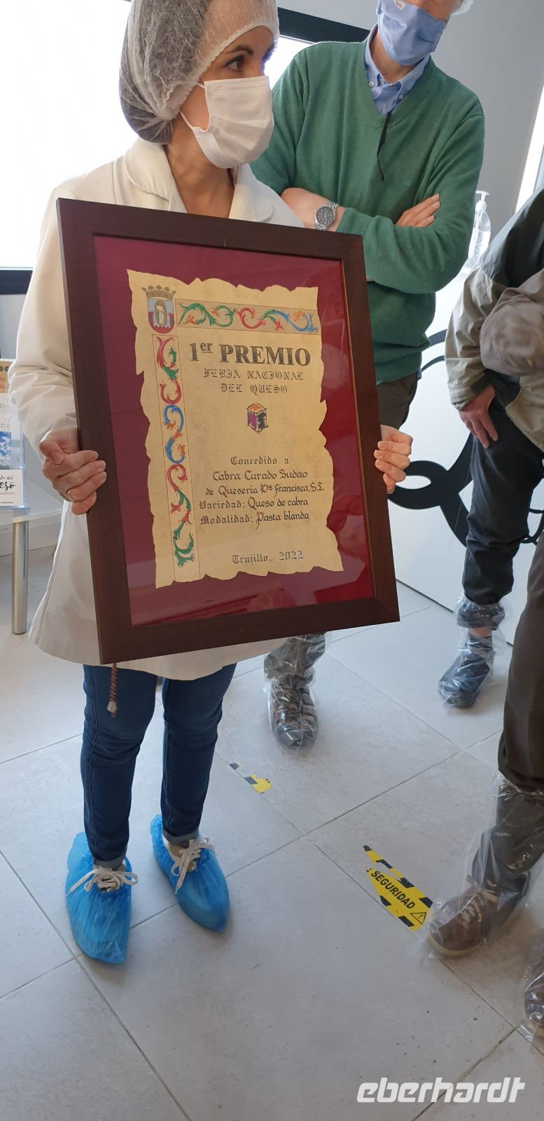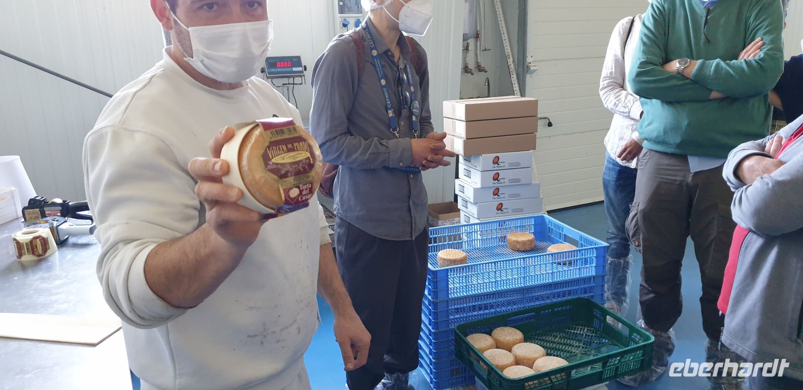 Bevor wir in die Produktion durften, war auch hier zunächst ankleiden angesagt. Hier gab es richtige Stulpen über die Schuhe und einen Einmalkittel für den Wams. Dann rannte wir durch die Produktion und Javier, den wir mit seinem Praktikanten heute wieder trafen, übersetzte uns das Gesagte ins Spanische, manchmal trug die Marketingchefin der Käserei uns Dinge auch auf Englisch vor. Vieles, von dem, was wir hier sahen, war ganz ähnlich dem, was wir schon vom Manchego kannten, nur, dass die Rohmilch nicht vom Manchego-Schaf stammt, sondern vom Merino oder Entrefino. Die Besonderheit bei der Torta del Casar ist, dass hier anstelle des Labs bei der Käseproduktion Blüten einer Distel bzw. Wildartischocke treten. Die Rohmilch wird mit den Blütenblättern dieser Artischocke wieder auf 28° - 32° temperiert, es entsteht Käsebruch - wieso kommt mir das alles so bekannt vor? - der Käsebruch in Reiskorngröße wurde früher in runde Körbe, heute in Plastikformen gefüllt, gepresst und gewendet, landet in Salzlake und kommt dann für mindestens 60 Tage bei 4° - 12° in die Reifung. Anders als der Manchego, der fest werden soll, wird allerdings von der Torta de Casar erwartet, dass diese innen in einem dickflüssigen Zustand verbleibt, d.h.. wenn die Rinde aufbricht, soll der Käse dem Konsumenten entgegenquellen. Apropos Konsument: Natürlich durften wir auch hier nach der Theorie wieder zu einem praktischen Teil übergehen. Als mittlerweile geübte Käse-Degustierer bekamen wir nun diverse Ziegen- und Schafskäse gereicht, wobei wir die Käse im Uhrzeigersinn probieren sollten, beginnend mit einem mit Preiselbeeren versetzten und daher leicht süßlichen Ziegenkäse bis hin zu den etwas strengeren Käsen. Dazu bekamen wir Weiß- oder Rotwein gereicht, wobei die Marketing-Chefin von Doña Francisca (so der Name der Käserei, nach der Mutter ihrer Gründer) zur Überraschung einiger eher den Weiß-, als den Rotwein empfahl.