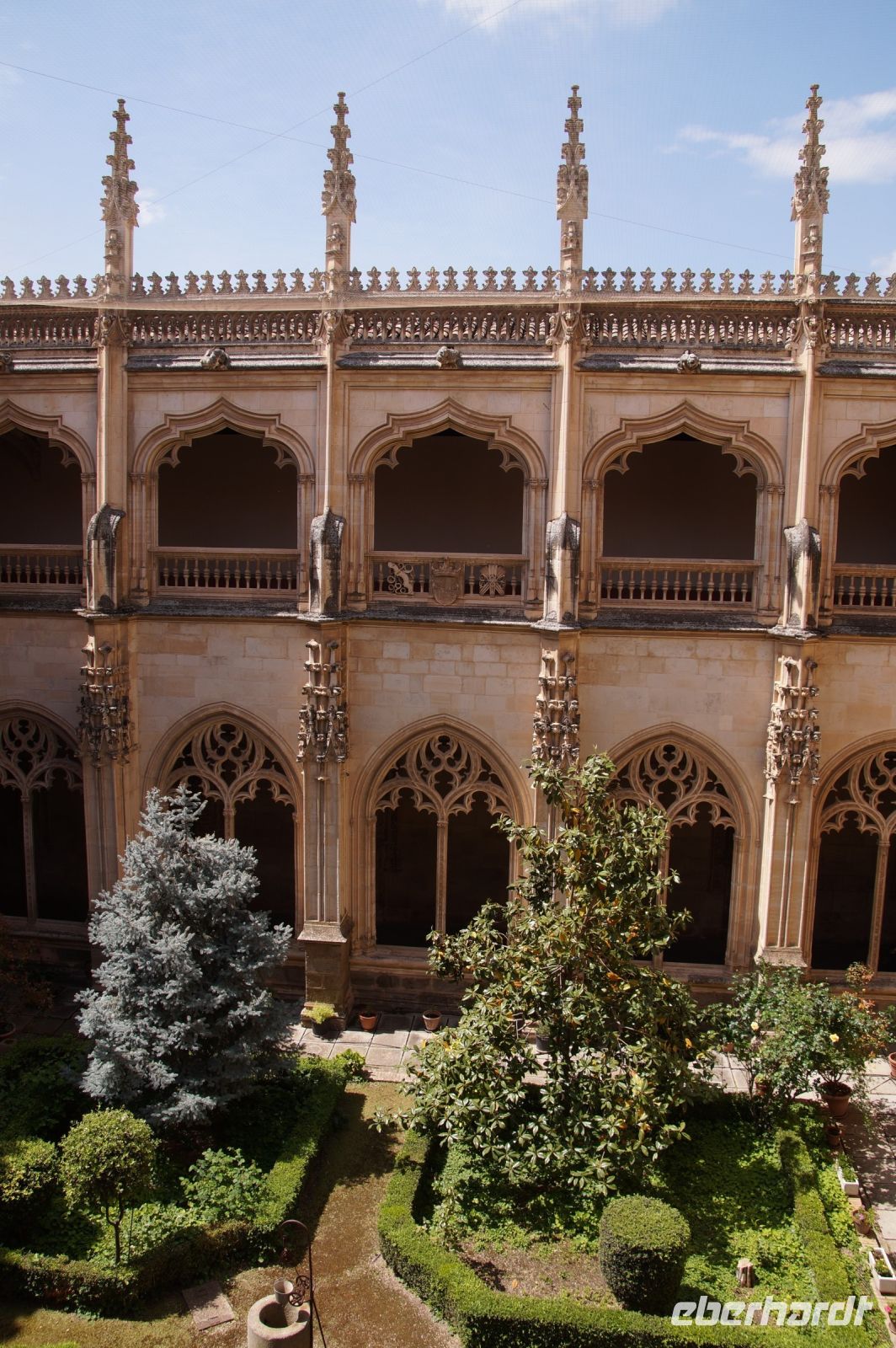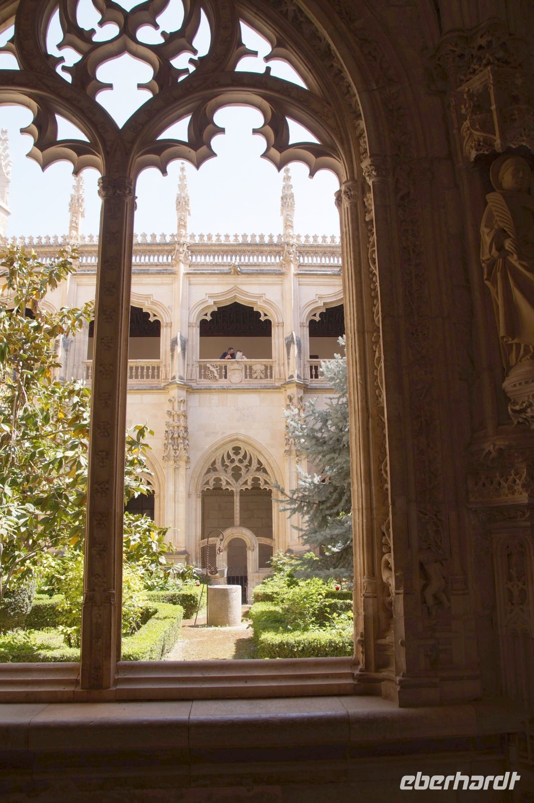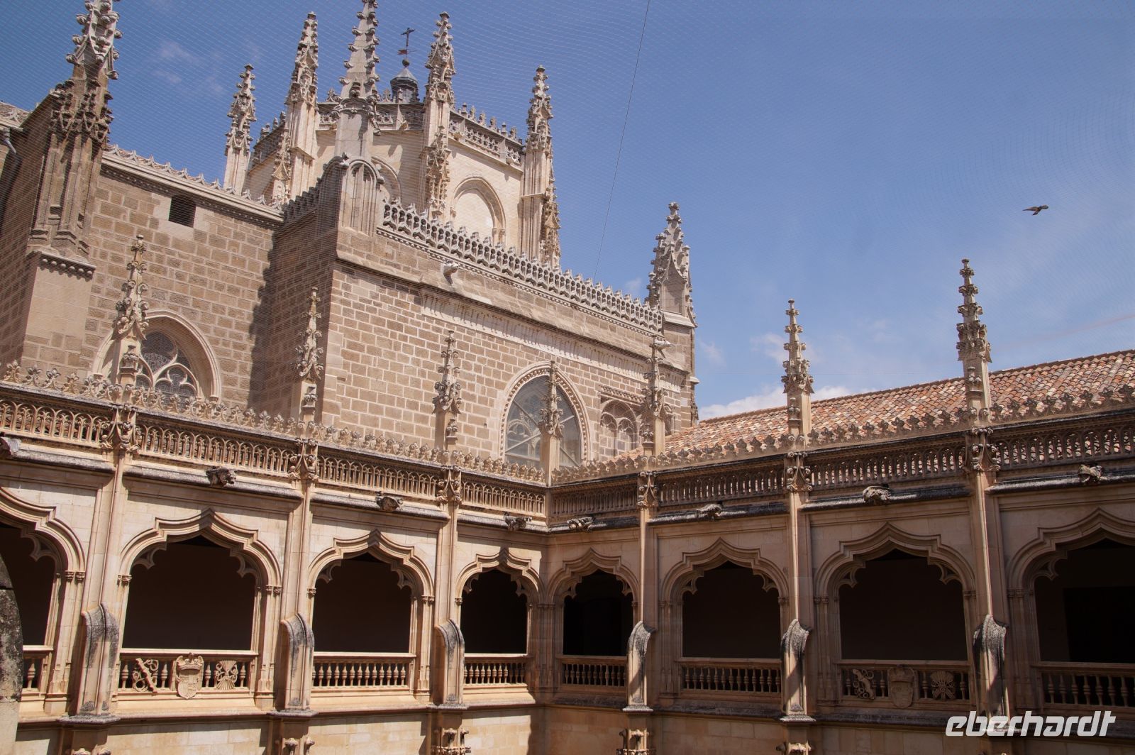 Unser nächstes und als Gruppe letztes Ziel war de Kirche San Juan de los Reyes (Hl.Johann der Könige), die von den Katholischen Königen zunächst als Grablege geplant war. Abundant ihre Wappen mit dem Adler dem Joch (Yugo für Y = Isabell) und den Pfeilen (Flechas für F = Fernando). Auch das Patrozinium der Kirche - San Juan, nach dem Evangelisten - war programmatisch, hießen doch Sohn und älteste Tocher Juan und Juana (Johann und Johanna), die mit den Kindern des Kaisers Maximilian, Phillip und Margarethe verheiratet wurden.