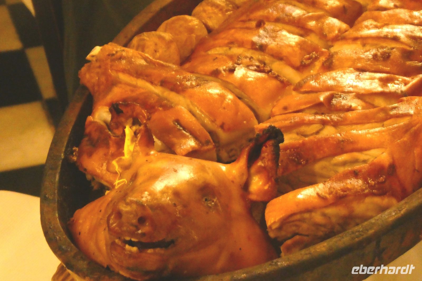 Kurz vor dem Abendessen treffen wir uns wieder und laufen gemeinsam zu einem der ältesten Restaurants der Stadt, dem "El Botin". Hier bekommen wir das traditionelle Essen gegrilltes "Spanferkel", welches gut zubereitet fast allen mundet. Ein mächtige Nachspeise schließt auch den letzten leeren Winkel des Magens.