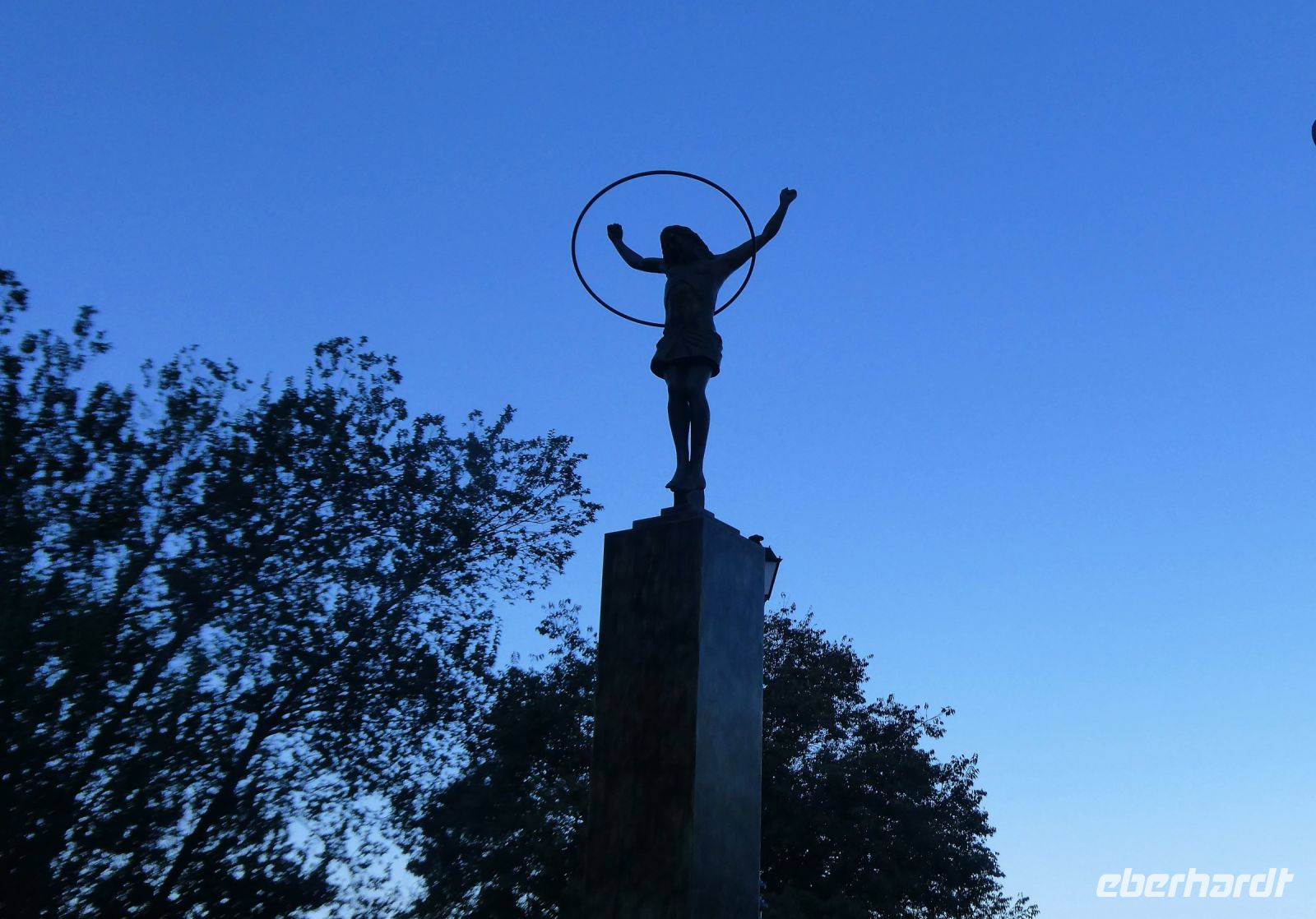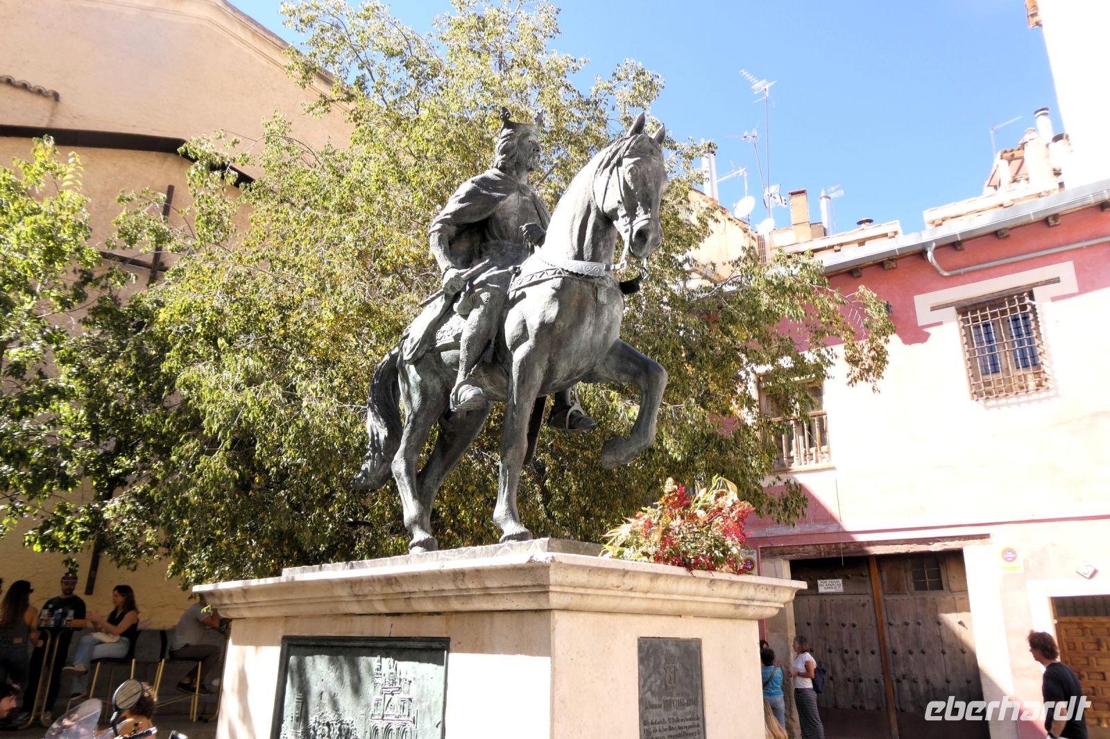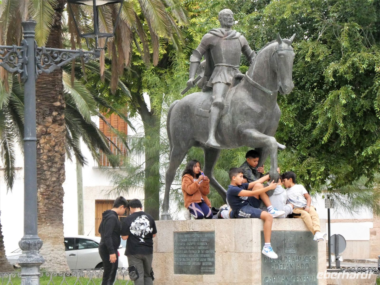 Die Reiterstatue von Almagro wird am Abend von einer Schar Kinder besetzt, offensichtlich ein Treffpunkt der Jugend.