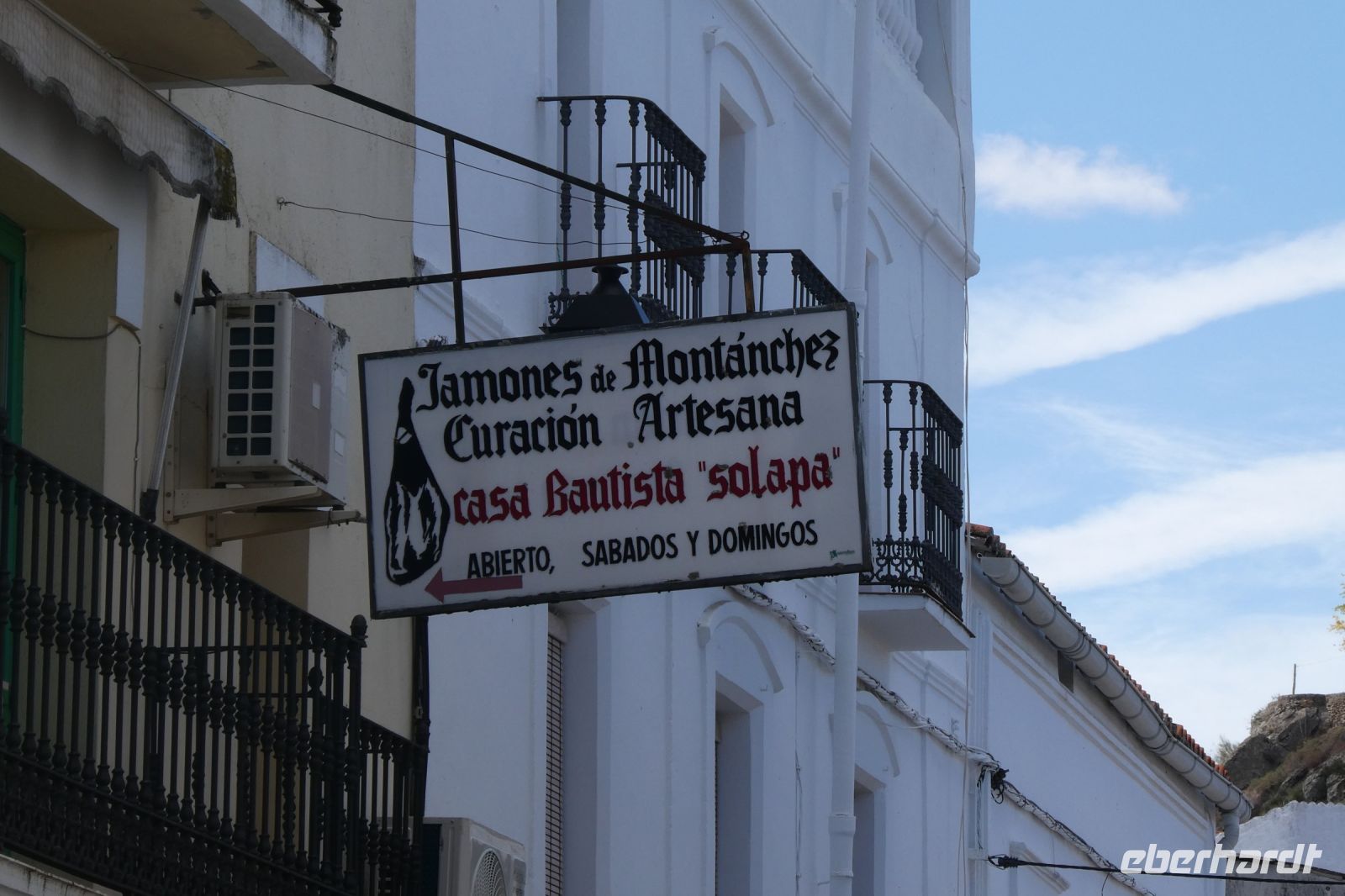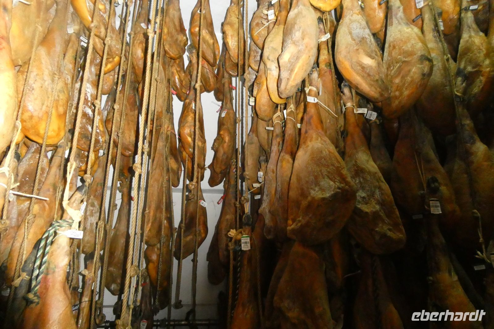 Um die Mittagszeit kommen wir in Montánchez an und müssen zu unserem Schinkenbetrieb noch ein Stück laufen. Wir melden uns im Geschäft und werden dann zu einer weiteren Tür gebeten, wo uns ein netter Spanier empfängt der uns das Verfahren des Schinkenmachens erklärt.