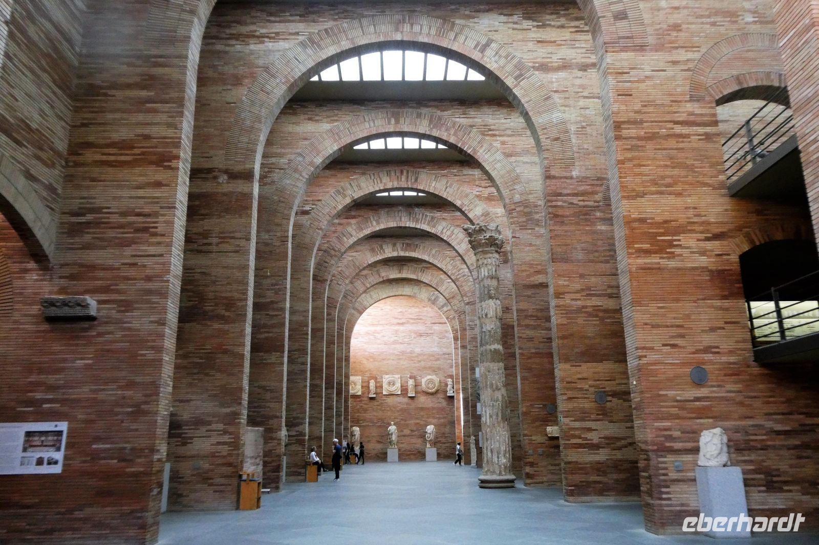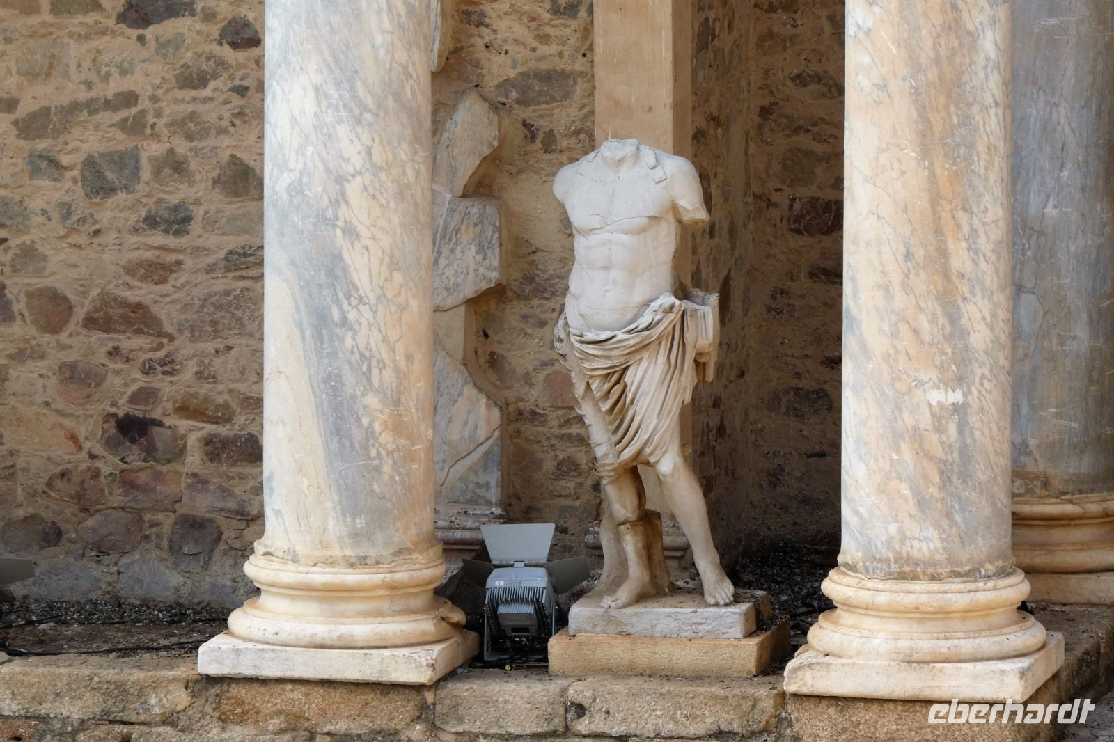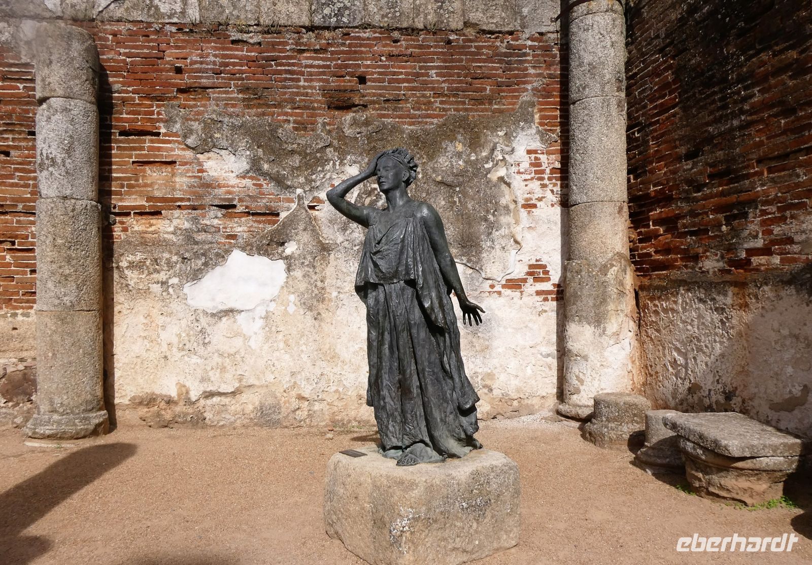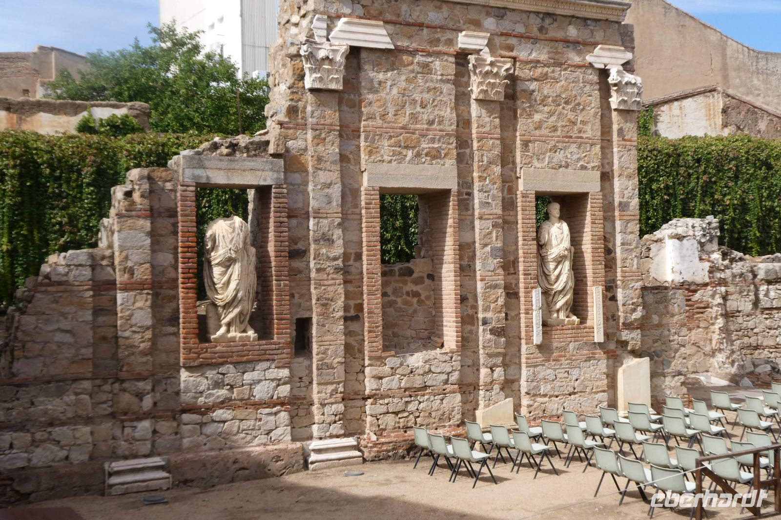 Die römische Brücke ist mit 755 m eine der längsten aus der Antike erhaltene Brücke. Nachdem wir in unserem Parador mitten in der Stadt eingecheckt haben, treffen wir unseren Stadtführer Javier, der uns in den folgenden 3 Stunden sein Wissen über die römische Antike ausbreitet. Er ist eigentlich für 2 Stunden gebucht, aber die Geschichte scheint ihn zu faszinierten und so sehen wir mit ihm den Trajansbogen und den Diana-Tempel. Natürlich darf in einer römischen Stadt ein Theater und ein Amphitheater für die Gladiatorenkämpfe nicht fehlen. Als Krönung des ganzen gehen wir auch noch in das Museum, welches durch seine schlichte aber beeindruckende Halle besticht. Hier kommen die römischen Exponate so richtig zur Geltung. Außerdem ist es hier weniger heiß als draußen. Hier im Museum verabschiedet sich Javier, den wir morgen früh noch einmal treffen werden. Jetzt haben wir Freizeit was jeder unterschiedlich nutzt.