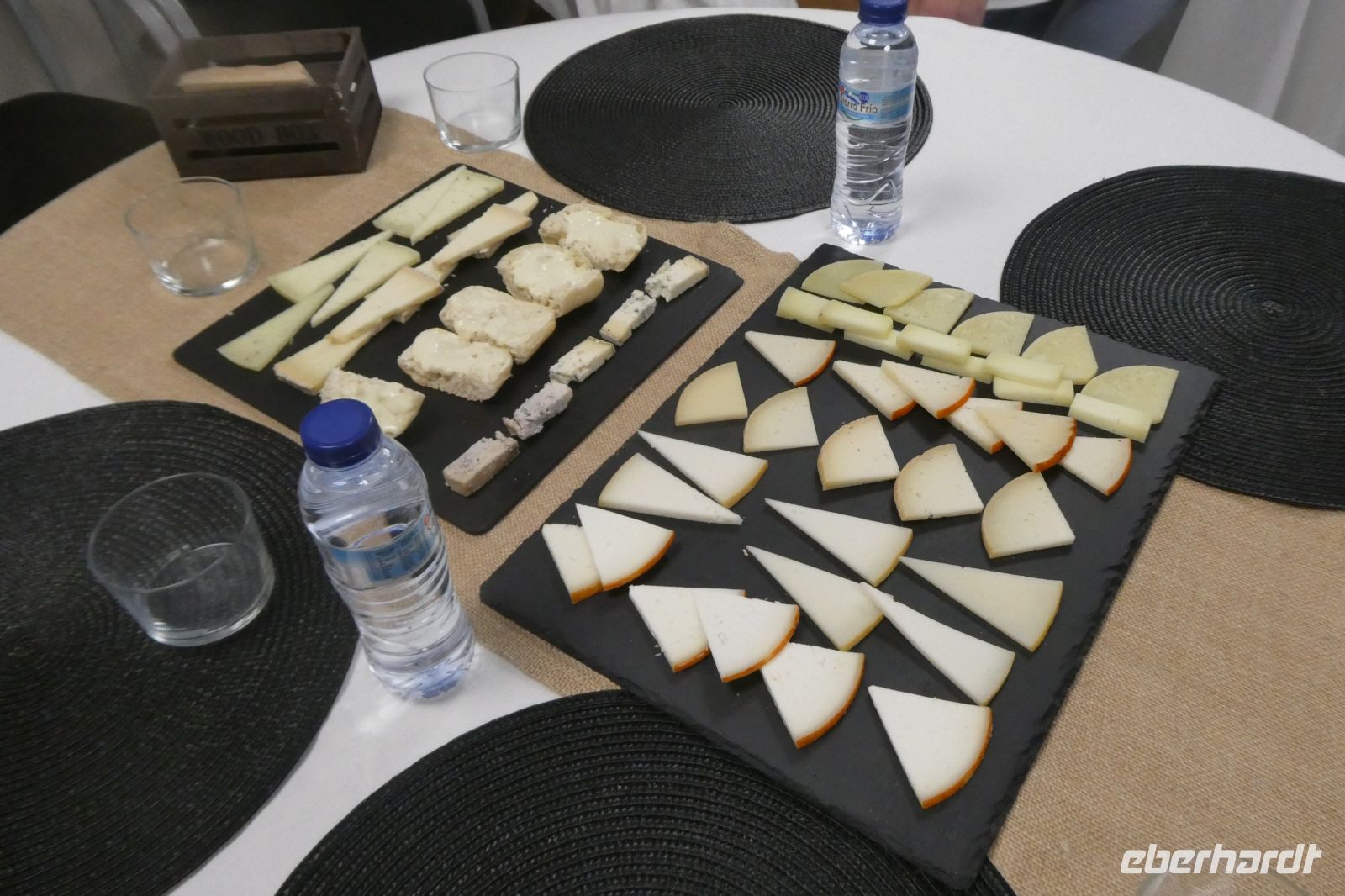 Dann bei der Käste-Verkostung bekommen wir eine ganze Palette unterschiedlicher Käse zu kosten. Es gibt sogar den passenden Wein dazu.