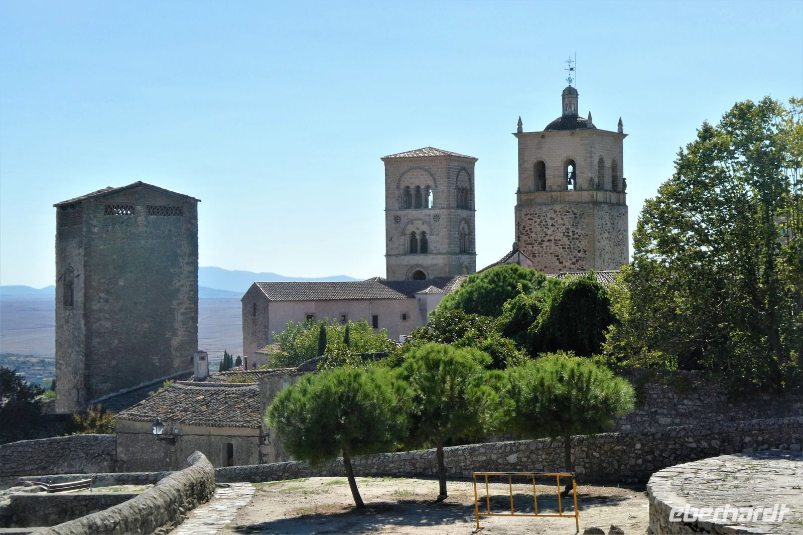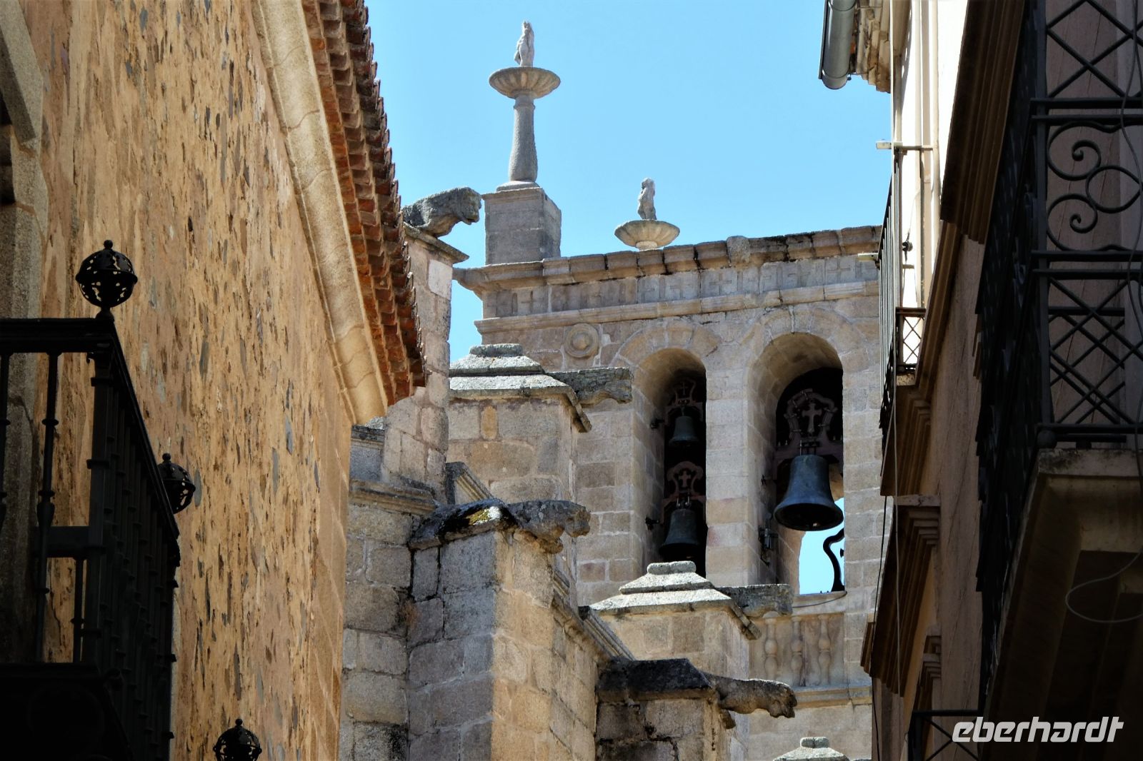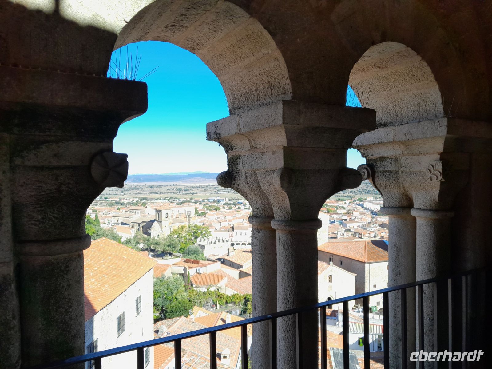 Trujillo war Heimat der Familie Pizarro die einen der gefürchtetsten Eroberer der Neuen Welt hervorbrachte. Um in die Innenstadt an die Plaza Mayor zu kommen müssen wir noch ein Stück zu Fuss laufen. Dort entscheidet sich der größte Teil der Gruppe an der Plaza zu bleiben. Der Rest unternimmt den Anstieg zum älteren Teil der Altstadt und zum Alcázar, der auf arabischen Fundamenten errichtet wurde. Leider öffnet das Bauwerk erst um 17.30 Uhr. Da wir die Aussicht ja schon genießen ohne das Gebäude zu besichtigen, lädt uns unsere Reiseleiterin in die Kirche Sta. Maria La Mayor ein, eine dreischiffige Kirche aus dem 13.Jahrhundert mit 2 Türmen von denen wir einen besteigen. Hier eröffnet sich ein toller Blick auf die alte Stadt und die Umgebung, allerdings müssen wir vorher alle Stufen hinauf bewältigen. Ohne Fleiss keinen Preis. Es hat sich gelohnt.
