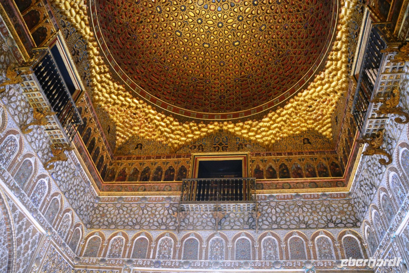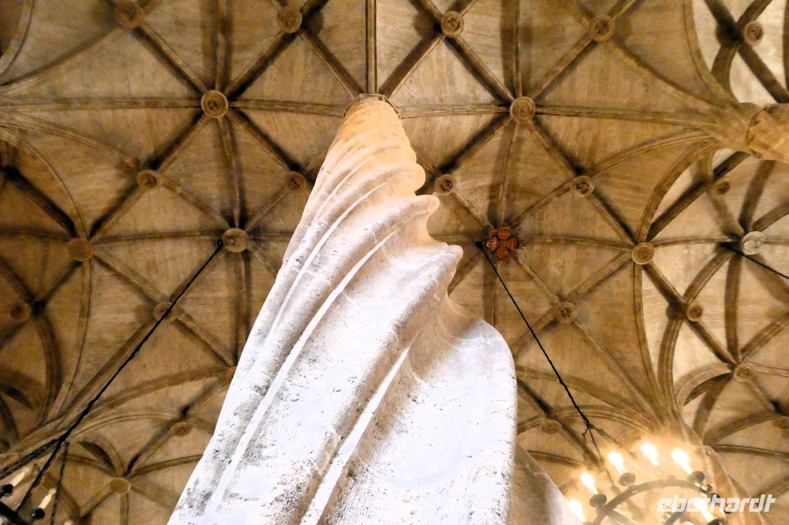 Hier im Palast verabschiedet sich unsere Stadtführerin von uns und wir sind auf uns allein gestellt. Einige besuchen die berühmte Kathedrale von Sevilla. Hier an dieser Stelle errichteten im 12.Jahrhundert die Almohaden, die Berberdynastie aus Nordafrika eine Moschee. Übrig sind heute nur einige Reste und Teile des einst maurischen Minaretts, welches man heute Giralda nennt. Man kann dort hinauf laufen und hat einen guten Blick auf die Stadt. Auch heute noch könnte ein Muezzin mit Maultier diesen Glockenturm erklimmen, allerdings trifft man heute hauptsächlich Touristen die sich Sevilla von oben anschauen wollen. Wir bewundern die Ausmaße der Kathedrale, ist sie doch eine der Größten der Welt.