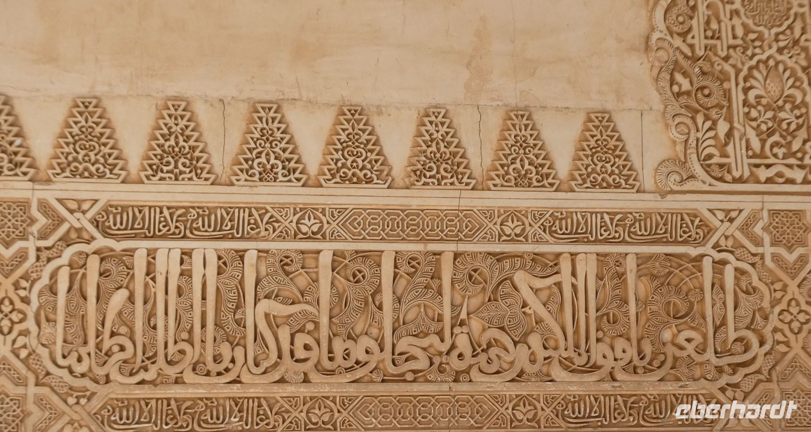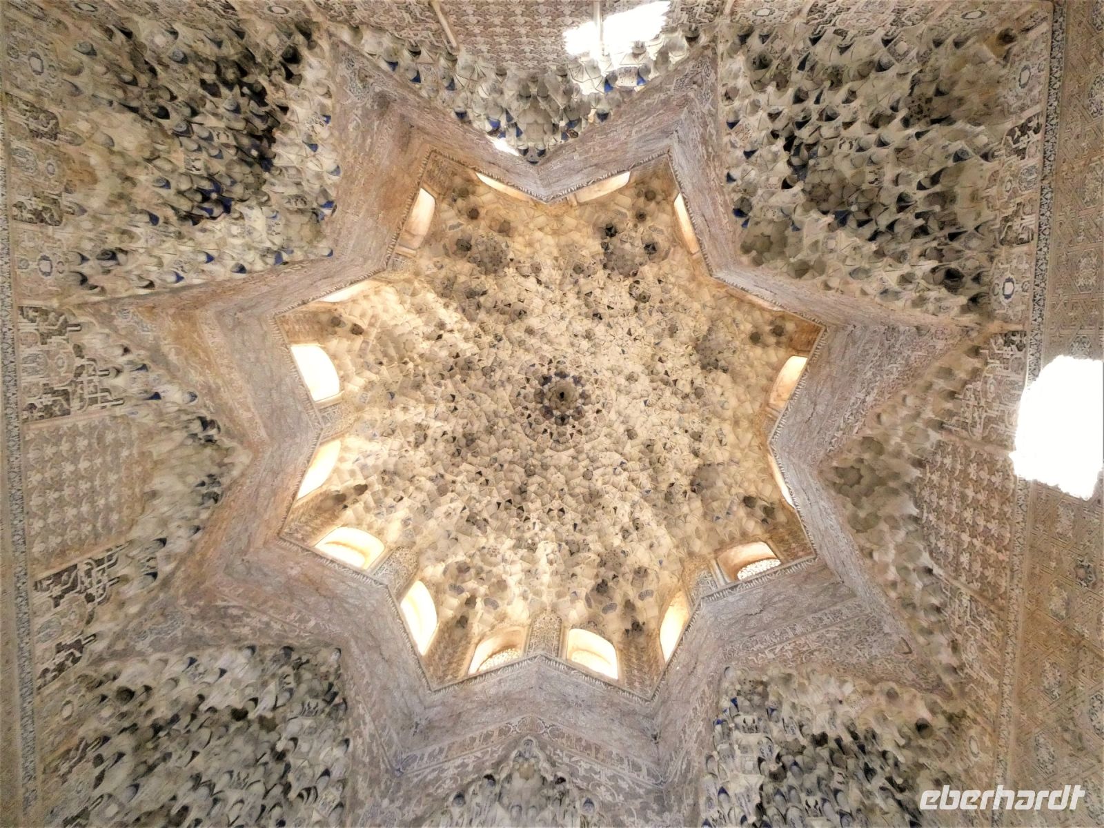 Dann aber betreten wir den eigentlichen Palast. Eine Pracht an geometrischen Formen, Säulen und Stuckgewölben empfängt uns. Karin erklärt uns die Zahlenmystik und die Geometrie der Araber mit der Quersumme 7, eine der bedeutenden Zahlen im Islam.