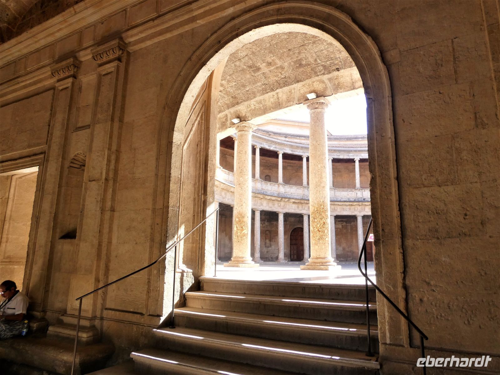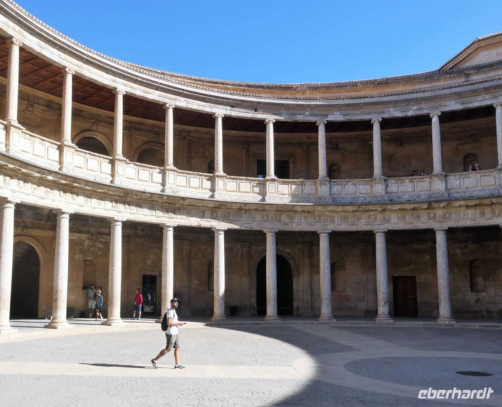 Am Abschluss betreten wir noch den Palast von Karl V., innen ein Rundbau der zwar mit schönen Marmorsäulen ausgestattet ist aber eine gewisse Kälte ausstrahlt. Er wurde allerdings erst lange nach dem endgültigen Untergang des Nasridenreiches errichtet und wurde wohl von Karl V. nie benutzt.