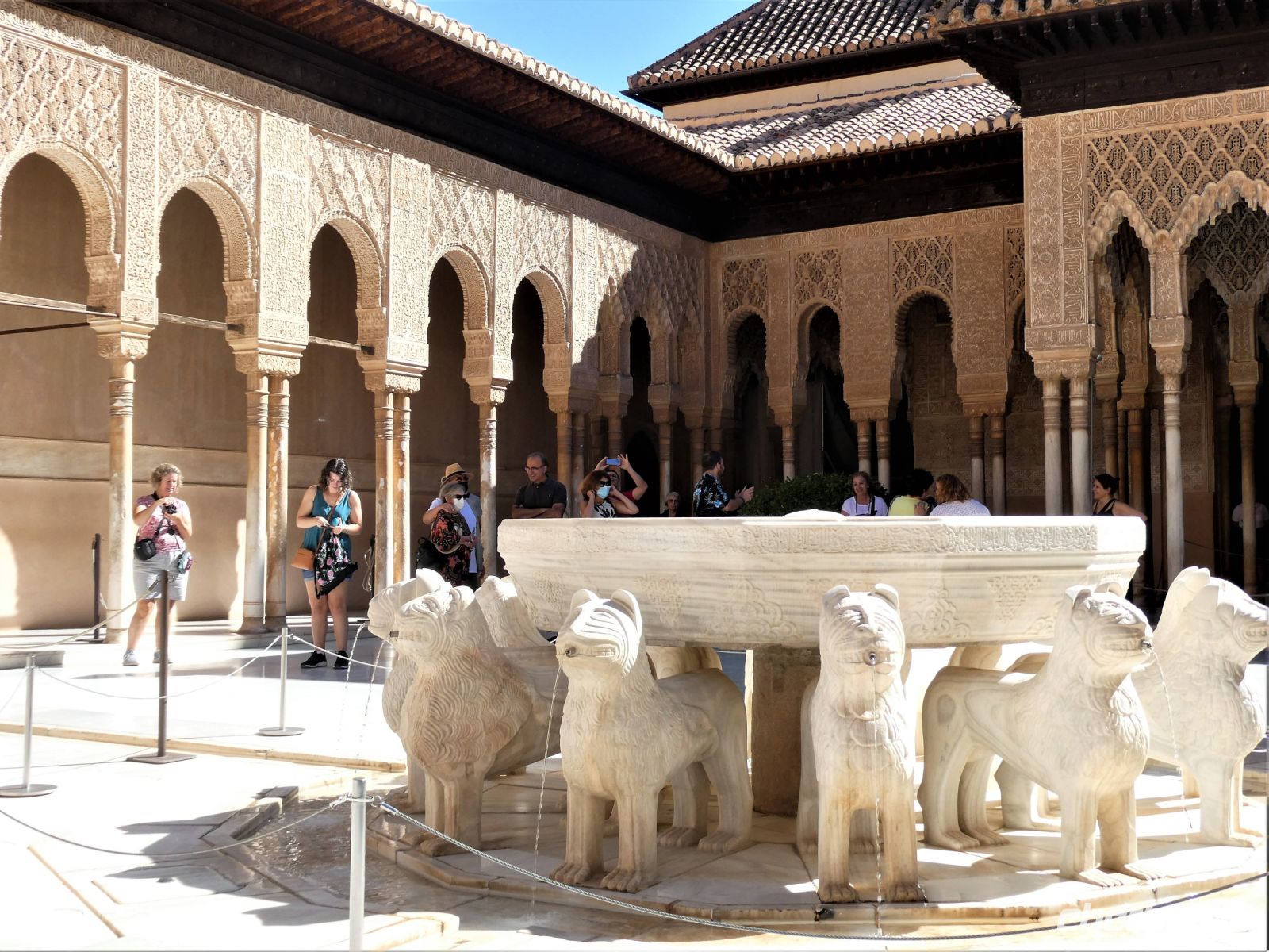 Ein Saal ist schöner als der vorhergehende. Alles ist eine raffinierte ästhetische Komposition die ihren Höhepunkt im Löwenhof mit dem schönen Springbrunnen hat. Von einem Balkon können wir die verschiedenen Stadtteile Granadas überblicken. Der Sacromonte mit seinen Tablaos und Höhlenwohnungen ist ebenfalls von Weitem zu erahnen.