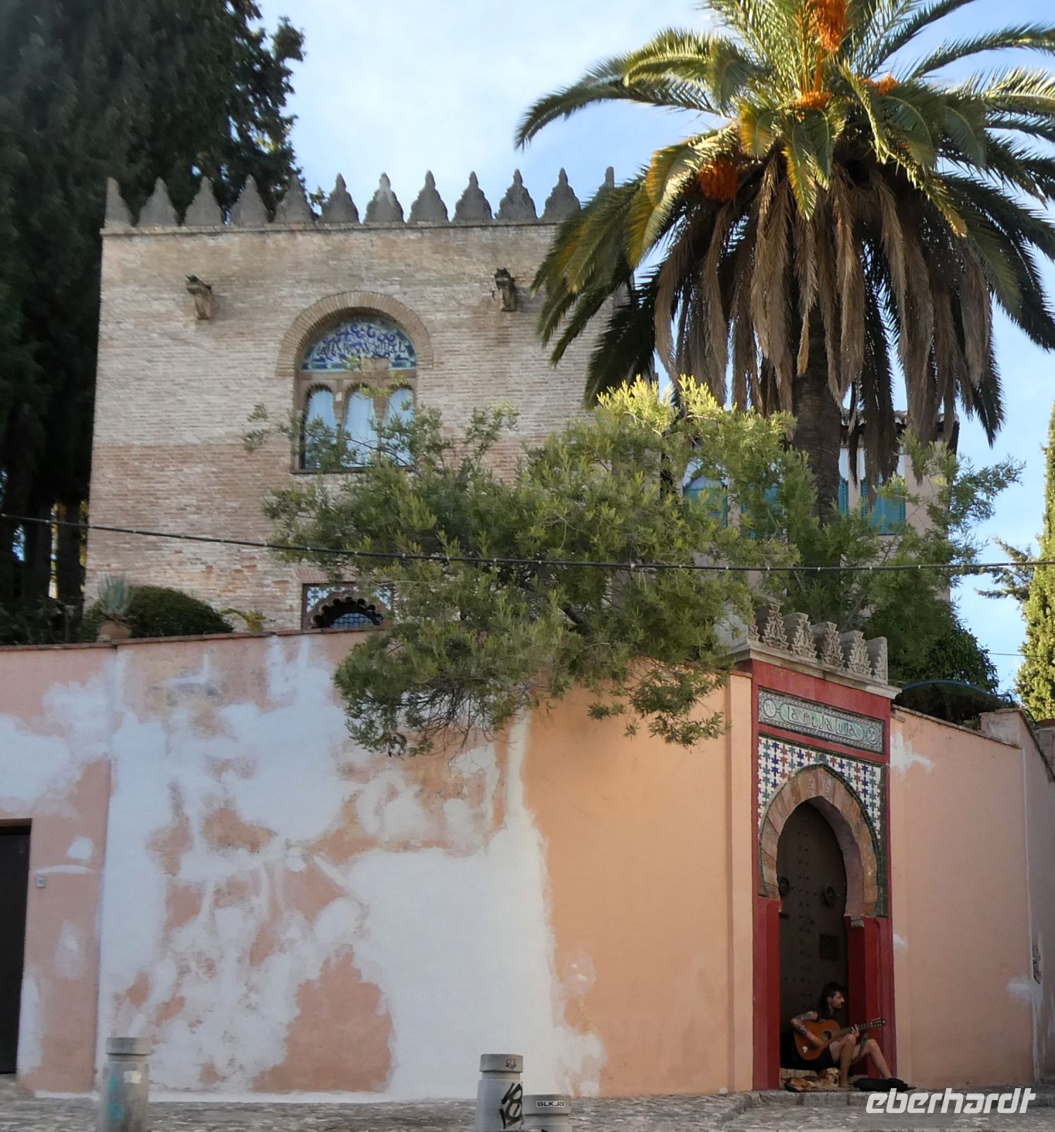 Am Nachmittag als es etwas kühler ist, beginnen wir unseren Spaziergang am Eingang des Albaicin, dem Stadtviertel aus der arabischen Zeit. Dieser Stadtteil ist sehr verwinkelt und die engen Gassen bewahrten die Bewohner vor zu viel Hitze. Langsam geht es immer höher bis wir unser Ziel den Plaza de San Nicolas, einem Aussichtspunkt mit dem besten Alhambra-Blick, erreichen. Der Aufstieg hat sich gelohnt. Auf dem Platz treibt sich ein buntes Volk herum und Gitarrenspieler sorgen für Unterhaltung.