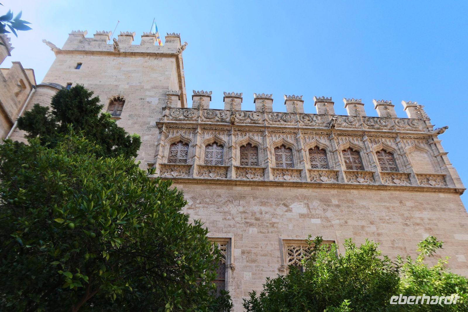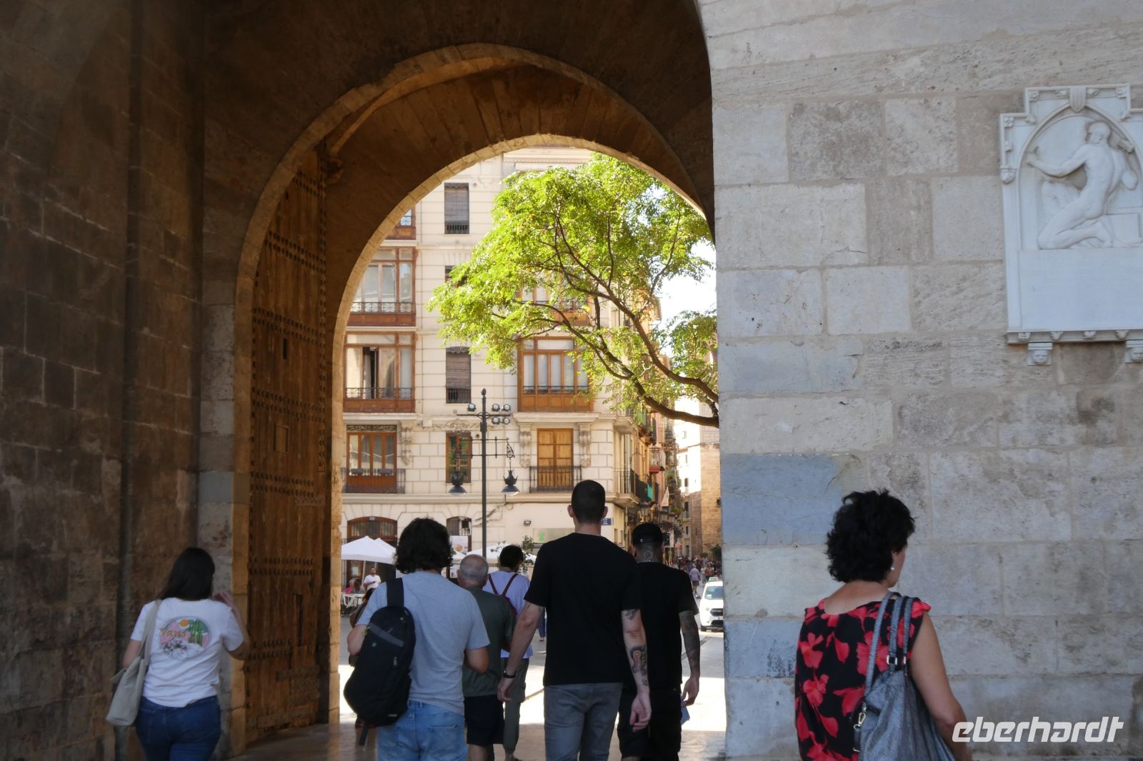 Nach einem kleinen Spaziergang mit technischer Pause auf dem Gelände machen wir mit unserem Bus eine kleine Rundfahrt zum Hafengelände und zu den Stadtstränden Valencias, welche durch gute Verkehrsverbindungen mit der Stadt verbunden sind. Wir umrunden die Altstadt entlang der alten Stadtmauer und beginnen unseren Spaziergang an der Puerta Serranos, einem der alten Stadttore der Stadt, welches zeitweilig als Gefängnis diente.