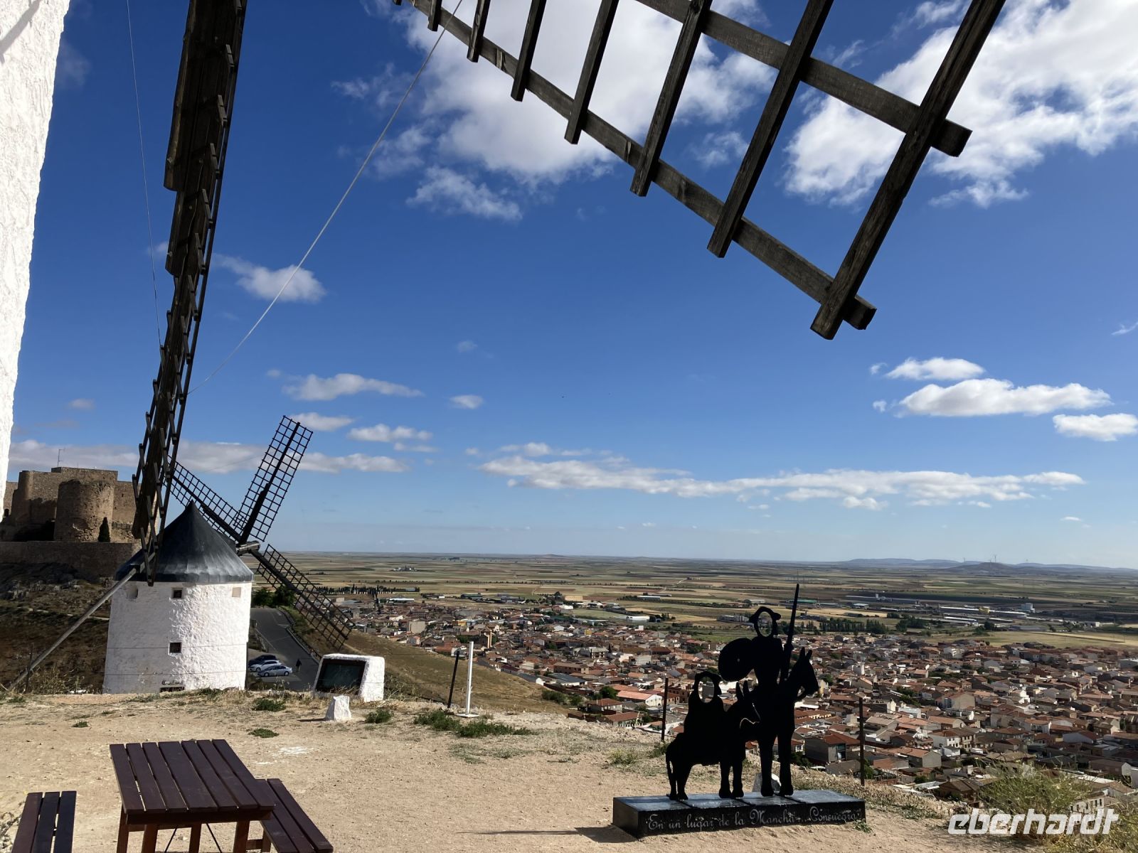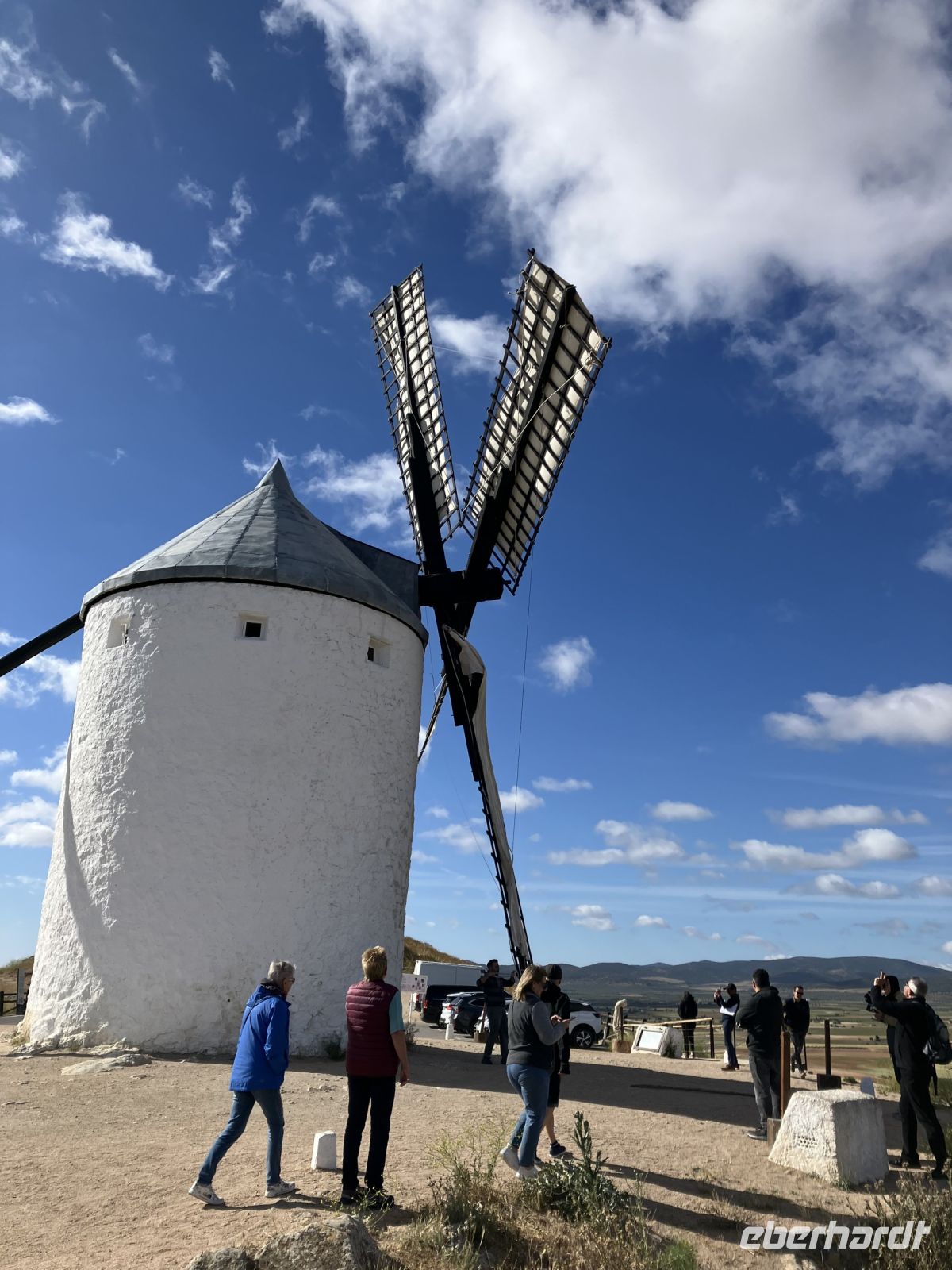 Bei der Fahrt durch die La Mancha, vorbei an kleinen hübschen Bergdörfern, Weinbergen und an den berühmten weißen Windmühlen erwarteten wir fast, dass im nächsten Momente Don Quijote auf seiner Rosinante mit dem tapferen Knappen Sancho Panza um die Ecke käme. Die weißen Windmühlen warteten wie die Riesen in Cervantes Roman auf unser Erscheinen. Den Aufstieg nahmen wir jedoch ohne Pferd und Lanze in Angriff. Bei der vorletzten Turmwindmühle wurden gerade die Segeltücher auf die Gatterflügel gespannt, da auch hier gerade Dreharbeiten beginnen sollten. Fasziniert schauten wir der Arbeit zu. Im Hintergrund standen bereits Pferde mit ihren Reitern bereit – als das Ganze von der lautstarken Ankunft einer asiatischen Reisegruppe abrupt unterbrochen wurde.