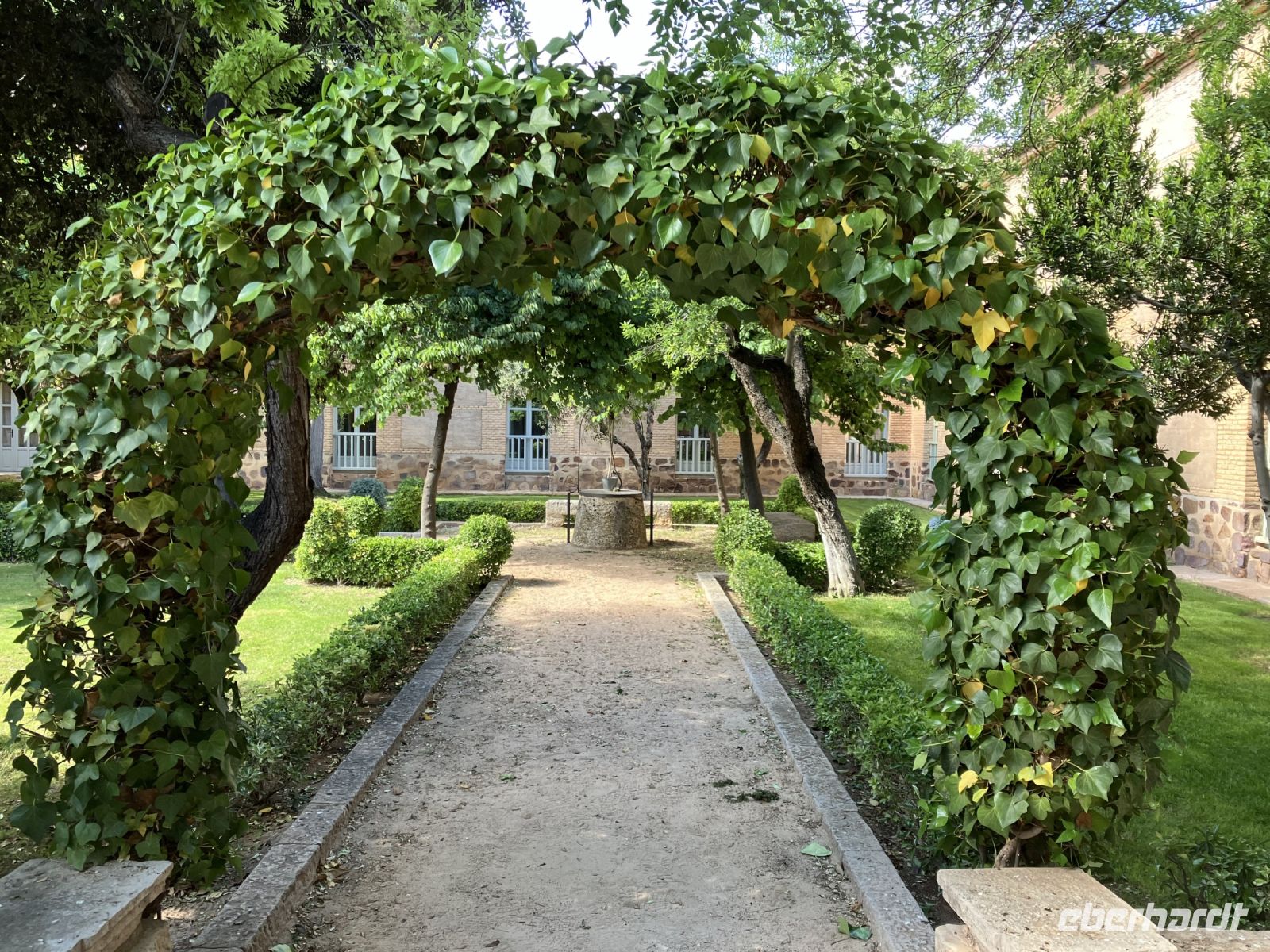 Mit einigen Flaschen Wein im Gepäck setzten wir uns müde in den Bus, der uns zum nächsten Hotel, dem Parador de Almagro, brachte. Das ehemalige Kloster aus dem 16. Jahrhundert erwartet den Gast mit seinen 14 Plätzen der Ruhe, einem gediegenen Ambiente und leckerem Essen. Doch bevor wir uns dem Abendessen widmeten, wollten wir noch unser Soll der 10.000 Schritte pro Tag erfüllen. Fast die ganze Gruppe traf sich zu einem kleinen Spaziergang durch den pittoresken Ort Almagro. Rund um den Hauptplatz stehen Häuser mit grünen Balkonen und auf dem Platz hunderte Stühle, der Cafés und Restaurants, die auf Gäste warten. Doch alles war wie leergefegt und so fragten wir uns, ob hier jemals so viele Menschen ankommen wie Stühle auf sie warten. Bei einem kleinen Spitzen-Klöppelgeschäft schauten wir der kunstfertigen Besitzerin über die Schulter, gingen an der Musikschule vorbei, wo gerade die kleinen Eleven ankamen und bemerkten auf Schritt und Tritt, dass sich in diesem Ort alles ums Theater dreht.
