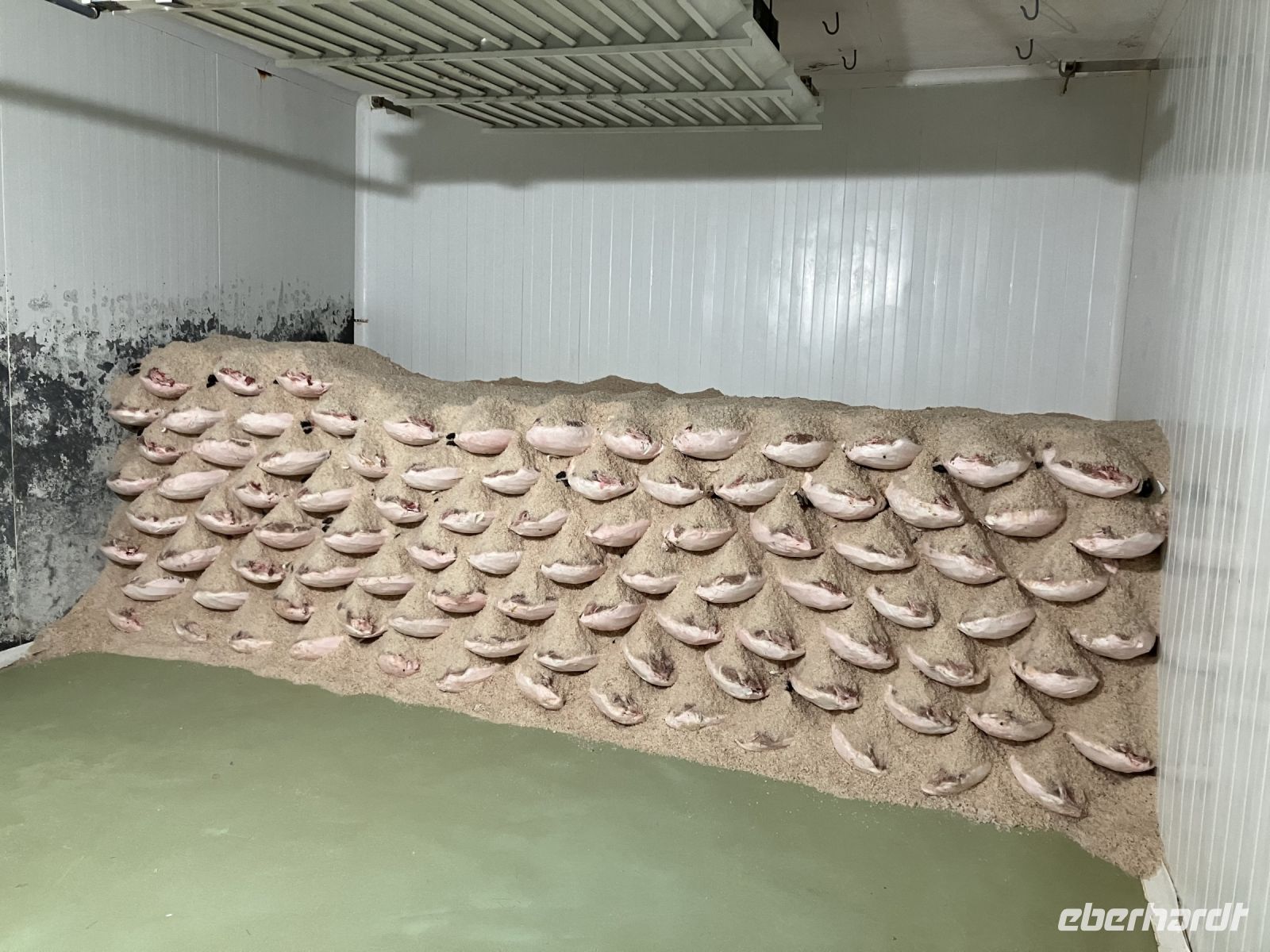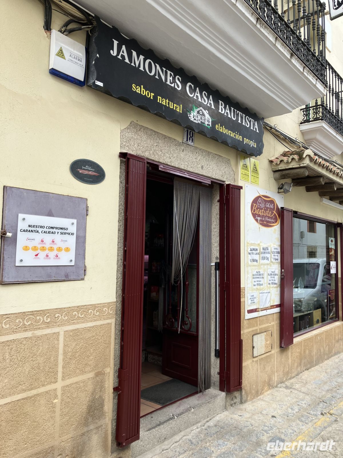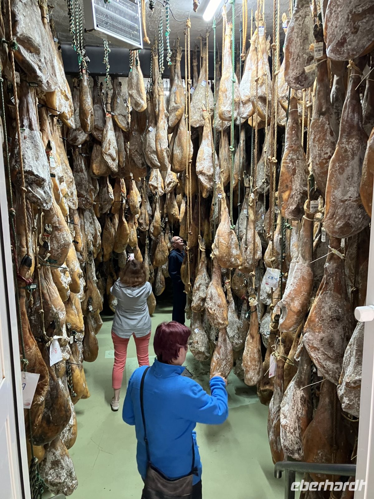 Nun schon zur Routine geworden, zogen wir mit unserer hölzernen Besteckzange Richtung Frühstücksbuffet, um dann gestärkt die Koffer über den Weg mit den runden Steinen zum Bus zu bugsieren. Fröhlich setzten wir unsere Reise in Richtung der Region Extremadura fort. Das liebliche Hügelland zog am Busfenster vorbei, während jeder seinen Gedanken nachhing oder den Ausführungen der Reiseleitung lauschte. Das heutige Ziel war die altehrwürdige Stadt Mérida, welche auch als „spanisches Rom“ bezeichnet wird. Doch vorher wollten wir noch einen kulinarischen Stopp in dem kleinen Ort Montánchez einlegen, der für besten iberischen Schinken bekannt ist. Es ist kein Geheimnis, dass sich viele Familien in diesem Dorf seit Jahrhunderten der Welt des Schweinefleischs verschrieben haben. Es wird angenommen, dass die Bergluft den Schinken hier ihren so charakteristischen und hervorragenden Geschmack verleiht. Wir besuchten die Schatzkammer der Familie Bautista. Don Paco nahm sich ein wenig seiner wertvollen Zeit (denn es wurde gerade alles für das einsalzen vorbereitet), um uns herumzuführen und alles zu erklären. Am Schluss durften wir neben "Jamón Ibérico" auch Chorizo und Käse verkosten. Nach diesem Genuss waren wir sicher, dass es neben der Bergluft auch die Hingabe der Menschen sein muss, die diesen einzigartigen Schinken hervorbringt.