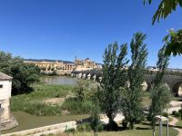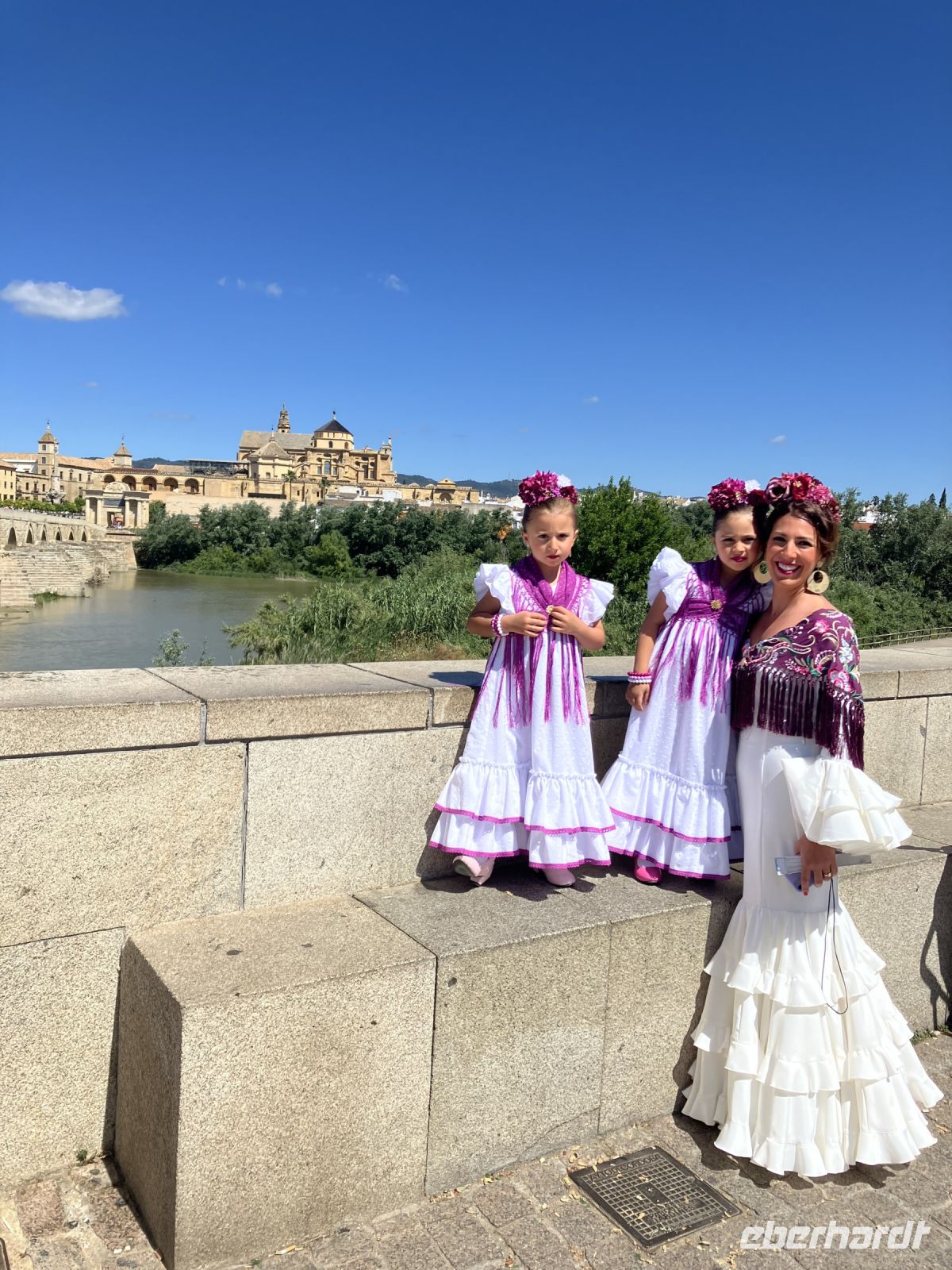 Wir schritten als erstes über die römische Brücke, über die schon zu Zeiten der Römer die Via Augusta verlief, und nahmen das Bild der Altstadt vor der Bergkette Sierra Morena in uns auf. Das Flair wurde vervollständigt von all den Spanierinnen, die in ihren Festkleidern flanierten, denn derzeit fand die traditionelle Feria de Córdoba statt.