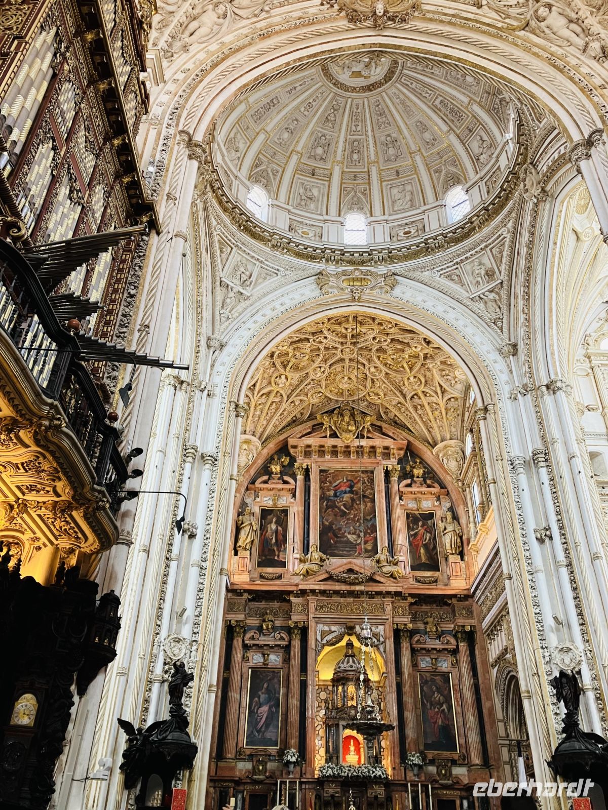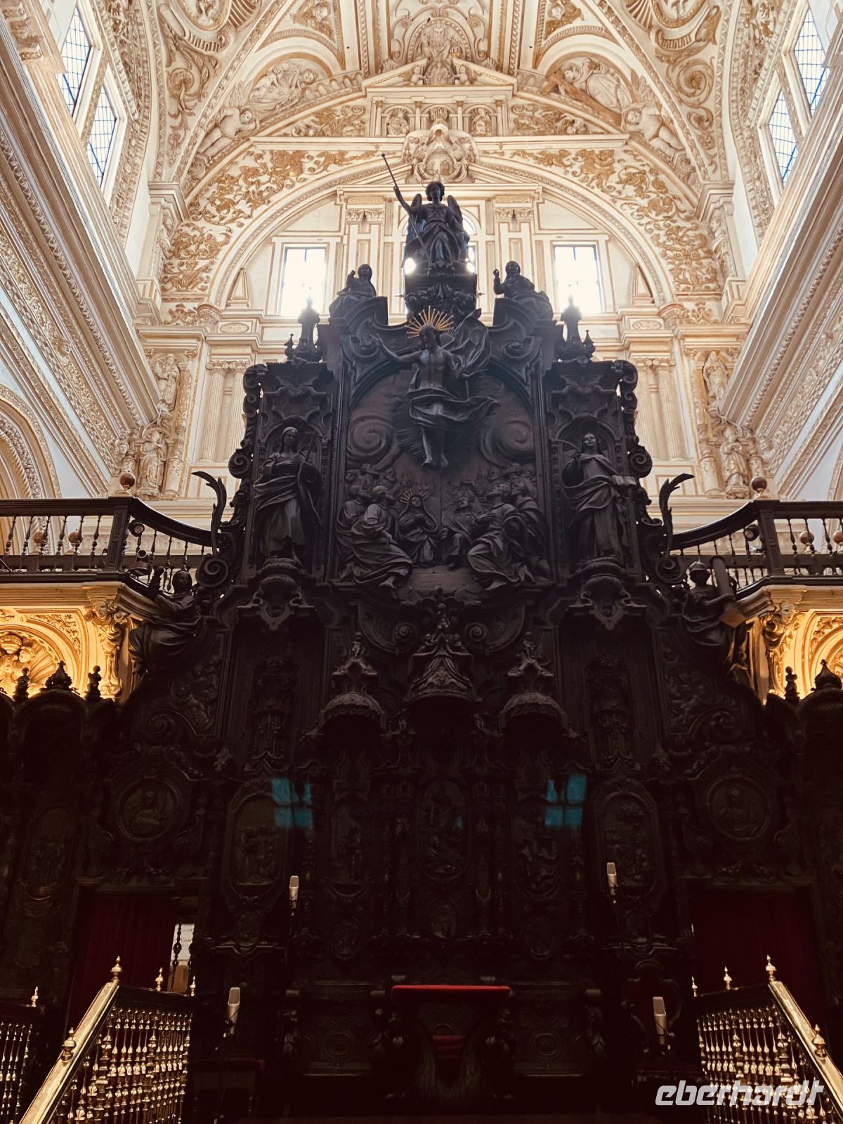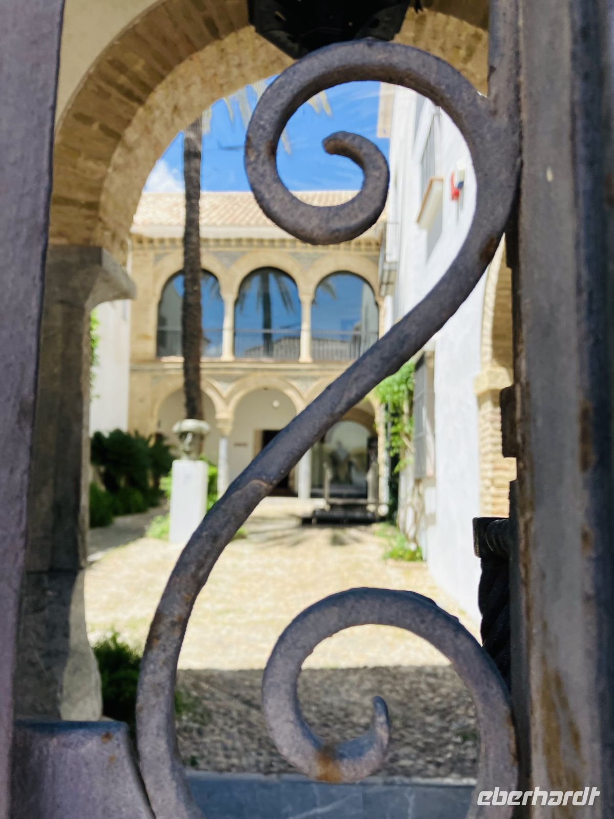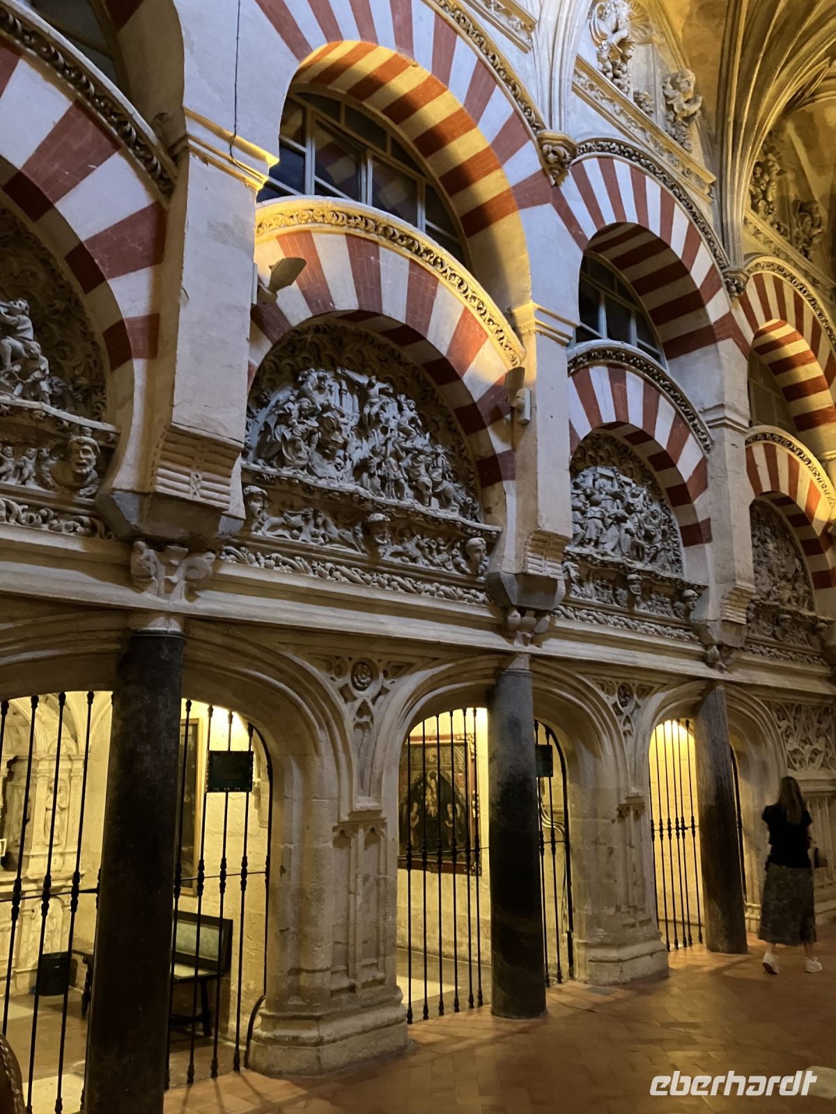 Jedoch begannen wir auch in dieser Stadt erst einmal mit der Kulinarik. Bei einem typischen spanischen Tapas Mittagessen probierten wir verschiedene kleine Leckereien. Gestartet wurde mit einem Tinto der Verano, und der kalten Suppe Salmorejo. Und es wurde weiter aufgetragen: Bacalao, gebackene Aubergine, Schweinebäckchen, Tortilla española und und und. Nur gut, dass der Nachtisch immer für zwei Personen gedacht war. Wie sollten wir uns jetzt nur der Kultur widmen? In diesem Moment wäre die spanische Siesta vielen von uns willkommener gewesen. Doch unsere charmante örtliche Reiseleiterin Inés nahm uns zuerst mit auf einen Spaziergang durch das historische Córdoba mit seinen herrlichen Patios (Innenhöfen) und der maurischen Architektur, die wie aus den Märchen aus 1.001 Nacht wirkt. Der Rundgang führte uns durch das jüdische Viertel, die Juderia von Córdoba, vorbei an den Denkmälern für die Gelehrten Maimonides und Mohamed Al-Gafequi, dem Experten des 12. Jhds. für die Operation von Katarakten. Im Anschluss besichtigten wir die berühmte Kathedralmoschee von Córdoba “Mariä Aufnahme in den Himmel“. Wir wollten herausfinden, ob es eine wirklich gelungene Mischung aus Moschee und Kathedrale ist. Ob dem so ist, darüber bildete sich jeder seine eigene Meinung, jedoch können wir im Nachhinein sagen: Es war beeindruckend zwischen dem Zauberwald aus 850 freistehenden Säulen und rot-weiß bemalten Bögen zu stehen. Auch das Chorgestühl von Pedro Duque Cornejo, das 1757 fertiggestellt wurde, war unbedingt sehenswert. Soviel Detailarbeit! Und obwohl der Künstler Cornejo über ein Jahrzehnt lang ununterbrochen gearbeitet hatte, starb er fast 80ig-jährig nur zwei Wochen vor der Einweihung des Chorgestühls. Noch lange hätten wir in der Mezquita-Catedral verweilen können, doch wir mussten uns schweren Herzens von dem prächtigen Bau verabschieden.