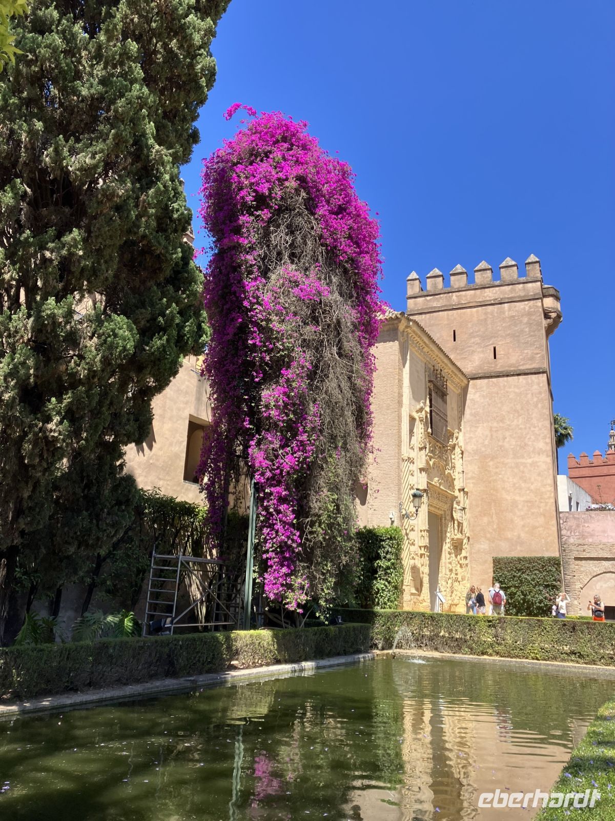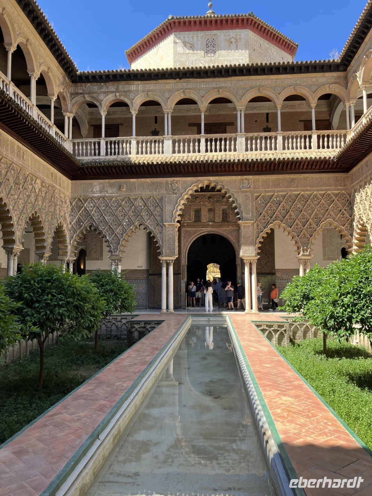 Mit unserer heutigen Reiseführerin Concha bummelten wir vom Spanischen Platz durch die Gärten Jardines de Murillo in das ehemalige jüdische Viertel Santa Cruz. Es gab genügend Pausen zum Fotografieren oder Kaffee trinken, und pünktlich gelangten wir zum Königspalast von Sevilla, den Real Alcázar. „Bitte alle die Ausweise zeigen“ hieß es auch hier; ein Ausspruch, den wir bereits von verschiedenen anderen Sehenswürdigkeiten her, kannten. Die wunderschöne Anlage mit den fantastischen Gärten wird bis heute von der spanischen Königsfamilie, wenn sich diese in Sevilla aufhält, als offizielle Residenz genutzt.