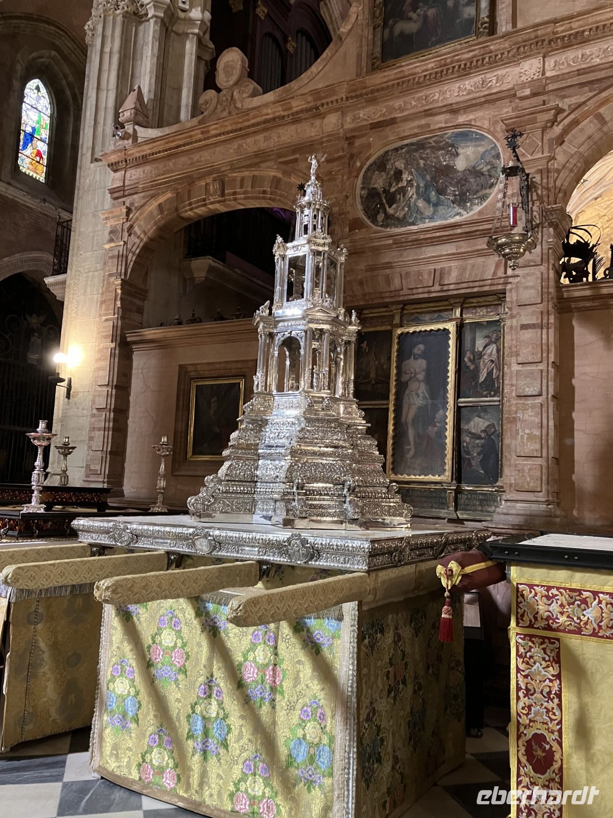 Vorbei flog die sanfte, hügelige Landschaft, tauchte wieder eine der großen Silhouetten eines schwarzen Osborne-Stieres auf und schon erblickten wir am Nachmittag die Stadt Granada, die letzte Bastion des maurischen Andalusiens. Unsere abendliche Erkundungstour führte uns zu Fuß zur Plaza Nueva, der Kathedrale, dem Monument von Königin Isabella mit Kolumbus und dem alten Seidenmarkt. Ein Blick auf die Gesundheits-App zeigte 10.000 Schritte; das Abendessen konnte kommen.