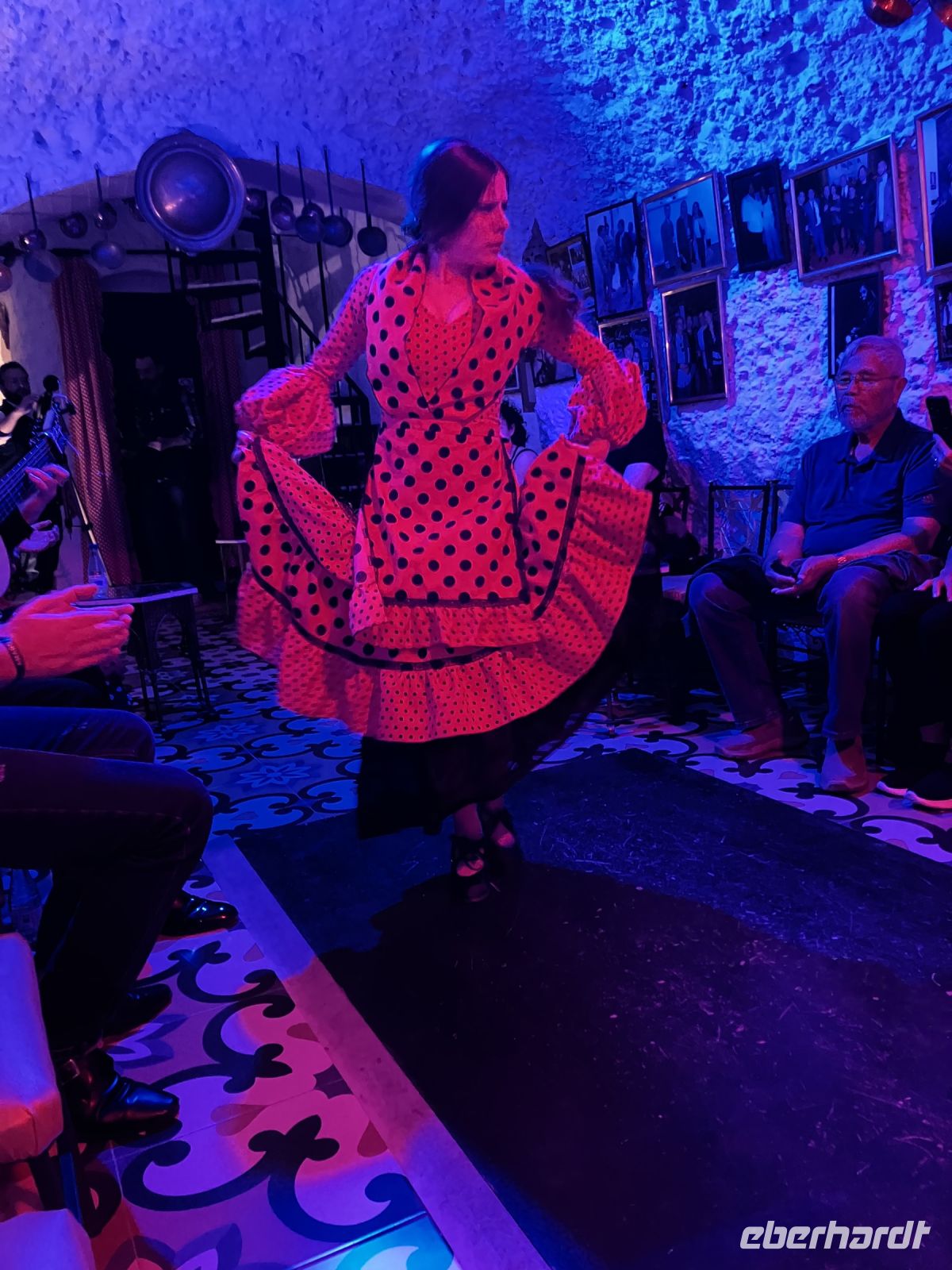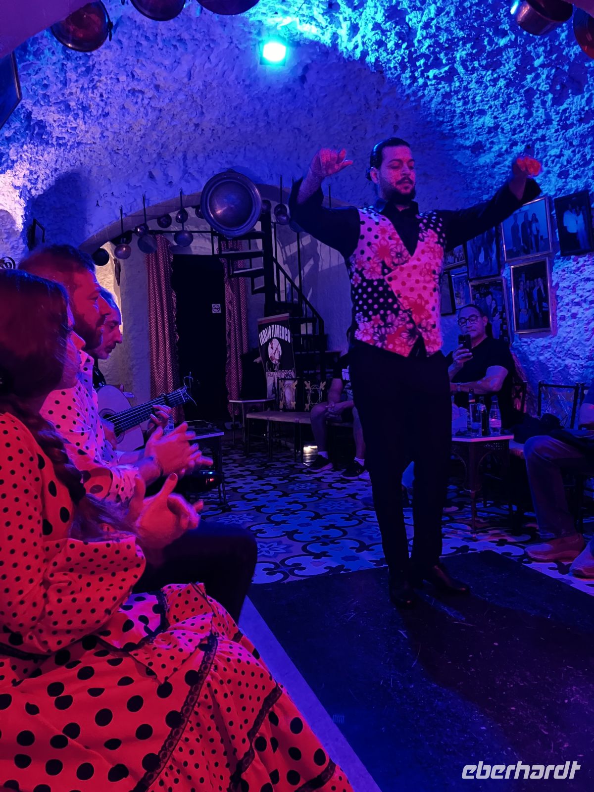 Am Spätnachmittag erreichten wir unser Hotel. Noch ein Stündchen blieb Zeit zum Entspannen. Doch fast die gesamte Gruppe hatte sich auf das Abenteuer Flamenco im Sacromonte eingelassen. Mit den bestellten Taxen fuhren wir ins alte Stadtviertel. Nicht mal jeder der Taxifahrer wusste genau, wie diese Adresse zu erreichen war. Alle kamen pünktlich an und die Show zog uns in ihren Bann. Tanz, Gitarrenmusik und Gesang waren perfekt aufeinander abgestimmt. Zwischendurch lachten die Künstler miteinander und feuerten sich gegenseitig an. Selbst die Skeptiker unter uns ließen sich vom Temperament und der Kunstfertigkeit in dem einmaligen Ambiente mitreisen.