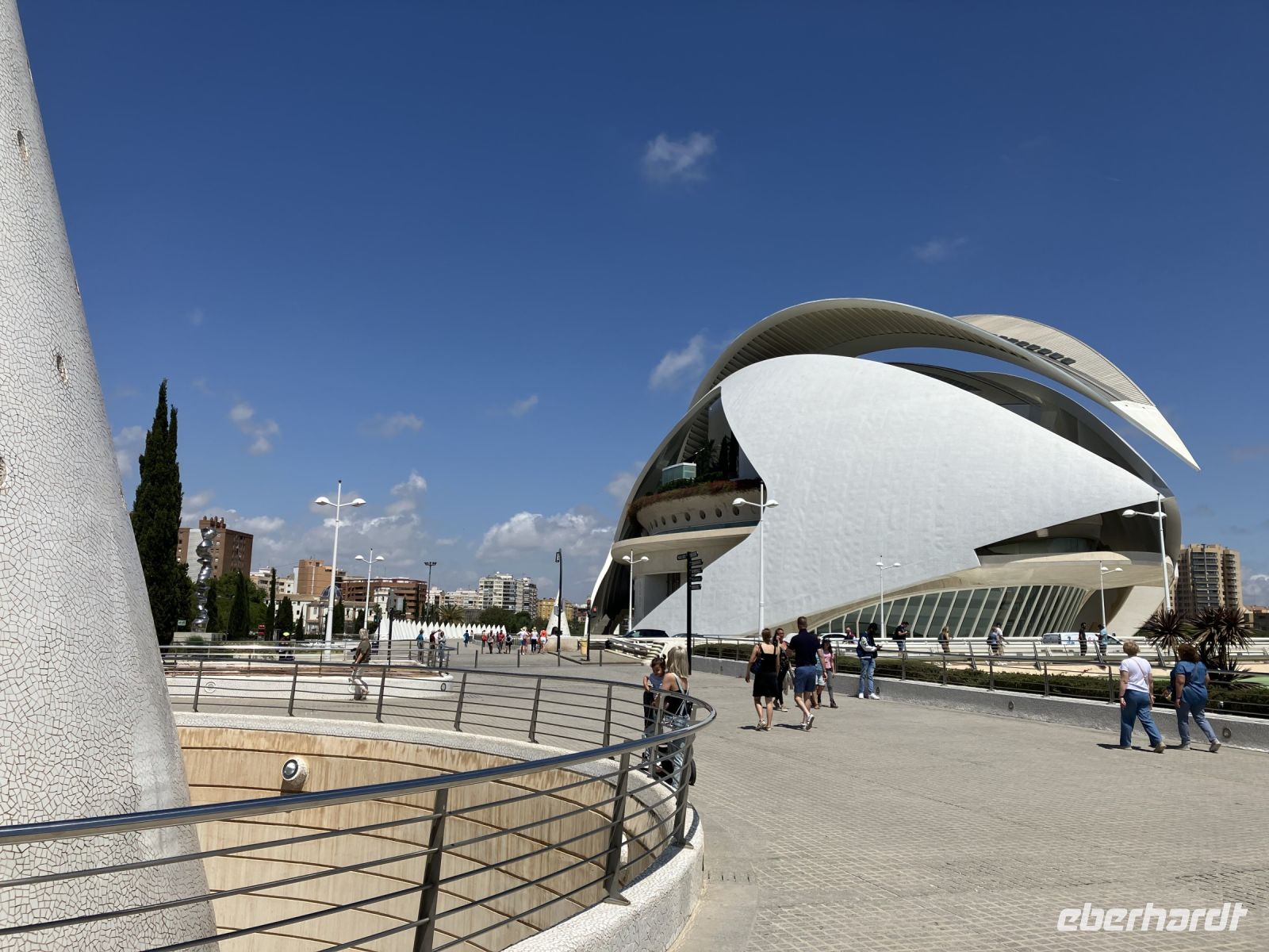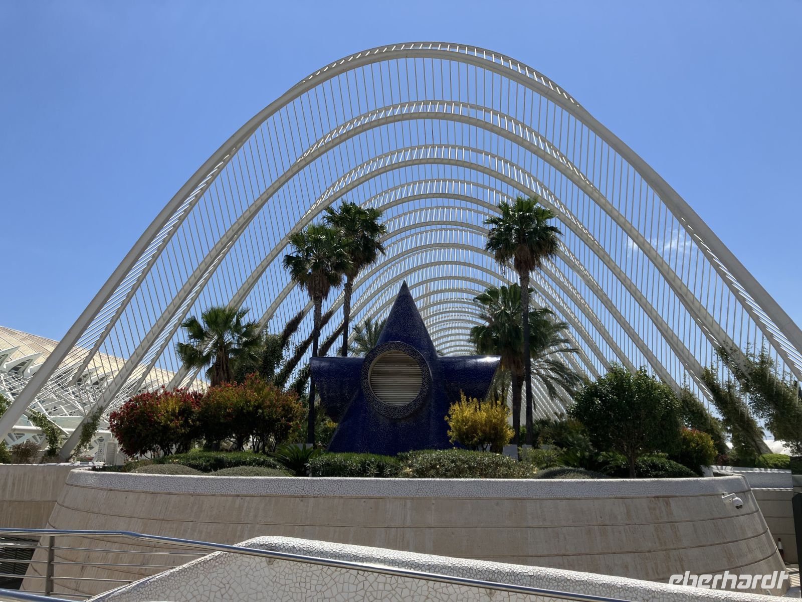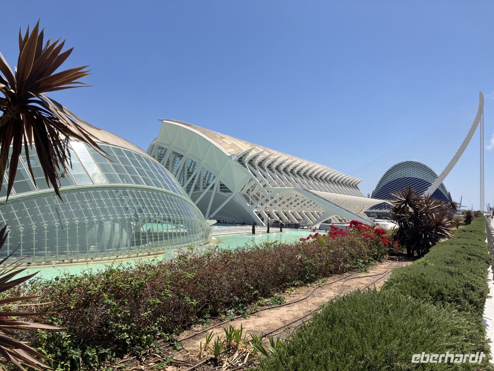 Mit dem Bus fuhren wir entlang des alten Flussbettes, des Turia, erlebten die weiße Pracht der Ciutat de les Arts i les Ciències, der Stadt der Künste und der Wissenschaften. Der kulturelle und architektonische Gebäude- und Parkkomplex wurde zum modernen Wahrzeichen Valencias, entworfen von den spanischen Architekten Santiago Calatrava und Félix Candela.