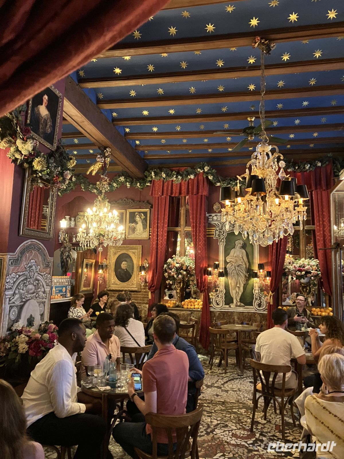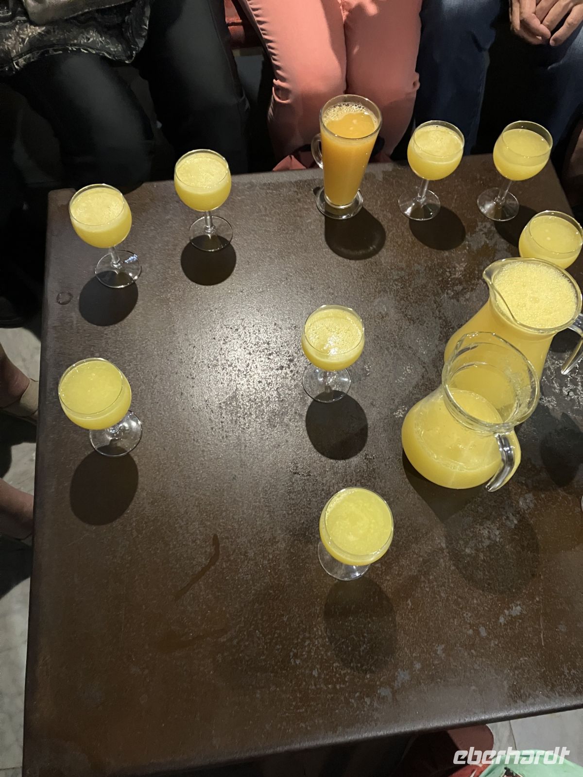 Am Abend reihten wir uns in die Schlange vor der Bar, die uns Jorge am Vormittag empfohlen hatte, um ein wirklich gutes Aqua de Valencia zu trinken. Mit charmantem Lächeln und netten Fragen eroberten wir für unsere Gruppe einen Nebenraum, wo uns drei Krüge dieses Spezialgetränks serviert wurden. Es hatte sich gelohnt; in außergewöhnlichem Ambiente prosteten wir uns lachend zu und genoßen einen tollen Cocktail, der nach Urlaub, Sonne und Apfelsinen schmeckte.