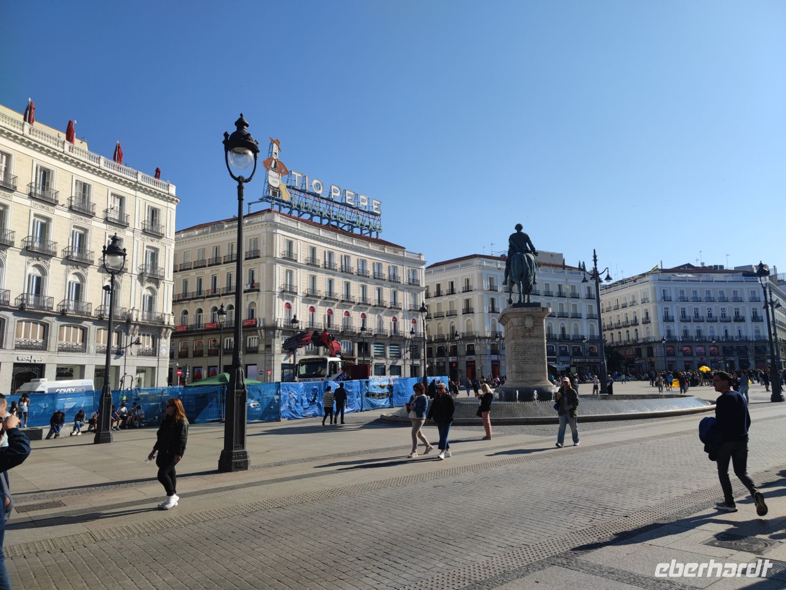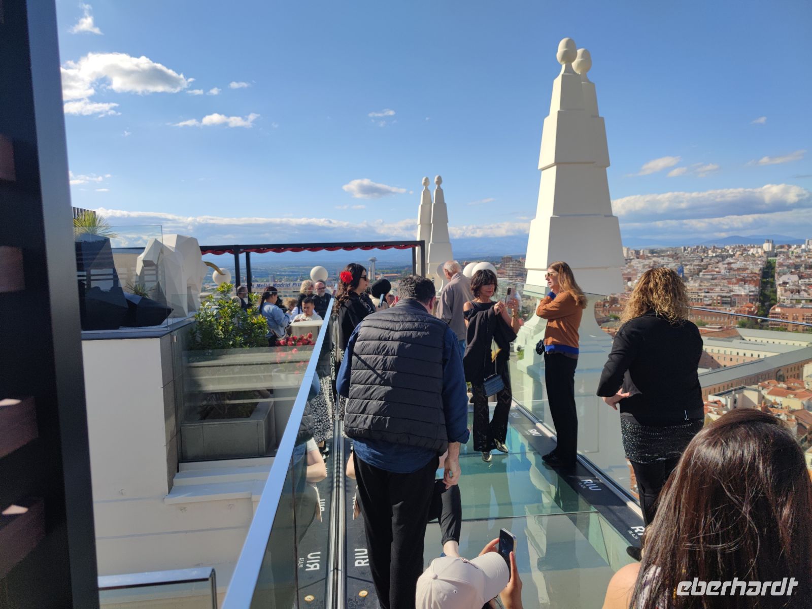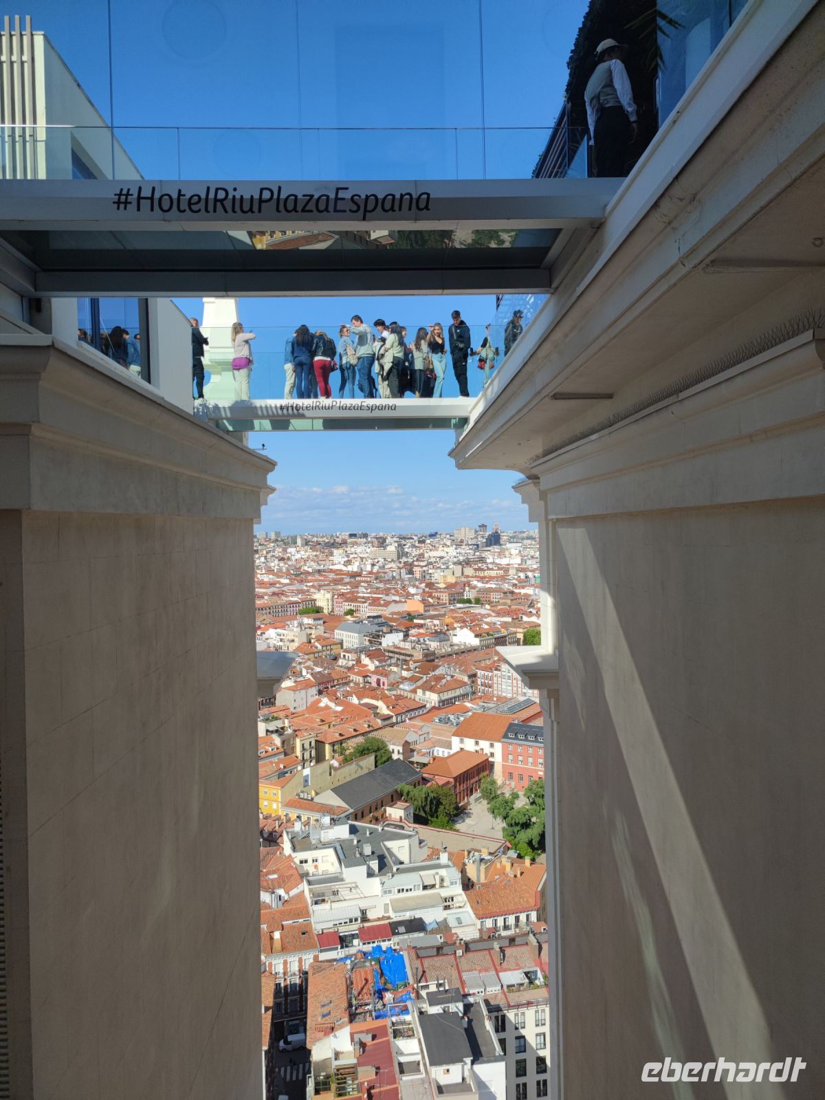 An unserem Anreisetag starteten wir von verschiedenen deutschen Flughäfen nach Madrid und wurden am Flughafen Madrid-Barajas von einem örtlichen Transferunternehmen begrüßt und zu unserem Hotel „Eurostars Casa de la Lírica 4*“ gebracht. Am Nachmittag verabredeten wir uns zu einem ersten gemeinsamen Stadtspaziergang. Wir gingen zum Platz „Puerta del Sol“ und danach entlang der Boulevardstraße „Gran Via“ zum Hotel Riu. Mit dem Fahrstuhl ging es dann hinauf in die 27.Etage zum rooftop, einer Bar mit fantastischem Rundumblick auf Madrid und einer betretbaren gläsernen Bodenplatte für einen Blick in die Tiefe. Anschließend spazierten wir zum „Plaza de España“ und von dort entlang der „Gran Via“ zum Restaurant “La Pecera del Circulo“.