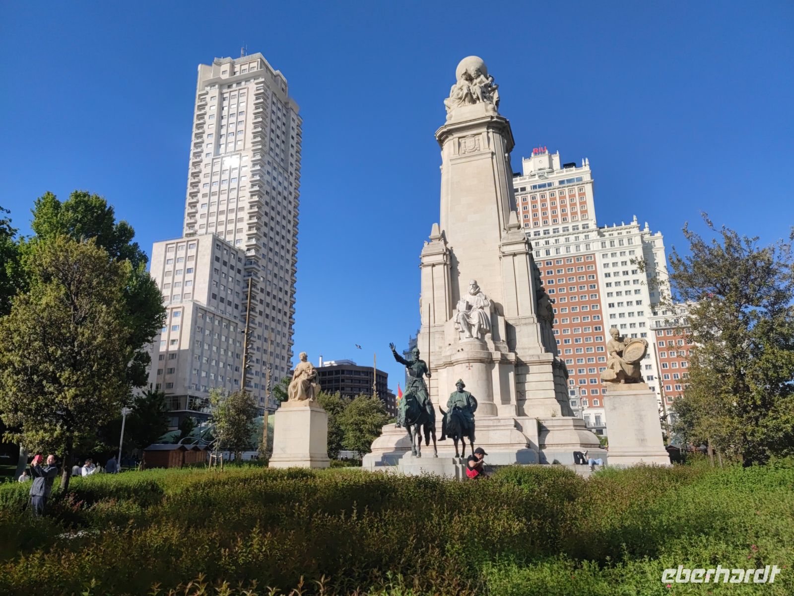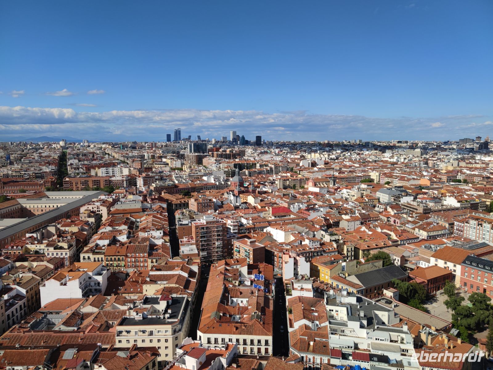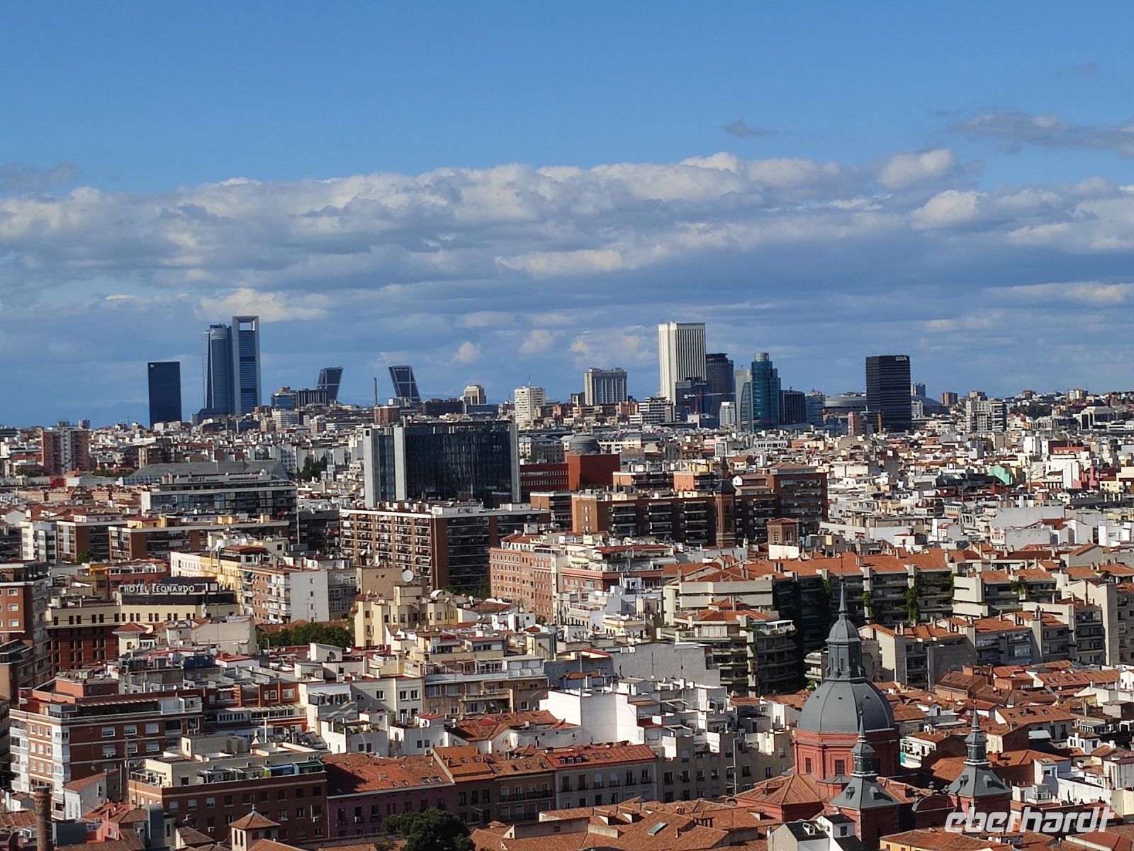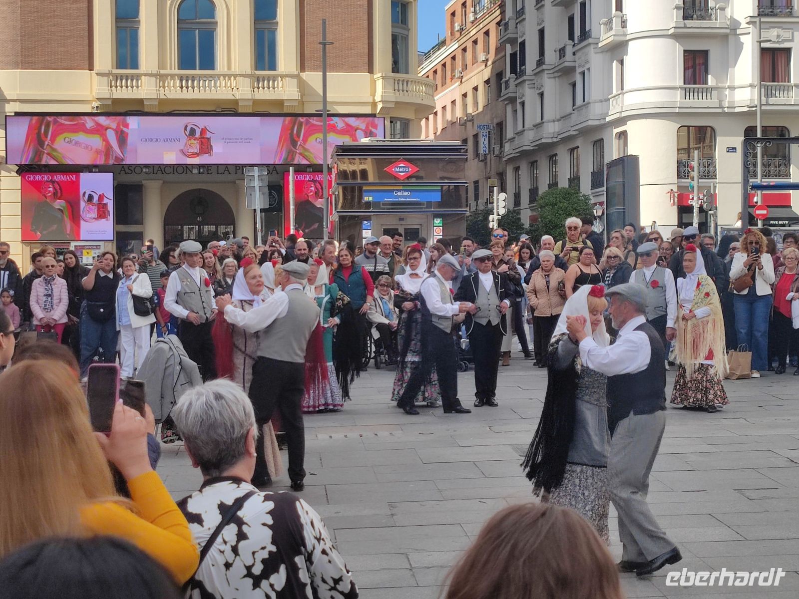 An unserem Anreisetag starteten wir von verschiedenen deutschen Flughäfen nach Madrid und wurden am Flughafen Madrid-Barajas von einem örtlichen Transferunternehmen begrüßt und zu unserem Hotel „Eurostars Casa de la Lírica 4*“ gebracht. Am Nachmittag verabredeten wir uns zu einem ersten gemeinsamen Stadtspaziergang. Wir gingen zum Platz „Puerta del Sol“ und danach entlang der Boulevardstraße „Gran Via“ zum Hotel Riu. Mit dem Fahrstuhl ging es dann hinauf in die 27.Etage zum rooftop, einer Bar mit fantastischem Rundumblick auf Madrid und einer betretbaren gläsernen Bodenplatte für einen Blick in die Tiefe. Anschließend spazierten wir zum „Plaza de España“ und von dort entlang der „Gran Via“ zum Restaurant “La Pecera del Circulo“.