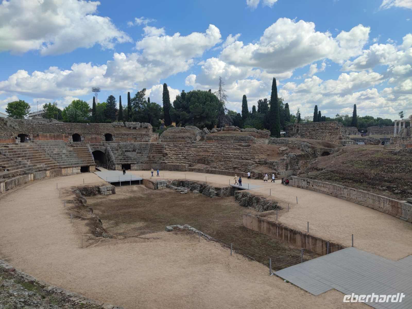 Nach dem Frühstück begaben wir uns auf die Weiterreise in Richtung Extremadura. Im kleinen Dorf „Pueblo de Don Rodrigo“ legten wir eine kleine Pause ein, bevor wir in Montanchez, einem Ort in der Extremadura, ankamen. Dort besuchten wir den Familienbetrieb „Jamones Casa Bautista“, der Schinken vom Iberico Schwein herstellt und uns auch zur Verkostung einlud. Im Anschluß besichtigten wir das Salzlager, wo dem Schinken die Flüssigkeit entzogen wird, sowie die Räumlichkeiten, in denen der Schinken bei konstanter Temperatur in der Luft trocknet. Von Montanchez fuhren wir zu unserem Hotel „Parador de Mérida“. Hier hatten wir nach dem Bezug der Zimmer Freizeit bis zum Beginn unserer Stadtbesichtigung. Unsere örtliche Reiseleiterin führte uns zum Tor des Trajan, zur Alcazaba, einer ehemaligen maurischen Festung am Rio Guadiana, und zum Tempel der Diana. Den Höhepunkt bildete der Besuch des Amphitheaters, einer gewaltigen gut erhaltenen Arena, in der die Gladiatorenkämpfe stattfanden. Gleich daneben befindet sich das ebenfalls gut erhaltene antike Theater Méridas, in dem auch heute noch Vorführungen stattfinden. Nach unserem gemeinsamen Stadtrundgang und der Freizeit trafen wir uns dann wieder zum gemeinsamen Abendessen im Parador.