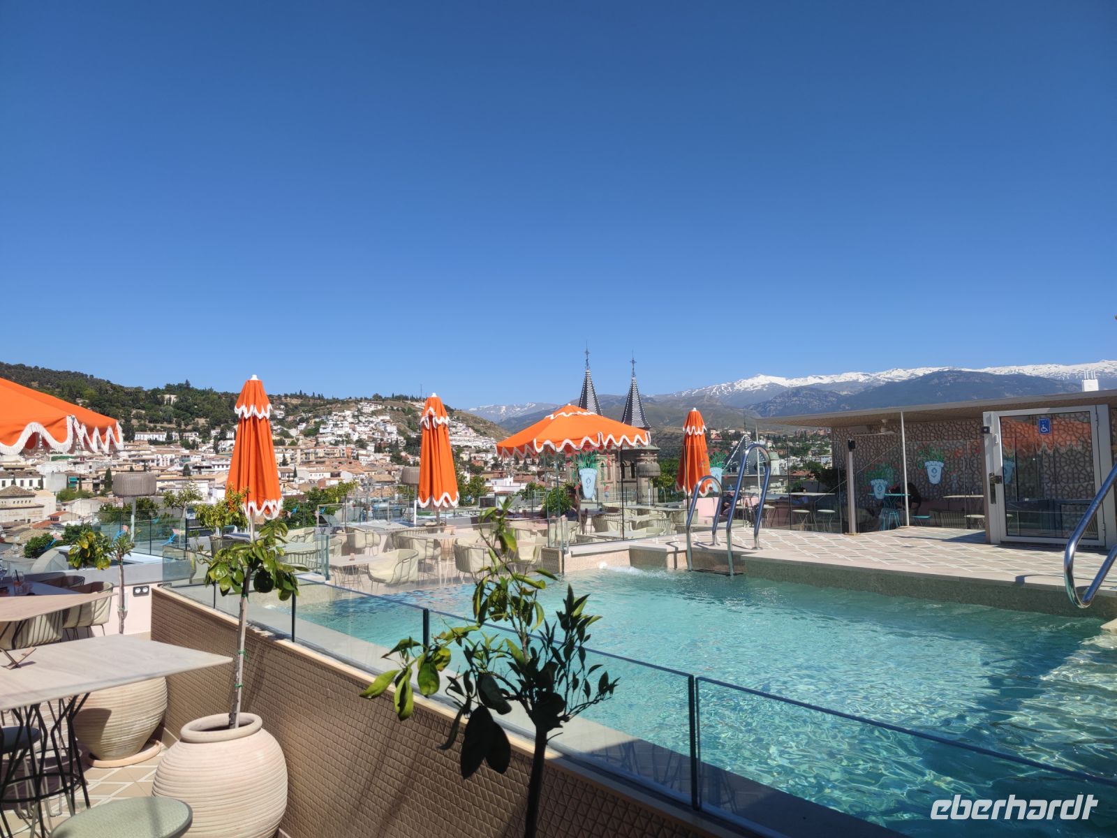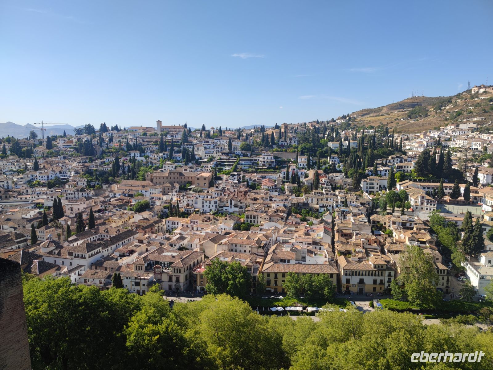 Von der Hacienda aus fuhren wir weiter in östliche Richtung und nach einer Mittagspause in der Nähe von Antequera erreichten wir am Nachmittag unser Hotel „Barceló Carmen Granada“ in Granada. Wir verabredeten uns zum gemeinsamen Spaziergang zum Plaza Nuevo und fuhren von dort mit dem kleinen Linienbus durch die engen Häusergassen des Albaicin-Viertels zum Aussichtspunkt „Mirador de San Nicholas“. Die Sonne stand genau richtig und wir hatten einen fantastischen Blick auf die gegenüberliegende Alhambra. Mit dem Linienbus ging es dann wieder hinunter bis zur Kathedrale und zu Fuss zum Abendessen in unser Hotel.