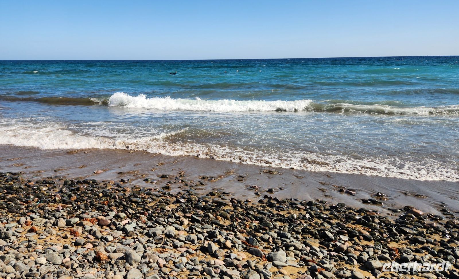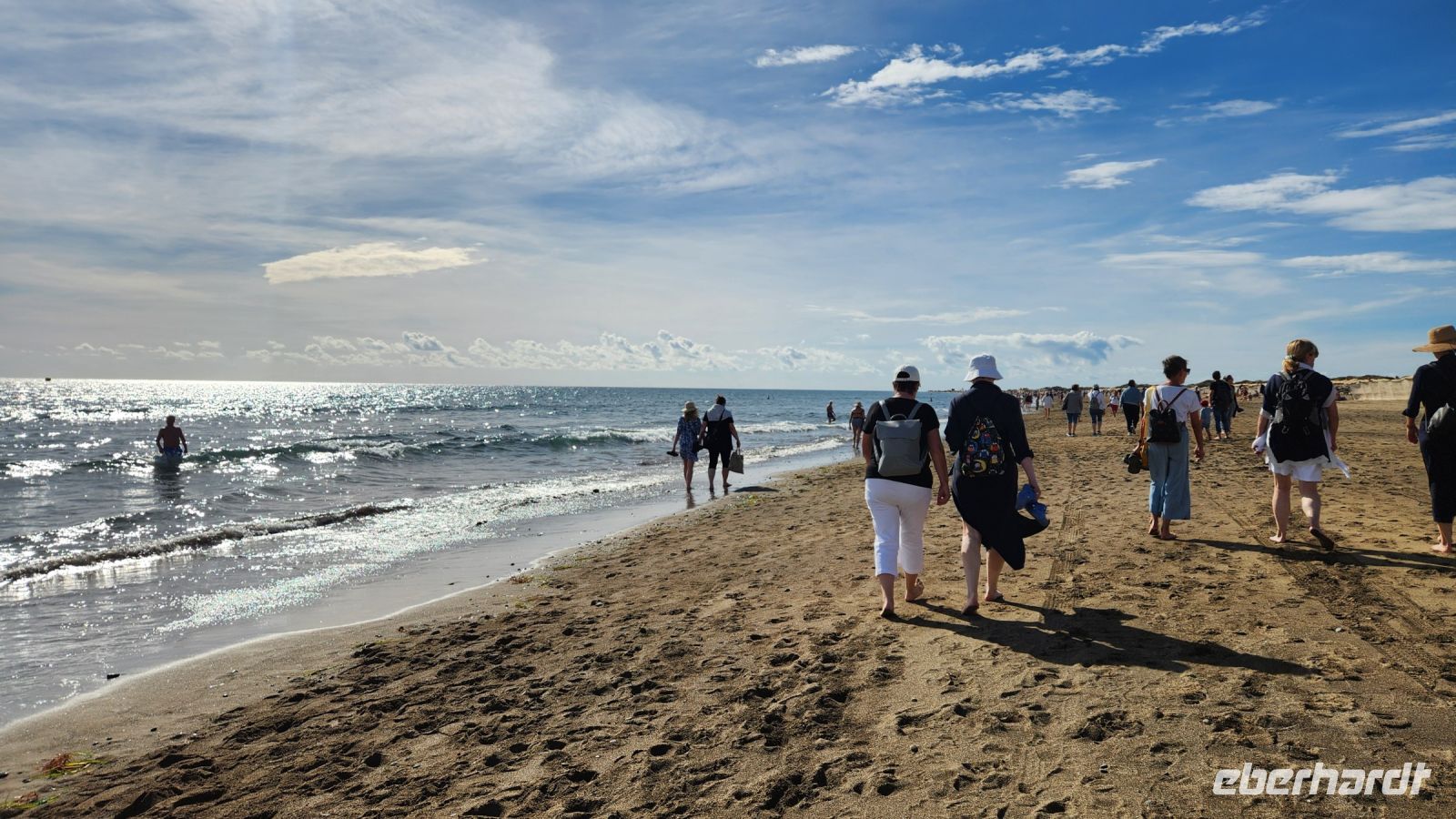 Nach einem kleinen Mittags-Imbiss laufen auch einige wieder am Strand zurück und gehen im Meer baden. Manche entscheiden sich für den Bus und legen sich noch an den Hotel-Pool.