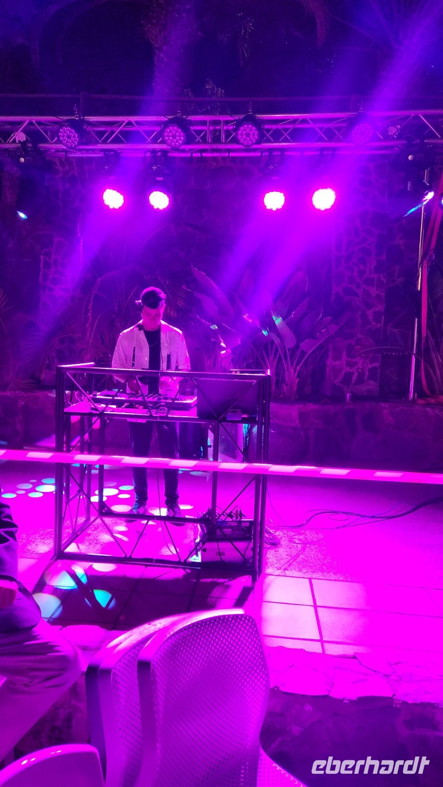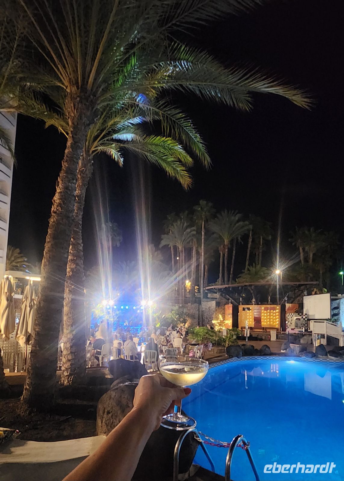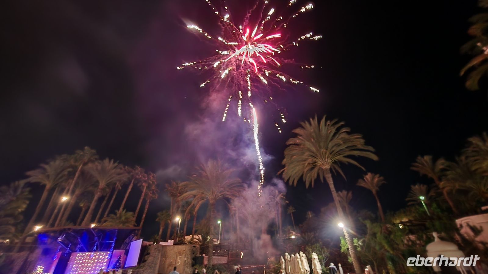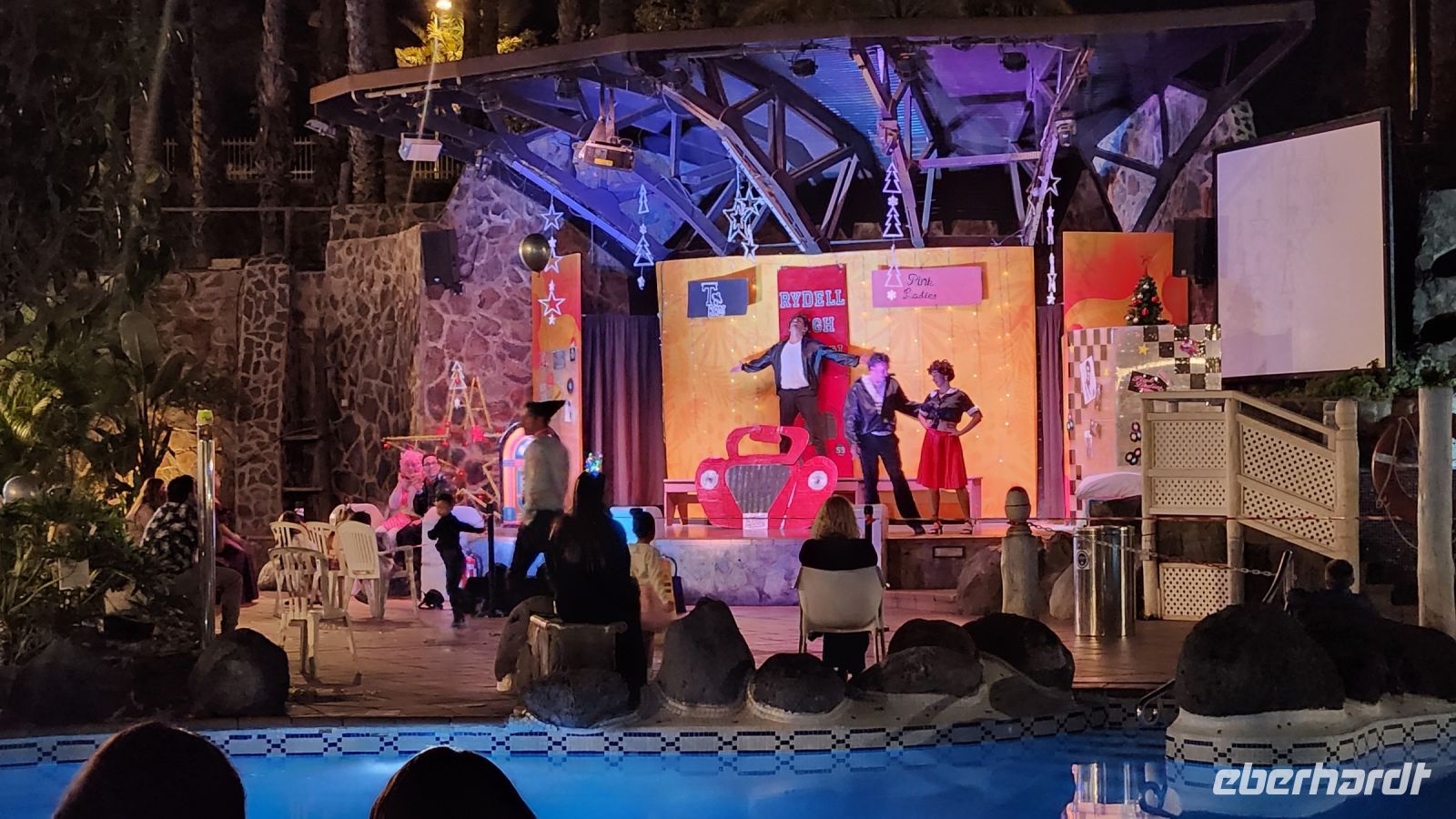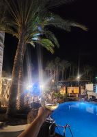 Unter Palmen finden wir direkt am Pool einen langen Tisch, an dem wir alle Platz finden. Die Animateure führen auf der Bühne das Musical "Grease" auf, anschließend legt ein DJ Musik auf. Es wird getanzt und Sekt getrunken. Um Mitternacht gibt es ein tolles Feuerwerk!