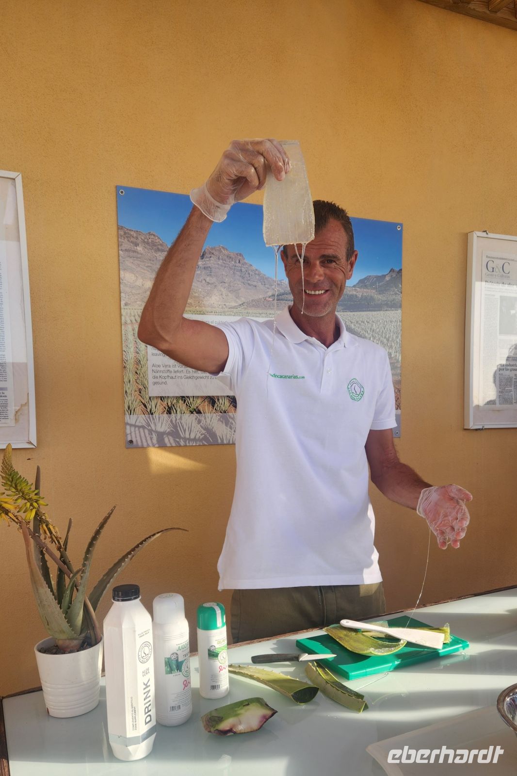 Am Morgen erwartet uns Bettina vor unserem Hotel, unsere örtliche Reiseleiterin. Unser erstes Ziel ist eine Aloe-Vera-Plantage. Diese Pflanze gedeiht im Klima der Kanaren ausgezeichnet. Wir besuchen eine Plantage und lernen viel Wissenswertes über dieses Heilpflanze. Michael, ein lustiger Holländer, erklärt uns alles ganz genau und kann uns auch viele Aloe Vera - Produkte empfehlen. Fast jeder erwirbt anschließend etwas, als Mitbringsel für die Lieben zu Hause oder auch, um sich selbst etwas Gutes zu tun.