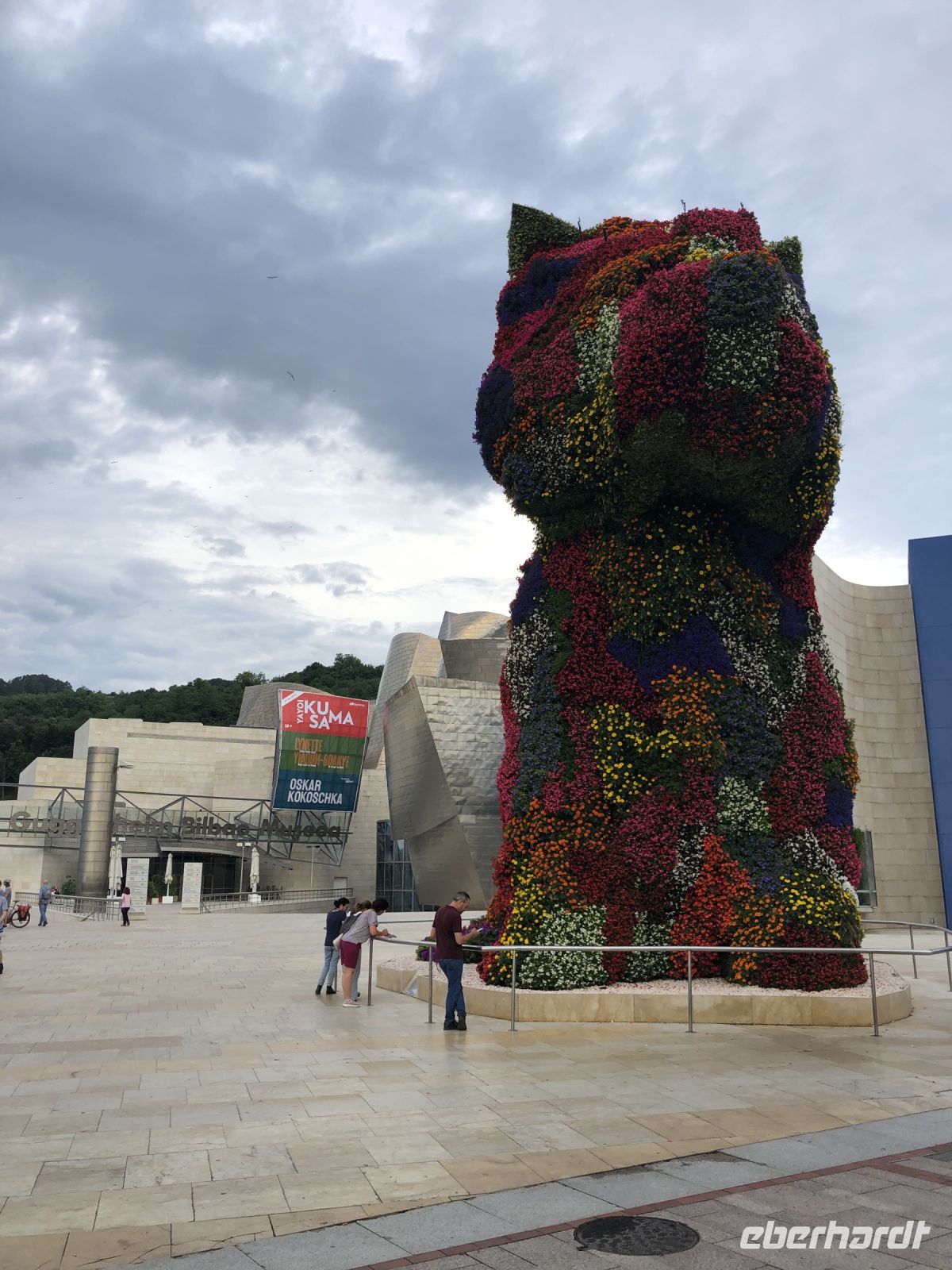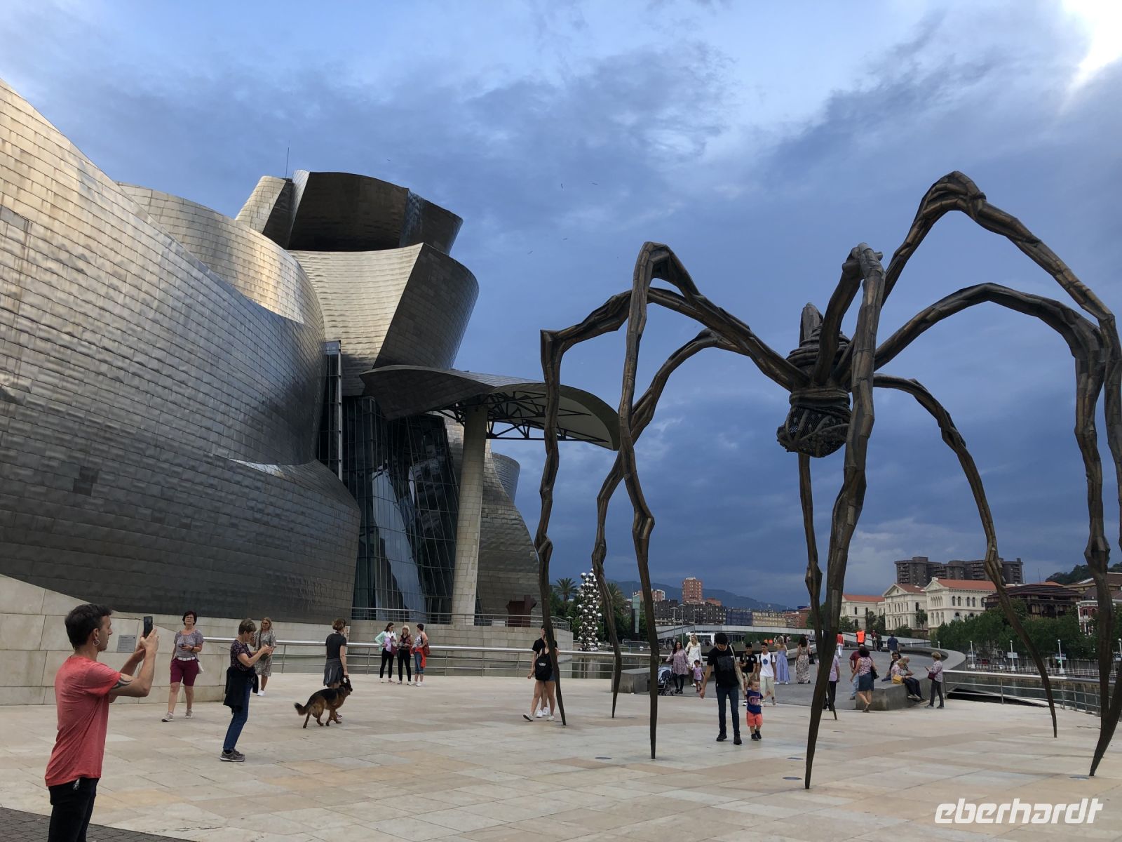 Über die La Salve Brücke schlenderten wir zuerst zum „kleinen“ Puppy, dem beliebten West-Highland-Terrier: Dieser von Jeff Koons geschaffene riesige blumenübersäte Hundewelpe aus (oder auf) einer Stahlkonstruktion wurde 1997 vom Guggenheim-Museums Bilbao erworben und erhielt rechtzeitig zur Eröffnung des Museums, einen festen Platz vor dem Museumsgebäude. Anschließend noch ein kleiner Rundgang rund um das spektakuläre Bauwerk bevor wir in Richtung Restaurant aufbrachen. Von unserem Ausgangspunkt aus gelangten wir über eine breite Treppe zum Nervión-Fluss, wo das Museum eigentlich steht. Frank Gehry, der Architekt, schuf ein wirklich spektakuläres Bauwerk, um das wir teilweise herumgingen, die Spinne „Maman“ von der Künstlerin Louise Bourgeois sowie die verschiedenen Perspektiven und Materialen bewundernd.