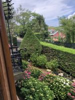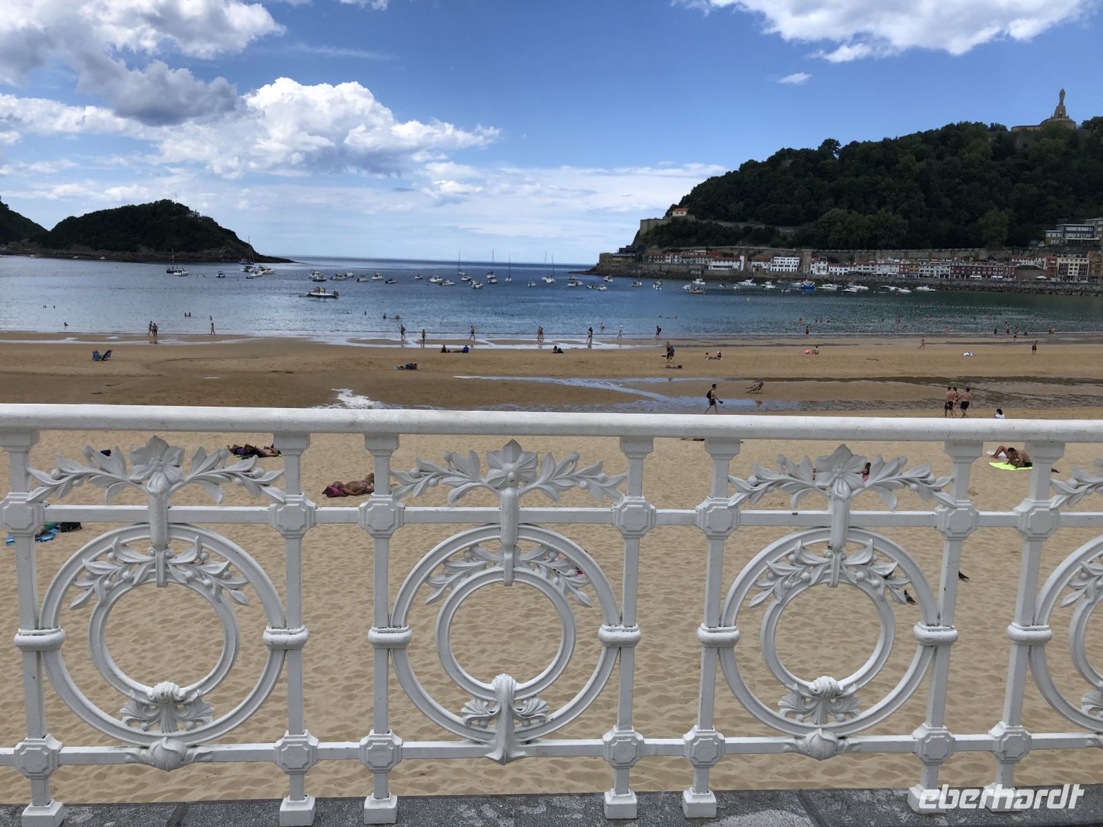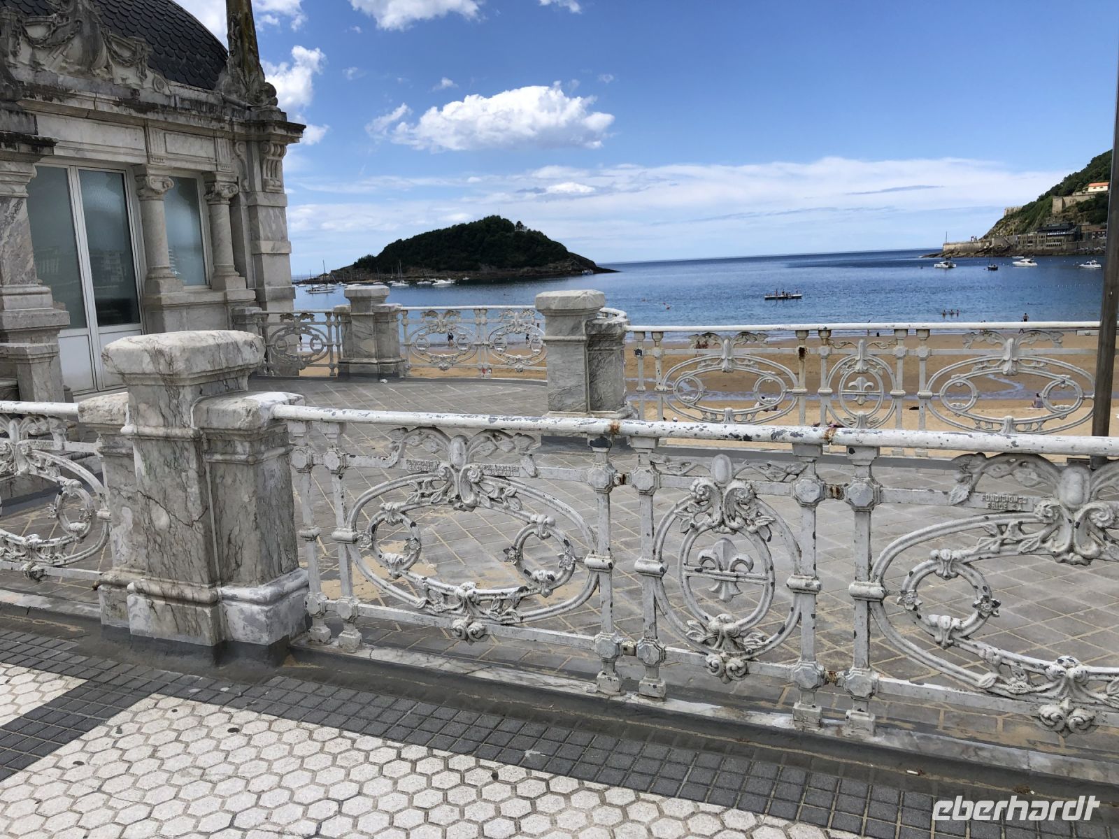 Danach rief jedoch endlich der schöne Stadtstrand San Sebastians, der „Playa de la Concha“ – der Strand der Muschel. Wir begannen unseren Spaziergang über die stattliche Uferpromenade. Am Casino und den Tamarix-Bäumen vorbei, liefen einige von uns lieber weiter am Strand mit den Füßen im Wasser, andere auf der Strandpromenade, immer an dem Geländer entlang, welches von König Alfonso XIII. 1916 höchstpersönlich eingeweiht und mit der Zeit zu einem typischen Symbol für die Stadt wurde. Danach erreichten wir den Palast von Miramar, den einstigen Sommersitz der habsburgischen Königin Maria Christina. Der Miramar-Palast wurde 1893 auf Wunsch von Königin Maria Christina von Österreich errichtet, die ihre Sommerferien in San Sebastian verbrachte. Nachdem sie andere Orte wie den Monte Urgull oder Aiete in Betracht gezogen hatte, entschied sich die Königin für diesen Ort. Der Palast erinnerte uns wohl an englische Landhäuser, wurde auch von dem englischen Architekten, Selden Womun entworfen und war jahrelang die Sommerresidenz des spanischen Königshauses. Da es seit 1973 der Stadt gehört, können auch wir den Ausblick auf die Bucht und die Insel Santa Clara von hier genießen.