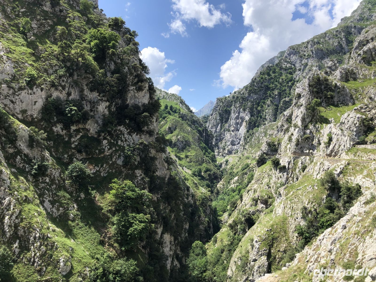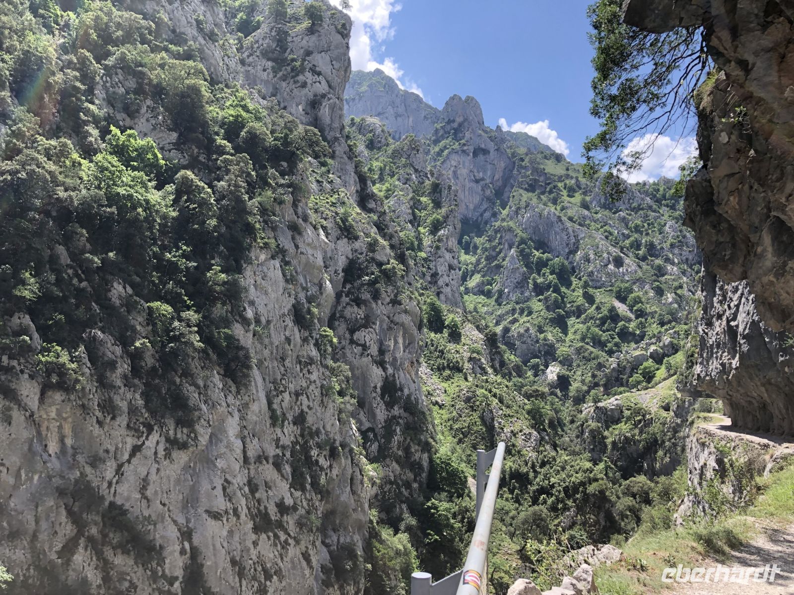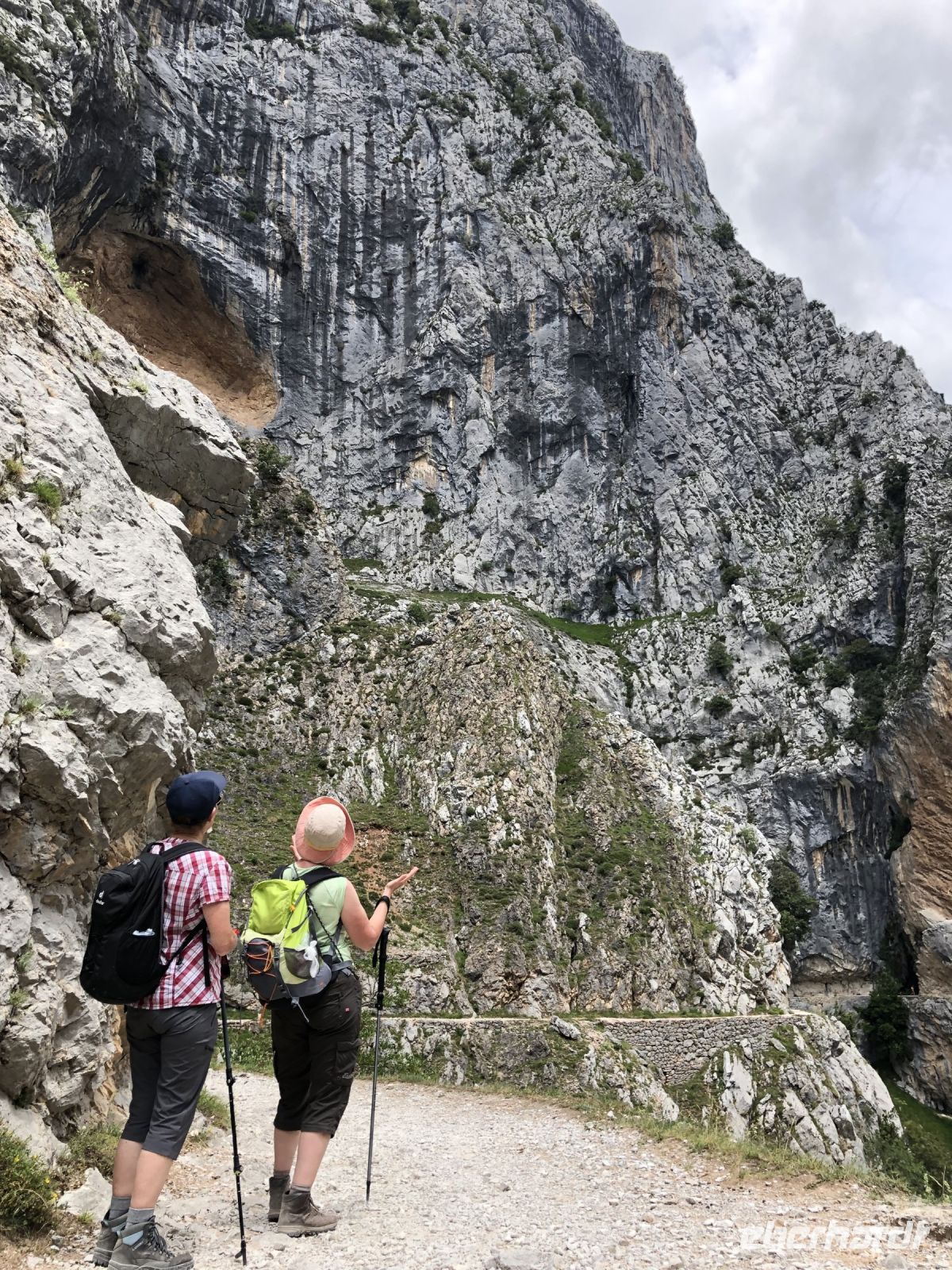 Immer an einem Wasserkanal entlang wanderten wir den kurvenreichen, aber jetzt flachen Weg durch die Schlucht von Cares, oftmals den Abgrund neben uns und mit Blick auf schroffe Bergformationen gerichtet, staunten wir über die hoch aufragenden Berge und das tief unter uns liegende Tal, durch das sich der Fluss Cares schlängelt. Ab und an begegneten uns ein paar Bergziegen, die mit ihren Kletterkünsten beeindruckten.
