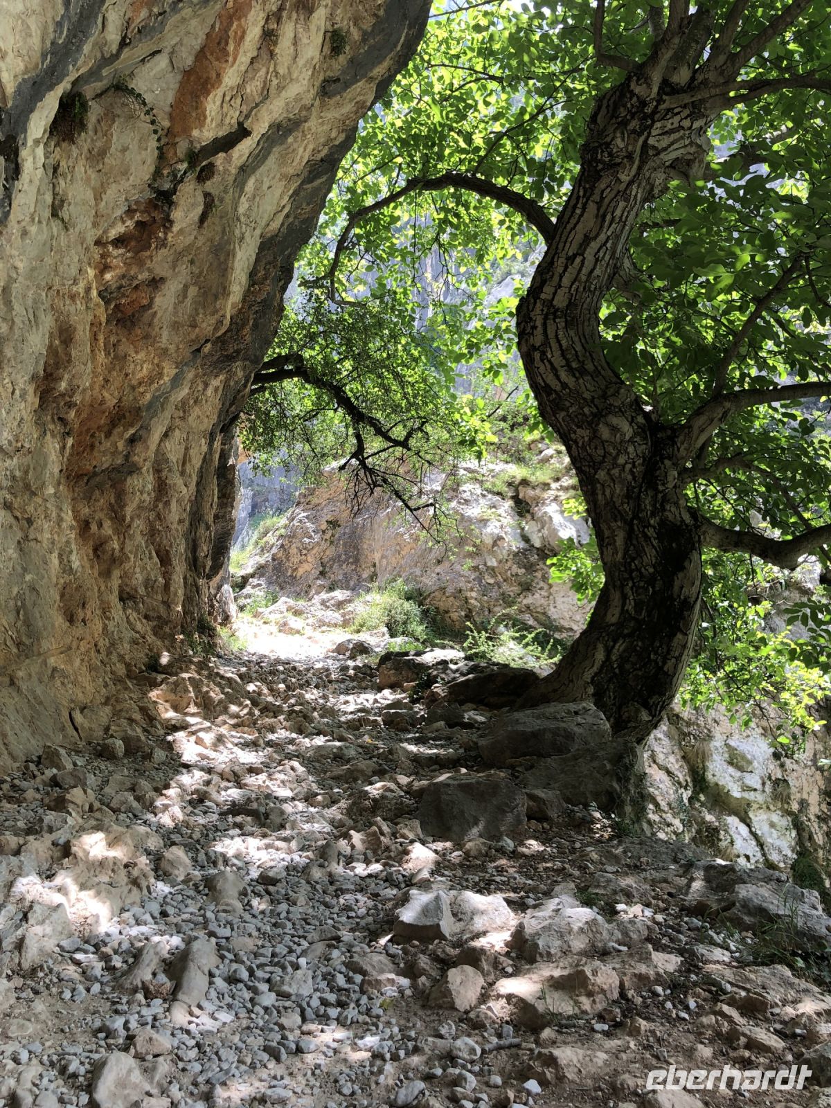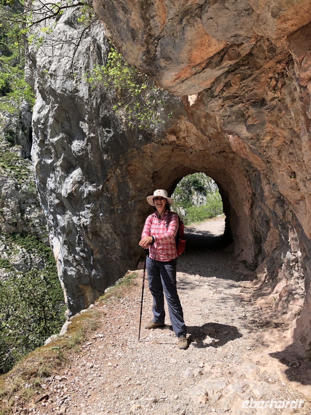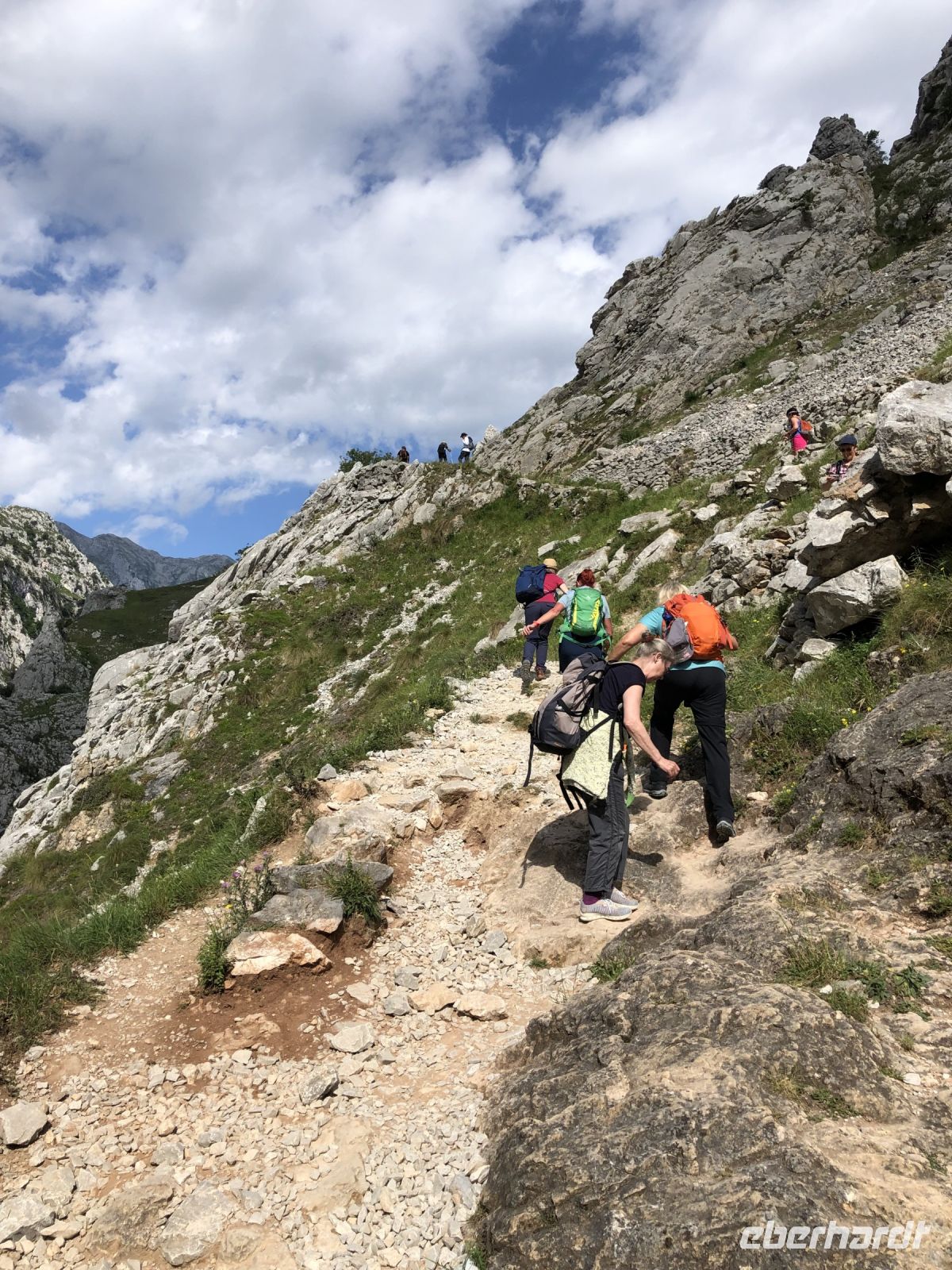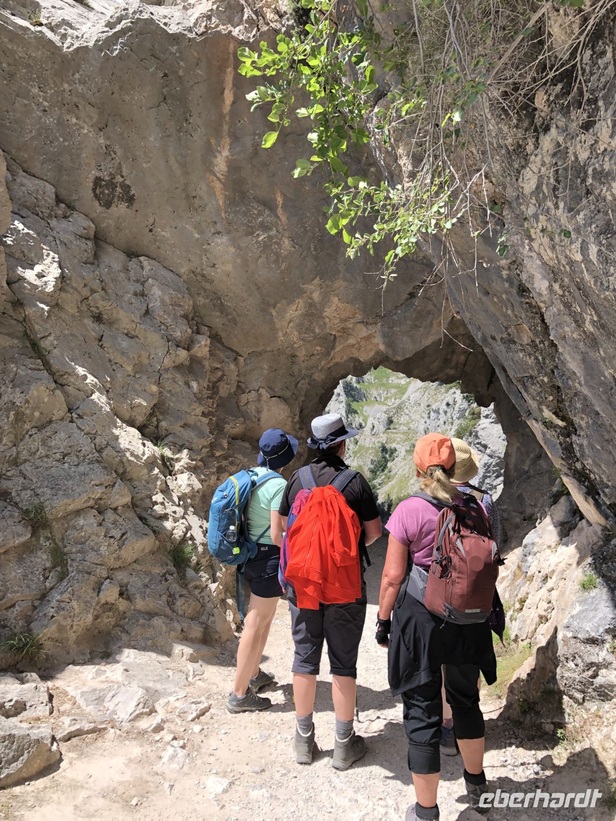 Immer an einem Wasserkanal entlang wanderten wir den kurvenreichen, aber jetzt flachen Weg durch die Schlucht von Cares, oftmals den Abgrund neben uns und mit Blick auf schroffe Bergformationen gerichtet, staunten wir über die hoch aufragenden Berge und das tief unter uns liegende Tal, durch das sich der Fluss Cares schlängelt. Ab und an begegneten uns ein paar Bergziegen, die mit ihren Kletterkünsten beeindruckten.