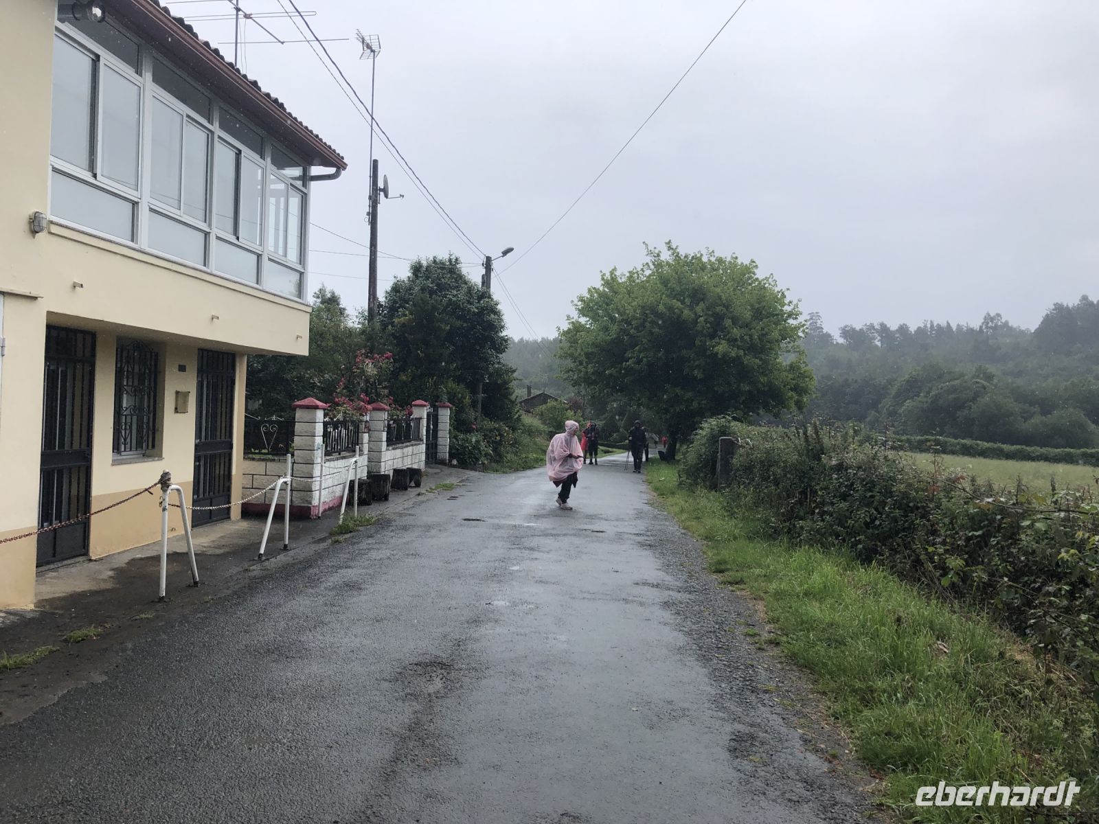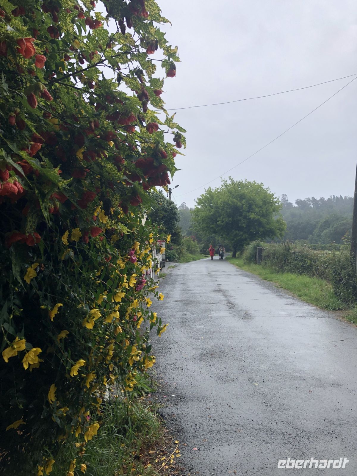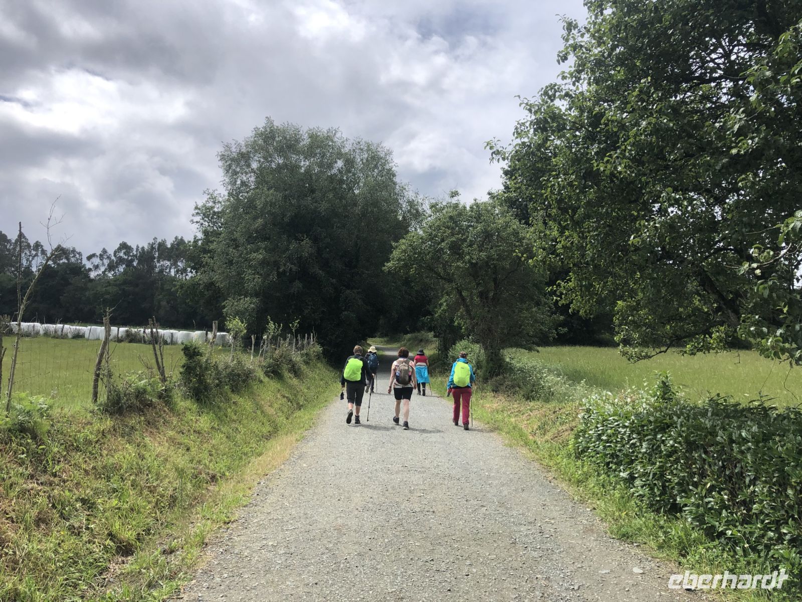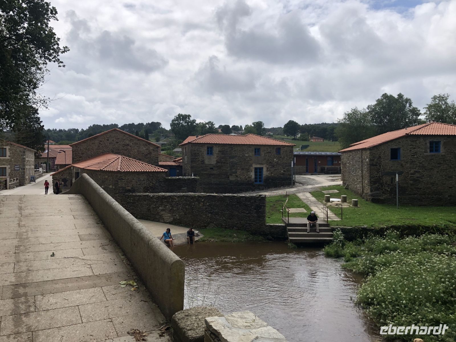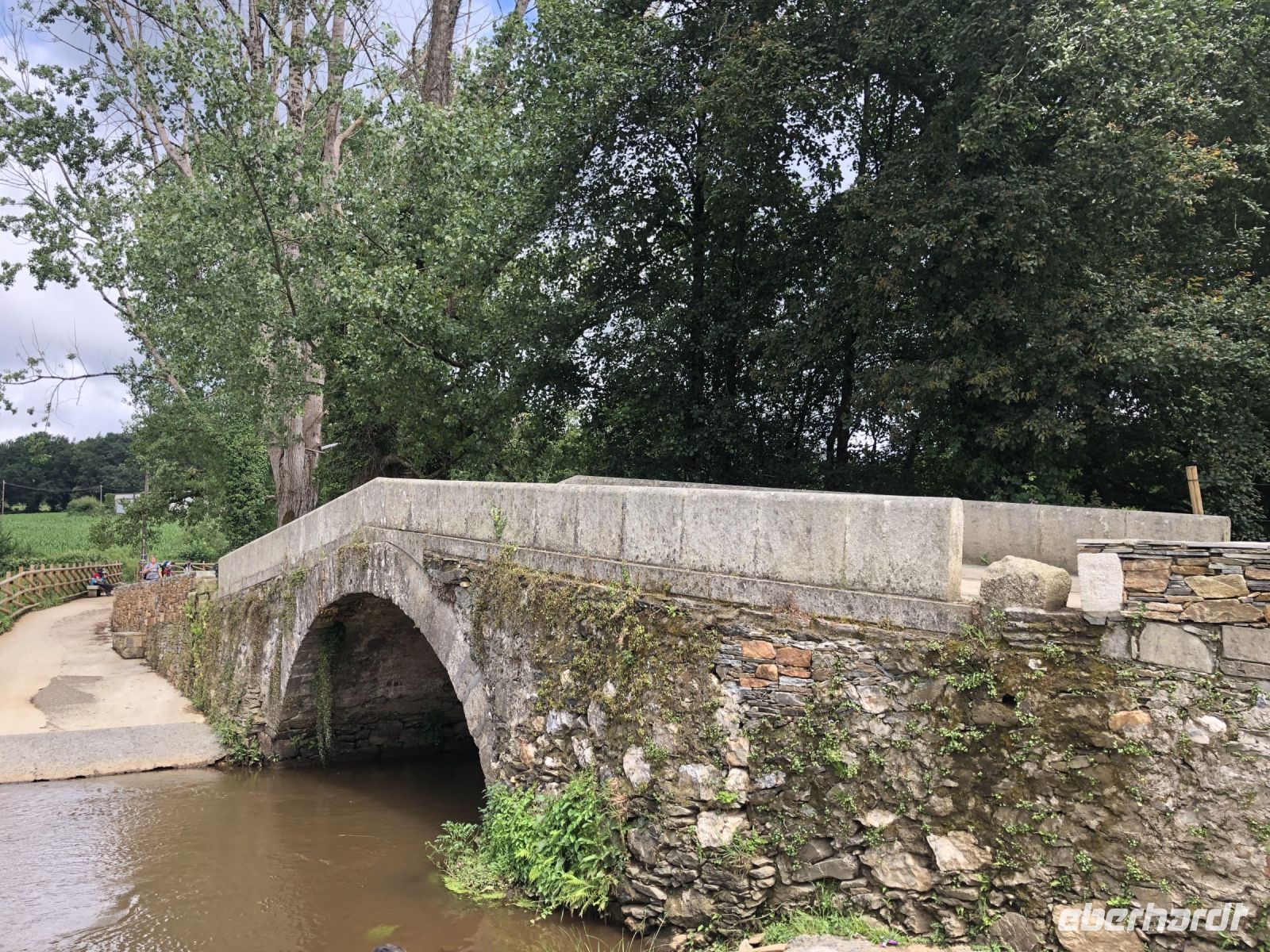 Weitere 14 km wollten von uns gegangen werden. Über römische Brücken, durch schattige Wälder, an Flüsschen entlang, spürte so Mancher den Charme des Pilgerns. Das Wetter zeigte ebenfalls die Vielseitigkeit des Pilgerlebens: Regenponcho an, Stöcke raus, Poncho wegpacken, Sonnenhut aufsetzen, Regenschirm aufspannen und gleich als Sonnenschirm weiternutzen. Die tolle Eberhardt-Wandergruppe, die sich hier gefunden hatte, nahm das alles mit Humor. Und sie gab heute jedem den Freiraum, auch einige Kilometer allein zu laufen, in sich zu gehen und nachzudenken, um sich dann im Ort Boente an der Brücke, die den Fluss Iso überspannt oder erst in Arzúa wiederzutreffen.