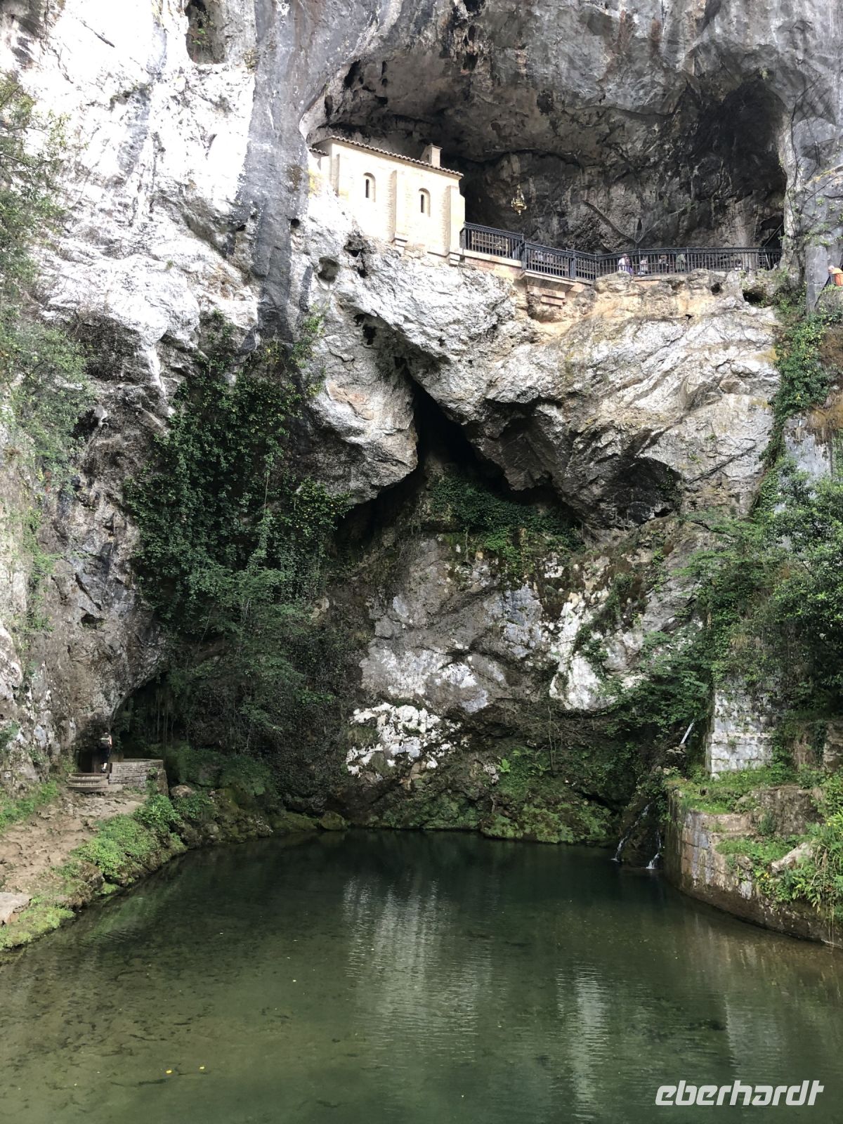 Wieder zurück im Ort Covadonga statteten wir der Heiligen Höhle – La Santa Cueva eine Besuch ab. Genau darunter befindet sich ein kleiner Teich in den sich nach starken Regenfällen ein Wasserfall ergießt. Leider war in diesen Tagen kein Regen in Sicht gewesen. Auch soll hier eine Quelle entspringen, der Wunderkräfte zugesprochen werden, die sich in einen kleinen Brunnen daneben ergießt. Demjenigen der das Wasser trinkt, verheißt es im kommenden Jahr die Heirat. Es wurde nun mehr oder weniger intensiv darüber nachgedacht, ob das im Sinne der teilnehmende Gäste läge. Manche liefen lieber schnell daran vorbei ;-). Da erschien es sicherer einen Fuß in die Basilika von Covadonga zu setzen oder die Zeit für eine kleine Mittags-/Kaffeepause zu nutzen.