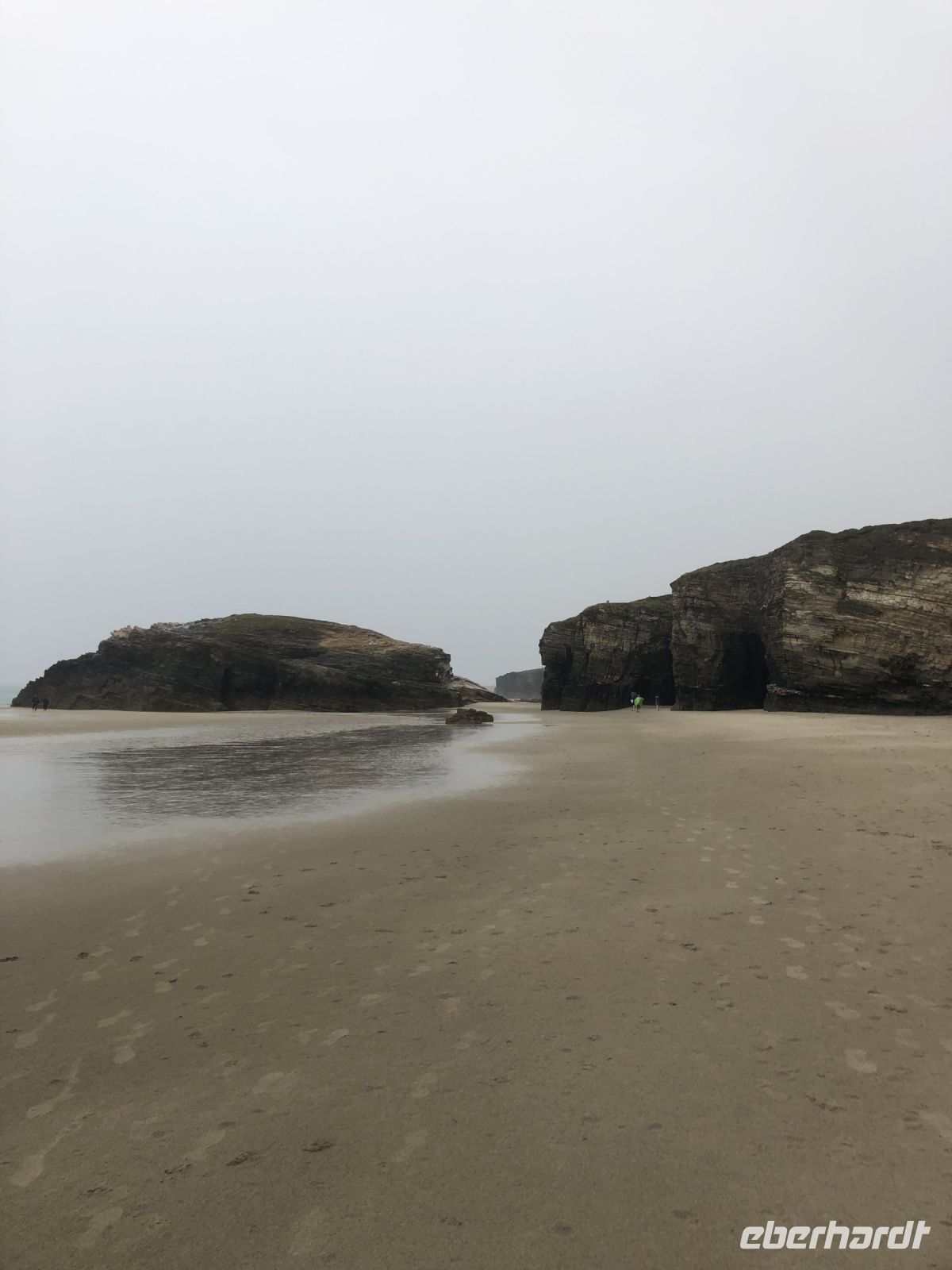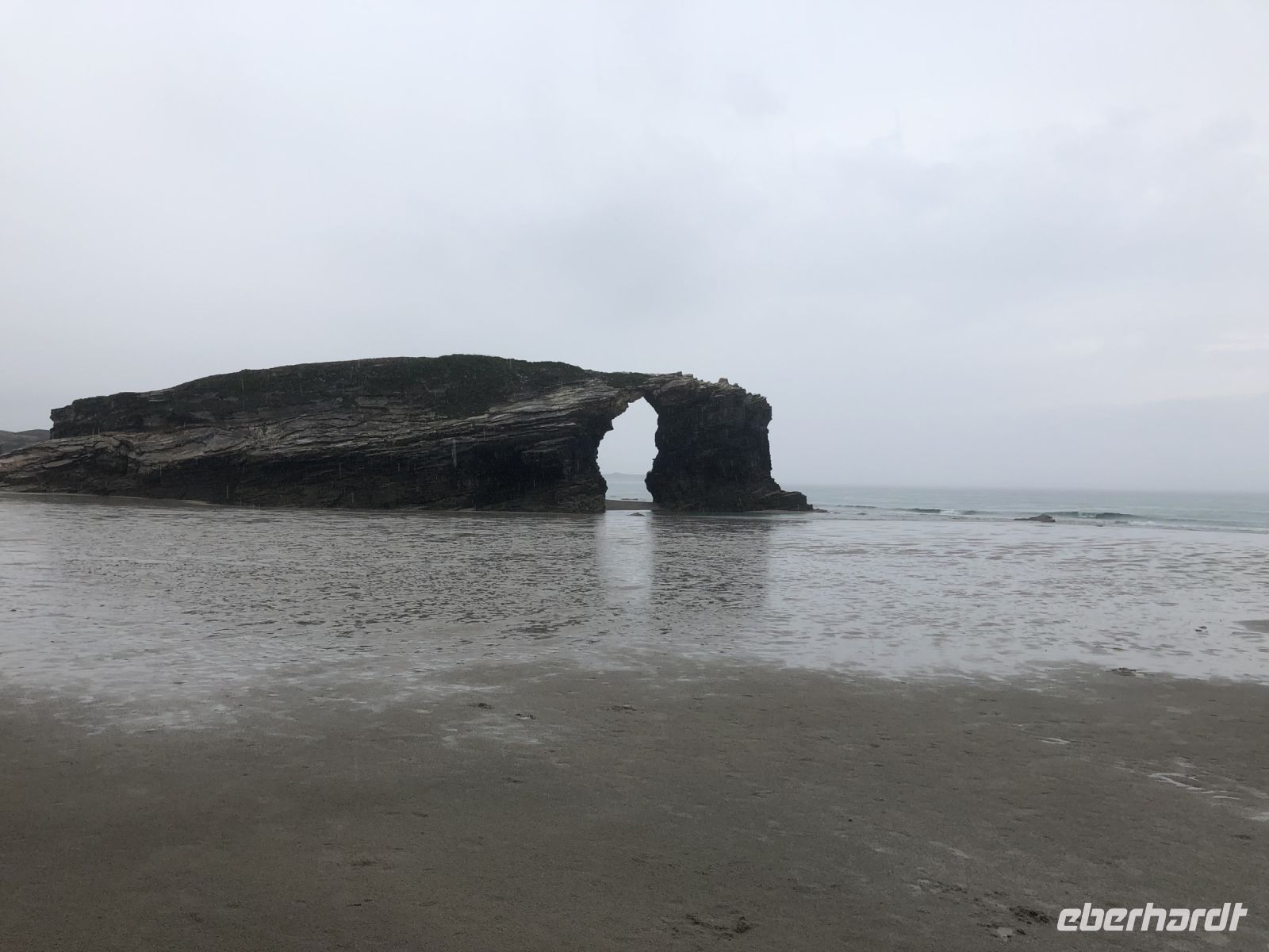 Die Praia das Catedrais; was für ein Strand! Nein, ein Naturdenkmal mit übernatürlichen Dimensionen. Nur gerade jetzt öffnete der Himmel seine Schleusen und sorgte dafür das wir von allen Seiten das Element Wasser erfahren durften. Viele zogen einfach die Schuhe aus, spürten den Sand zwischen den Zehen, kletterten über kleine Felsformationen und zwei Mutige trauten sich sogar, in die Fluten zu springen. Juch-he! Vor uns tauchten 30 Meter hohe Pfeiler auf, Meereshöhlen luden den Abenteurer zu Entdeckungen ein. Für eine Weile befanden wir uns in einer Kathedrale des Ozeans.