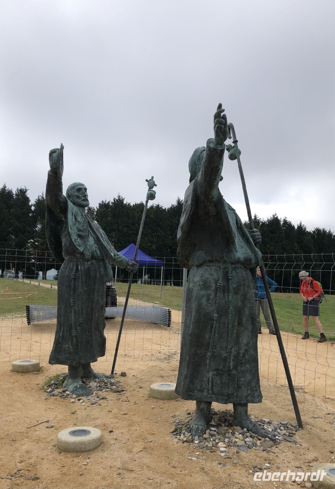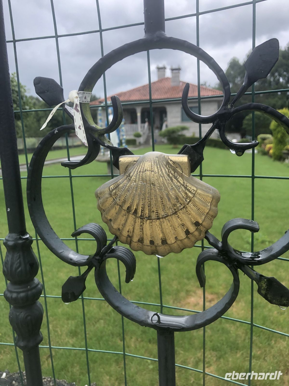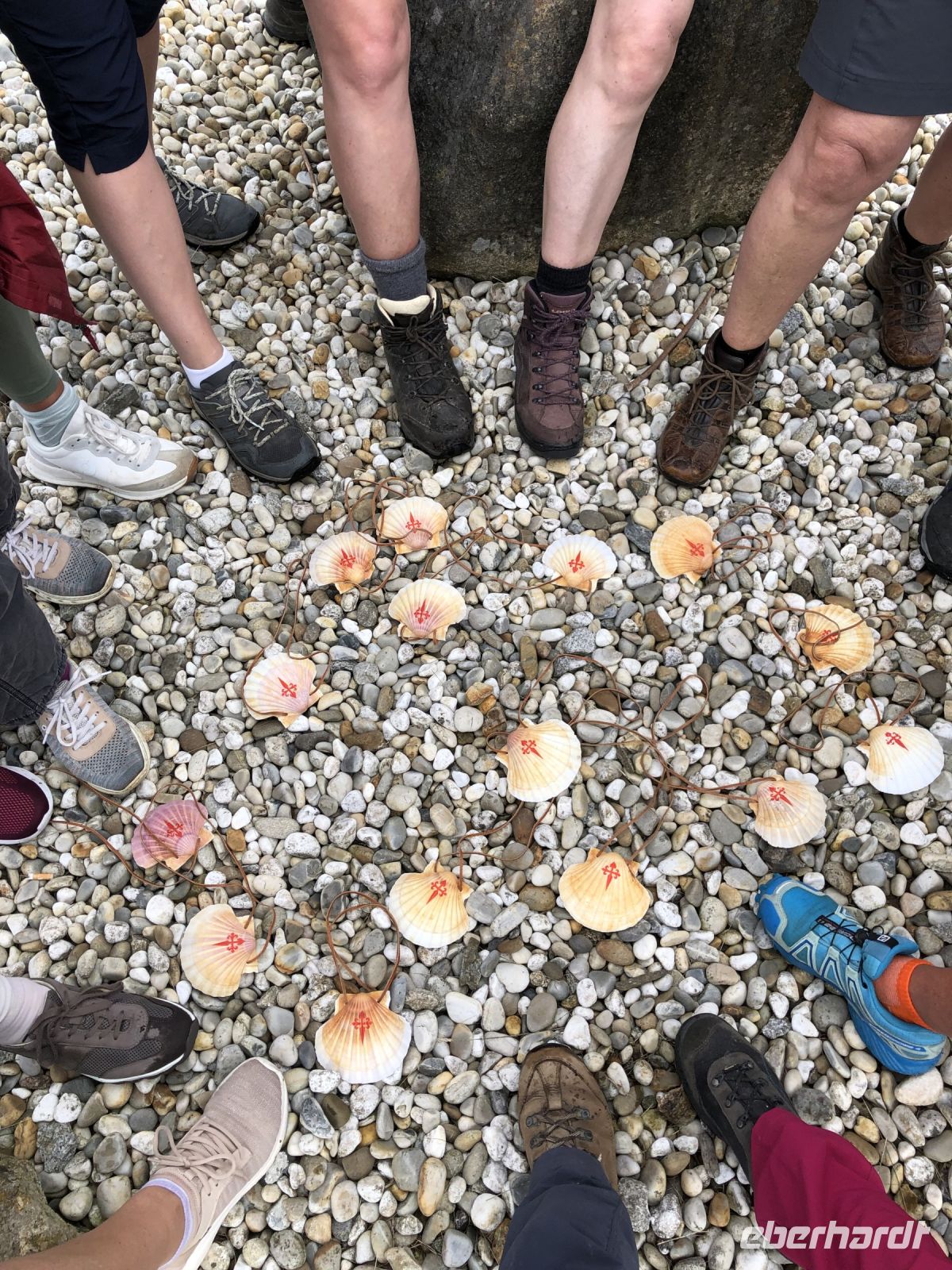Dem Körper gönnten wir auch heut keine Pause. Wieder mit den Wanderschuhen ausgerüstet, fuhren wir bis zum Campingplatz in San Marco einige Kilometer vor dem Berg der Freude, dem Monte do Gozo von wo wir die letzte, jedoch kurze Etappe nach Santiago de Compostela laufen wollten. Nur der Berg der Freude rüstete sich an diesem Tag für andere Freuden. Ein Musikfestival wurde vorbereitet, alles zugestellt mit Gerüsten, Containern und mietbaren Zelten. Selbst das Monument des Pilgers blieb nicht verschont und wurde eingerüstet. Einen kurzen Moment verharrten die Arbeiter, gaben uns einen Augenblick, um zu fotografiern und schon verschwand alles hinter Bauzäunen. Wir zogen uns an einen ruhigen Ort zurück, und Sabine zauberte Jakobsmuscheln aus ihrem Rucksack, die ein jeder als Zeichen des Pilgers erhielt. Mit Gesang und unserem Innehalten schien die Zeit für einen Moment still zu stehen.